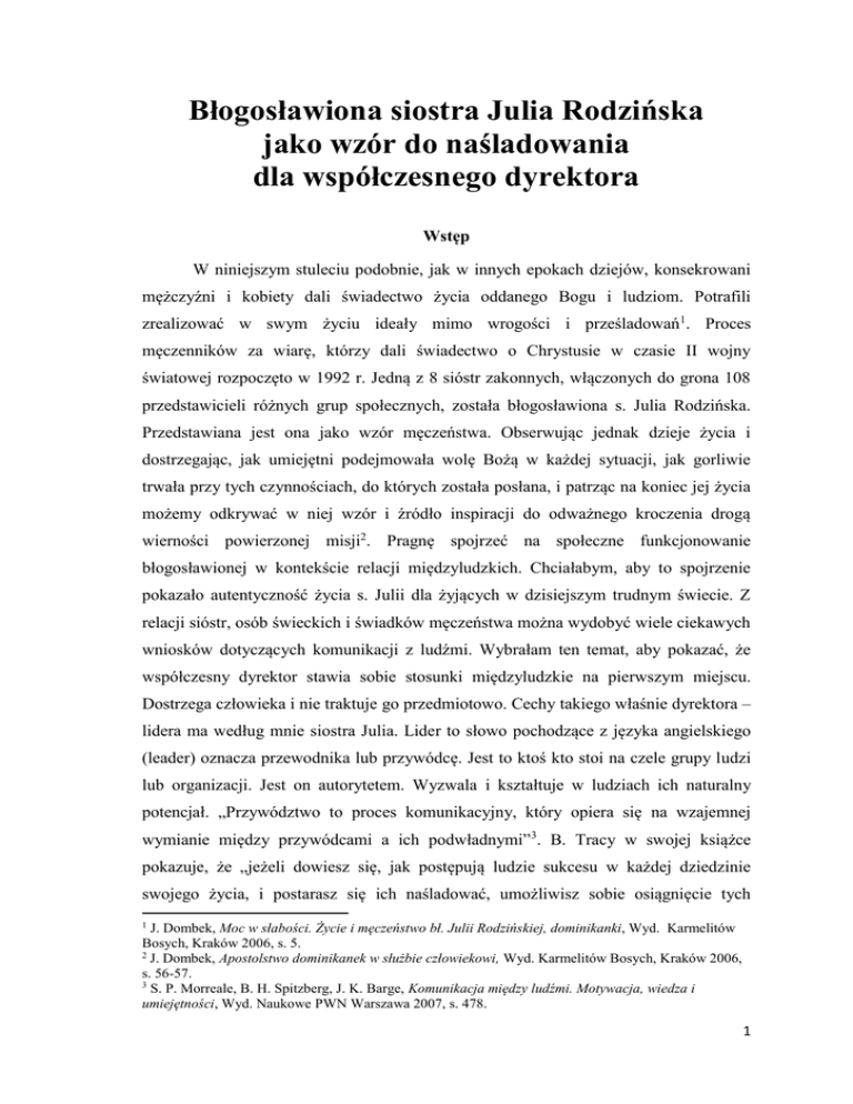 Błogosławiona siostra Julia Rodzińska jako wzór do naśladowania dla współczesnego dyrektora Wstęp W niniejszym stuleciu podobnie, jak w innych epokach dziejów, konsekrowani mężczyźni i kobiety dali świadectwo życia oddanego Bogu i ludziom. Potrafili zrealizować w swym życiu ideały mimo wrogości i prześladowań1. Proces męczenników za wiarę, którzy dali świadectwo o Chrystusie w czasie II wojny światowej rozpoczęto w 1992 r. Jedną z 8 sióstr zakonnych, włączonych do grona 108 przedstawicieli różnych grup społecznych, została błogosławiona s. Julia Rodzińska. Przedstawiana jest ona jako wzór męczeństwa. Obserwując jednak dzieje życia i dostrzegając, jak umiejętni podejmowała wolę Bożą w każdej sytuacji, jak gorliwie trwała przy tych czynnościach, do których została posłana, i patrząc na koniec jej życia możemy odkrywać w niej wzór i źródło inspiracji do odważnego kroczenia drogą wierności powierzonej misji2. Pragnę spojrzeć na społeczne funkcjonowanie błogosławionej w kontekście relacji międzyludzkich. Chciałabym, aby to spojrzenie pokazało autentyczność życia s. Julii dla żyjących w dzisiejszym trudnym świecie. Z relacji sióstr, osób świeckich i świadków męczeństwa można wydobyć wiele ciekawych wniosków dotyczących komunikacji z ludźmi. Wybrałam ten temat, aby pokazać, że współczesny dyrektor stawia sobie stosunki międzyludzkie na pierwszym miejscu. Dostrzega człowieka i nie traktuje go przedmiotowo. Cechy takiego właśnie dyrektora – lidera ma według mnie siostra Julia. Lider to słowo pochodzące z języka angielskiego (leader) oznacza przewodnika lub przywódcę. Jest to ktoś kto stoi na czele grupy ludzi lub organizacji. Jest on autorytetem. Wyzwala i kształtuje w ludziach ich naturalny potencjał. „Przywództwo to proces komunikacyjny, który opiera się na wzajemnej wymianie między przywódcami a ich podwładnymi”3. B. Tracy w swojej książce pokazuje, że „jeżeli dowiesz się, jak postępują ludzie sukcesu w każdej dziedzinie swojego życia, i postarasz się ich naśladować, umożliwisz sobie osiągnięcie tych J. Dombek, Moc w słabości. Życie i męczeństwo bł. Julii Rodzińskiej, dominikanki, Wyd. Karmelitów Bosych, Kraków 2006, s. 5. 2 J. Dombek, Apostolstwo dominikanek w służbie człowiekowi, Wyd. Karmelitów Bosych, Kraków 2006, s. 56-57. 3 S. P. Morreale, B. H. Spitzberg, J. K. Barge, Komunikacja między ludźmi. Motywacja, wiedza i umiejętności, Wyd. Naukowe PWN Warszawa 2007, s. 478. 1 1 samych celów”4. Mam nadzieję, że postać s. Julii stanie się bardziej znana. W świecie, który potrzebuje autorytetów jest ona drogowskazem, który słowem i przykładem wskazuje właściwy kierunek. Rys życia błogosławionej Siostry Julii Rodzińskiej Dzieciństwo Stanisławy Rodzińskiej, klimat panujący w domu rodzinnym oraz atmosfera od początku kształtowały jej osobowość. Duchowość i działalność s. Julii, jako nauczycielki posiadającej charyzmę pedagogiczną możemy dostrzec w całym życiu zakonnym i podczas pobytu w obozie. Dzieciństwo i młodość - wychowanie Stanisława Rodzińska urodziła się 16.03.1899 r. w Nawojowej k. Nowego Sącza jako drugie z pięciorga dzieci organisty Michała Rodzińskiego i Marii Sekuła. Maria wychowywała religijnie dzieci, ucząc prawd wiary i przepajając ich serca dobrocią i miłością. Ojciec stawiał dzieciom surowe wymagania i kontrolował spełnianie poleceń. Podchodził do nich z wielką troską i czułością. Dzieci wzrastały w atmosferze miłości i szacunku. W wieku dziesięciu lat przez śmierć rodziców została całkowicie osierocona. Znalazła dom rodzinny w klasztorze Dominikanek. Przełożoną sióstr była wówczas s. Stanisława Leniart, którą jako sierotę, przygarnęły i wychowały siostry. Osobowość przełożonej pedagoga radykalnie żyjącej Ewangelią, była wzorem dla młodej wychowanki. Stanisława ukończyła szkołę ludową u sióstr. Rozpoczęła lekcje gry na fortepianie, skrzypcach, haftu i prowadzenia gospodarstwa domowego. Została wysłana przez siostry do Seminarium Nauczycielskiego. Kochała dzieci dlatego pragnęła zostać nauczycielką. Ślady pozostawione z życia w Nawojowej pokazują człowieka z pasją, który pragnie się wiele nauczyć, by profesjonalnie służyć innym. Charyzmat i działalność apostolska s. Julii w życiu zakonnym Zgromadzenie Sióstr św. Dominika powstało w 1981 r. w Wielowsi k. Tarnobrzega. Duchowość błogosławionej kształtowała się więc środowisku pierwszych dominikanek. Siostry Dominikanki zajmowały się katechizacją ludu wiejskiego, podnoszeniem oświaty środowiska i opieką nad chorymi w domach. W 1916 r. Stanisława wstąpiła do Zgromadzenia sióstr. W 1918r. złożyła pierwszą profesję zakonną i otrzymała imię s. Julia. Ukończyła Seminarium Nauczycielskie w Krakowie i B. Tracy, Osobowość Lidera, Wyd. Emka 2001, s. 14. 4 2 otrzymała świadectwo maturalne. Praca apostolska błogosławionej była ściśle związana z działalnością wychowawczą wśród dzieci, szczególnie sierot. Pracowała w Mielżynie k. Gniezna w szkole. W 1921 r. była nauczycielką w Rawie Ruskiej, gdzie uczyły się dzieci różnych wyznań (prawosławni Rusini, Żydzi, grekokatolicy) i w Szkole Podstawowej w Wilnie. W latach 1925-26 ukończyła Wyższy Kurs Nauczycielski. Objęła kierownictwo w Podstawowej Szkole Państwowej im. Matki Bożej Ostrobramskiej. Dwukrotnie została wybrana na delegatkę na kapitułę generalną pełniąc urząd sekretarki. Cieszyła się w Zgromadzeniu szacunkiem i zaufaniem. W 1934 r. mianowano ją przełożoną domu w Wilnie i kierowniczką Zakładu dla Sierot. Jako kierowniczka starała się, by dzieci nie odróżniały się zewnętrznym ubraniem od swych rówieśników z pełnych rodzin. Za wzorowe prowadzenie sierocińca otrzymała nagrodę od wojewody wileńskiego, którą przeznacz