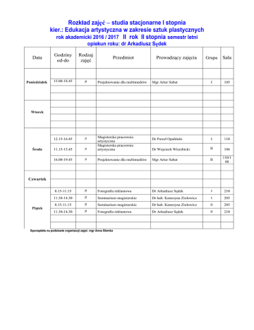Rozkład zajęć – studia stacjonarne I stopnia kier.: Edukacja artystyczna w zakresie sztuk plastycznych rok akademicki 2016 / 2017 II rok II stopnia semestr letni opiekun roku: dr Arkadiusz Sędek Data Godziny od-do Rodzaj zajęć Przedmiot Poniedziałek 15.00-18.45 p Projektowanie dla multimediów 12.15-16.45 p 11.15-15.45 p Magisterska pracownia artystyczna Magisterska pracownia artystyczna 16.00-19.45 p 8.15-11.15 Prowadzący zajęcia Grupa Sala Mgr Artur Sabat I 105 Dr Paweł Opaliński I 110 Dr Wojciech Wierzbicki II 106 Projektowanie dla multimediów Mgr Artur Sabat II 110/1 08 p Fotografia reklamowa Dr Arkadiusz Sędek I 210 11.30-14.30 p Seminarium magisterskie Dr hab. Katarzyna Ziołowicz I 205 8.15-11.15 p Seminarium magisterskie Dr hab. Katarzyna Ziołowicz II 205 11.30-14.30 p Fotografia reklamowa Dr Arkadiusz Sędek II 210 Wtorek Środa Czwartek Piątek Sporządziła na podstawie organizacji zajęć: mgr Anna Słomka