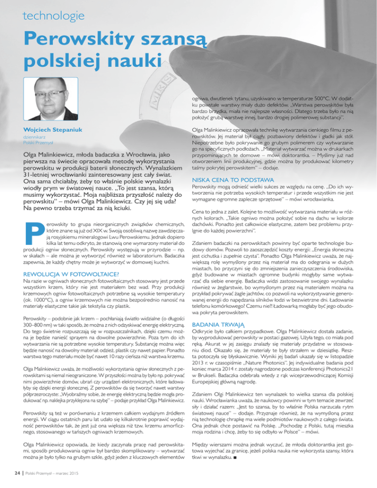 technologie Perowskity szansą polskiej nauki ogniwa, dwutlenek tytanu, uzyskiwano w temperaturze 500°C. W dodatku powstałe warstwy miały dużo defektów. „Warstwa perowskitów była bardzo brzydka, miała nie najlepsze własności. Dlatego trzeba było na nią położyć grubą warstwę innej, bardzo drogiej polimerowej substancji”. Wojciech Stepaniuk dziennikarz Polski Przemysł Olga Malinkiewicz, młoda badaczka z Wrocławia, jako pierwsza na świecie opracowała metodę wykorzystania perowskitu w produkcji baterii słonecznych. Wynalazkiem 31-letniej wrocławianki zainteresowany jest cały świat. Ona sama chciałaby, żeby to właśnie polskie wynalazki wiodły prym w światowej nauce. „To jest szansa, którą musimy wykorzystać. Moja najbliższa przyszłość należy do perowskitu” – mówi Olga Malinkiewicz. Czy jej się uda? Na pewno trzeba trzymać za nią kciuki. P erowskity to grupa nieorganicznych związków chemicznych, które znane są już od XIX w. Swoją osobliwą nazwę zawdzięczają rosyjskiemu mineralogowi Lwu Perowskiemu. Jednak dopiero kilka lat temu odkryto, że stanowią one wymarzony materiał do produkcji ogniw słonecznych. Perowskity występują w przyrodzie – np. w skałach – ale można je wytworzyć również w laboratorium. Badaczka zapewnia, że każdy chętny może je wytworzyć w domowej kuchni. REWOLUCJA W FOTOWOLTAICE? Na razie w ogniwach słonecznych fotowoltaicznych stosowany jest przede wszystkim krzem, który nie jest materiałem bez wad. Przy produkcji krzemowych ogniw fotowoltaicznych potrzebne są wysokie temperatury (ok. 1000°C), a ogniw krzemowych nie można bezpośrednio nanosić na materiały elastyczne takie jak tekstylia czy plastik. Perowskity – podobnie jak krzem – pochłaniają światło widzialne (o długości 300–800 nm) w taki sposób, że można z nich odzyskiwać energię elektryczną. Do tego świetnie rozpuszczają się w rozpuszczalnikach, dzięki czemu można je będzie nanieść sprayem na dowolne powierzchnie. Poza tym do ich wytwarzania nie są potrzebne wysokie temperatury. Substancję można więc będzie nanosić na dowolny materiał: odzież, plastik czy nawet papier. Ponadto warstwa tego materiału może być nawet 10 razy cieńsza niż warstwa krzemu. Olga Malinkiewicz uważa, że możliwości wykorzystania ogniw słonecznych z perowskitami są niemal nieograniczone. W przyszłości można by było np. pokrywać nimi powierzchnie domów, ubrań czy urządzeń elektronicznych, które ładowałyby się dzięki energii słonecznej. Z perowskitów da się tworzyć nawet warstwy półprzezroczyste: „Wyobraźmy sobie, że energię elektryczną będzie mogła produkować np. naklejka przyklejona na szybę” – podaje przykład Olga Malinkiewicz. Olga Malinkiewicz opracowała technikę wytwarzania cienkiego filmu z perowskitów. Jej materiał był ciągły, pozbawiony defektów i gładki jak stół. Niepotrzebne było pokrywanie go grubym polimerem czy wytwarzanie go na specyficznych podłożach. „Materiał wytwarzać można w drukarkach przypominających te domowe – mówi doktorantka. – Myślimy już nad otworzeniem linii produkcyjnej, gdzie można by produkować kilometry taśmy pokrytej perowskitem” – dodaje. NISKA CENA TO PODSTAWA Perowskity mogą odnieść wielki sukces ze względu na cenę. „Do ich wytworzenia nie potrzeba wysokich temperatur i przede wszystkim nie jest wymagane ogromne zaplecze sprzętowe” – mówi wrocławianka. Cena to jedna z zalet. Kolejne to możliwość wytwarzania materiału w różnych kolorach. „Takie ogniwo można położyć sobie na dachu w kolorze dachówki. Ponadto jest całkowicie elastyczne, zatem bez problemu przylgnie do każdej powierzchni”. Zdaniem badaczki na perowskitach powinny być oparte technologie budowy domów. Pozwoli to zaoszczędzić koszty energii: „Energia słoneczna jest cichutka i zupełnie czysta”. Ponadto Olga Malinkiewicz uważa, że największą rolę wymyślony przez nią materiał ma do odegrania w dużych miastach, bo przyczyni się do zmniejszenia zanieczyszczenia środowiska, gdyż budowane w miastach ogromne budynki mogłyby same wytwarzać dla siebie energię. Badaczka widzi zastosowanie swojego wynalazku również w żeglarstwie, bo wymyślonym przez nią materiałem można na przykład pokrywać żagle jachtów, co pozwoli na wykorzystywanie generowanej energii do napędzania silników łodzi w bezwietrzne dni. Ładowanie telefonu komórkowego? Czemu nie?! Ładowarką mogłaby być jego obudowa pokryta perowskitem. BADANIA TRWAJĄ Odkrycie było całkiem przypadkowe. Olga Malinkiewicz dostała zadanie, by wyprodukować perowskity w postaci gazowej. Użyła tego, co miała pod ręką. Akurat w jej zasięgu znalazły się materiały przydatne w stosowaniu diod. Okazało się, że materiały te były strzałem w dziesiątkę. Reszta potoczyła się błyskawicznie. Wyniki jej badań ukazały się w listopadzie 2013 r. w czasopiśmie „Nature Photonics”. Jej indywidualne badania pod koniec marca 2014 r. zostały nagrodzone podczas konferencji Photonics21 w Brukseli. Badaczka odebrała wtedy z rąk wiceprzewodniczącej Komisji Europejskiej główną nagrodę. Perowskity są też w porównaniu z krzemem całkiem wydajnym źródłem energii. W ciągu ostatnich paru lat udało się kilkakrotnie poprawić wydajność perowskitów tak, że jest już ona większa niż tzw. krzemu amorficznego, stosowanego w tańszych ogniwach krzemowych. Zdaniem Olgi Malinkiewicz ten wynalazek to wielka szansa dla polskiej nauki. Wrocławianka uważa, że naukowcy powinni w tym temacie zewrzeć siły i działać razem: „Jest to szansa, by to właśnie Polska narzucała rytm światowej nauce” – dodaje. Przyznaje również, że na wymyśloną przez nią technologię chrapkę ma wiele podmiotów naukowych z całego świata. Ona jednak chce postawić na Polskę. „Pochodzę z Polski, tutaj mieszka moja rodzina i chcę, żeby to 