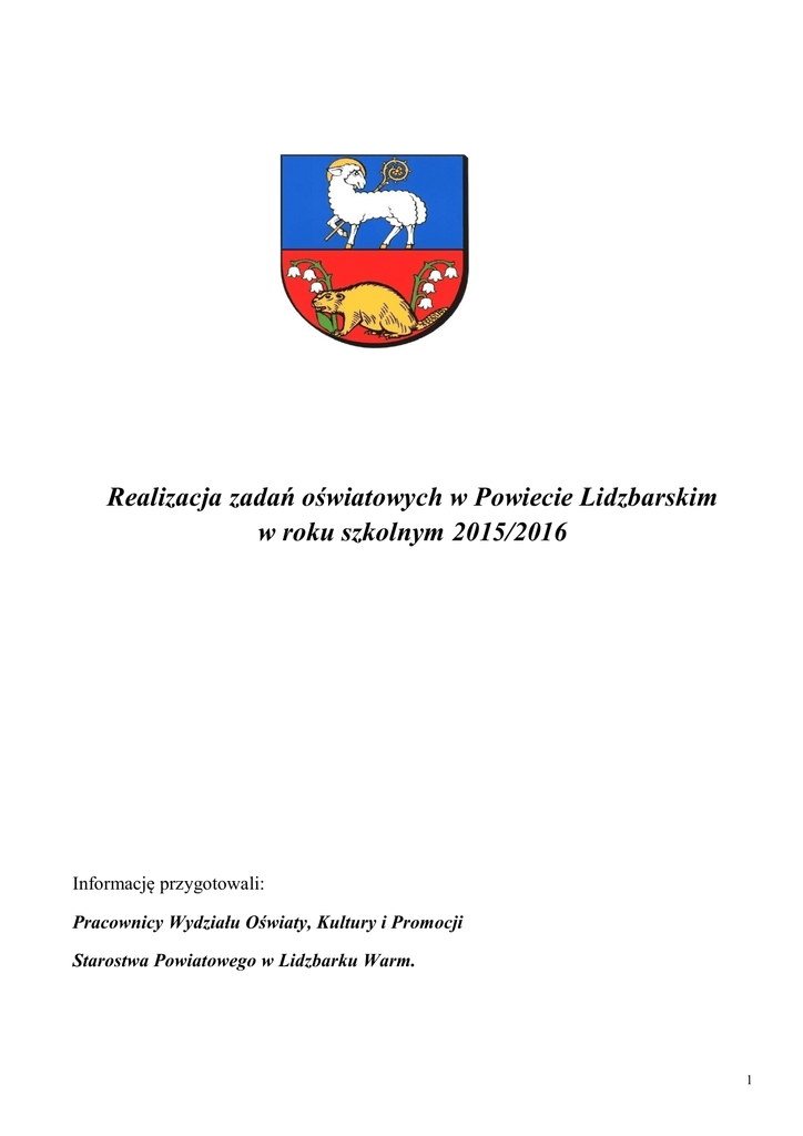 Realizacja zadań oświatowych w Powiecie Lidzbarskim w roku szkolnym 2015/2016 Informację przygotowali: Pracownicy Wydziału Oświaty, Kultury i Promocji Starostwa Powiatowego w Lidzbarku Warm. 1 Spis treści I. Wstęp ________________________________________________________3 II. Charakterystyka szkół ponadgimnazjalnych oraz placówek oświatowych_ 3 III. Liczba uczniów i oddziałów w szkołach i placówkach prowadzonych przez . powiat lidzbarski________ 5 IV. Nauczyciele wg stopnia awansu zawodowego zatrudnieni w szkołach i placówkach oświatowych, dla których organem prowadzącym jest powiat lidzbarski ______10 V. Pracownicy administracji i obsługi ______________________________ 11 VI. Wyniki matur i egzaminów zawodowych ________________________ 12 VII. Wyniki sprawdzianu i egzaminu gimnazjalnego_________________ 13 VIII. Informacje o działalności szkół i placówek ________14 MDK-14; SOSW- 15; MOW- 16; ZSO Or – 19; ZSiPO – 20; ZSO LW – 21; ZSZ LW – 21; PP-P Or – 23; PPP-P LW – 25) IX. Działania realizowane z udziałem środków zewnętrznych __ 30 X. Budżet szkół i placówek oświatowych_ ________________________ ___30 XI. Dotacje na szkoły i placówki niepubliczne______________________30 XII. Stypendia Starosty Lidzbarskiego __________________________ 31 XIII. Informacja o wynikach nadzoru pedagogicznego sprawowanego przez kuratora oświaty_____________________________________________________31 2 I. WSTĘP Raport realizacji zadań oświatowych w Powiecie Lidzbarskim w roku szkolnym 2015/2016 został opracowany na podstawie art. 5a ust. 4 ustawy z dnia 7 września 1991 r. o systemie oświaty (t. j. Dz. U. z 2015 r. poz. 2156 ze zm.) w oparciu o dane uzyskane z Systemu Informacji Oświatowej, Centralnej i Okręgowej Komisji Egzaminacyjnej, sprawozdań szkół i placówek oraz opracowań własnych pracowników Wydziału Oświaty, Kultury i Promocji Starostwa Powiatowego w Lidzbarku Warmińskim. W raporcie przedstawiono szczegółowe dane statystyczne oraz wykonanie zadań oświatowych przez szkoły i placówki, dla których organem prowadzącym jest Powiat Lidzbarski oraz informacje o szkołach niepublicznych z uprawnieniami szkół publicznych . II. CHARAKTERYSTYKA SZKÓŁ PLACÓWEK OŚWIATOWYCH PONADGIMNAZJALNYCH ORAZ W roku szkolnym 2015/2016 Powiat Lidzbarski był organem prowadzącym dla pięciu zespołów szkół, szkoły specjalnej, młodzieżowego ośrodka wychowawczego, młodzieżowego domu kultury oraz dwóch poradni psychologiczno - pedagogicznych. Ogółem w 73 oddziałach dla młodzieży i 2 dla dorosłych w: - przedszkolu specjalnym, - 2 szkołach podstawowych, - 3 gimnazjach, - 4 zasadniczych szkołach zawodowych, - 3 liceach ogólnokształcących, - 2 licea ogólnokształcące dla dorosłych, - 3 technikach, - 4 szkołach policealnych, - centrum kształcenia ustawicznego, -1 ponadgimnazjalnej specjalnej szkole przysposabiającej do pracy - na kursach kwalifikacyjnych było zatrudnionych 227 nauczycieli na 202,27 etatach (w tym 180 w pełnym wymiarze) i uczyło się w nich 1574 uczniów (w szkołach: młodzieżowych, dla dorosłych i specjalnych). Sieć szkół dla młodzieży i dorosłych była uzupełniana przez szkoły niepubliczne posiadające uprawnienia szkół publicznych: 2 licea ogólnokształcące dla dorosłych i trzy szkoły policealne. W roku szkolnym 2015/2016 placówki te prowadziły zajęcia w 7 oddziałach dla 158 uczniów, uczyło w nich 34 nauczycieli. 3 Wykaz szkół i placówek oświatowych, dla których organem prowadzącym jest Powiat Lidzbarski Zespół Szkół i Placówek Oświatowych w Lidzbarku Warmińskim, w skład którego wchodzą: - Zasadnicza szkoła Zawodowa nr 2- nie prowadzono naboru, - Liceum Ogólnokształcące nr 2, - Technikum nr 2, - kursy kwalifikacyjne - Szkoła Policealna nr 2 dla dorosłych- nie prowadzono naboru; Zespół Szkół Zawodowych w Lidzbarku Warmińskim tworzą: - Zasadnicza Szkoła Zawodowa Nr 1, - Technikum Nr 1, - Liceum Ogólnokształcące dla Dorosłych, - Szkoła policealna nr 1- nie prowadzono naboru, - Ośrodek Dokształcania i Doskonalenia Zawodowego - kursy kwalifikacyjne; Zespół Szkół Ogólnokształcących w Lidzbarku Warmińskim , w skład którego wchodzą: - Liceum Ogólnokształcące Nr 1, - Liceum Ogólnokształcące dla Dorosłych- bez naboru; Zespół Szkół Ogólnokształcących w Ornecie, w skład którego wchodzą: - Gimnazjum nr 1, - Liceum Ogólnokształcące nr 1, - Szkoła Policealna nr 2 dla dorosłych- nie prowadzono naboru; Zespół Szkół Zawodowych CKU w Ornecie tworzą: - Zasadnicza Szkoła Zawodowa , - Technikum , - Szkoła policealna dla dorosłych- nie prowadzono naboru, - Liceum Ogólnokształcące dla Dorosłych- bez naboru, - Centrum Kształcenia Ustawicznego ; Młodzieżowy Ośrodek Wychowawczy w skład , którego wchodzą: - Szkoła Podstawowa nr 5, - Gimnazjum nr 4 specjalne, - Zasadnicza Szkoła Zawodowa specjalna; Specjalny Ośrodek Szkolno – Wychowawczy prowadzi zajęcia dla dzieci posiadających orzeczenie o potrzebie kształcenia specjalnego w szkołach : - przedszkole specjalne - Szkoła Podstawowa specjalna nr 2, - Gimnazjum Specjalne nr 3, - Ponadgimnazjalna Szkoła Specjalna Przyspasabiająca do Pracy; 4 Młodzieżowy Dom Kultury w Lidzbarku Warmińskim Podstawowym celem działalności placówki jest zagospodarowanie czasu wolnego oraz rozwijanie zainteresowań i uzdolnień dzieci i młodzieży. Uczestnicy pracowni zwłaszcza plastycznych, tanecznych i wokalnych podejmują swoje dalsze kształcenie na kierunkach rozwijających ich umiejętności i zainteresowania ( licea plastyczne, wyższe szkoły sztuk plastycznych). Wychowankowie odnoszą sukcesy i uzyskują liczne nagrody w konkursach na różnych szczeblach, co zostanie przedstawione w tabeli w dalszej części opracowania. W imprezach lokalnych prezentują umiejętności zdobyte na zajęciach w naszej placówce. Powiatowa Poradnia Psychologiczno – Pedagogiczna Lidzbarku Wa