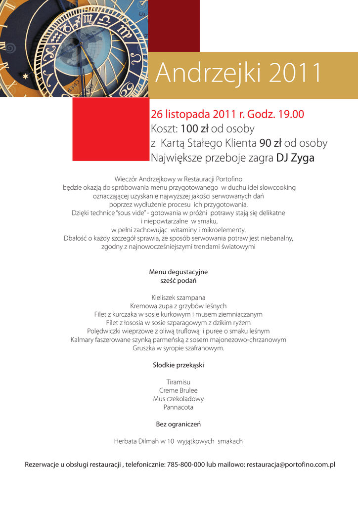 Andrzejki 2011 26 listopada 2011 r. Godz. 19.00 Koszt: 100 z³ od osoby z Kart¹ Sta³ego Klienta 90 z³ od osoby Najwiêksze przeboje zagra DJ Zyga Wieczór Andrzejkowy w Restauracji Portofino bêdzie okazj¹ do spróbowania menu przygotowanego w duchu idei slowcooking oznaczaj¹cej uzyskanie najwy¿szej jakoœci serwowanych dañ poprzez wyd³u¿enie procesu ich przygotowania. Dziêki technice “sous vide” - gotowania w pró¿ni potrawy staj¹ siê delikatne i niepowtarzalne w smaku, w pe³ni zachowuj¹c witaminy i mikroelementy. Dba³oœæ o ka¿dy szczegó³ sprawia, ¿e sposób serwowania potraw jest niebanalny, zgodny z najnowoczeœniejszymi trendami œwiatowymi Menu degustacyjne szeœæ podañ Kieliszek szampana Kremowa zupa z grzybów leœnych Filet z kurczaka w sosie kurkowym i musem ziemniaczanym Filet z ³ososia w sosie szparagowym z dzikim ry¿em Polêdwiczki wieprzowe z oliw¹ truflow¹ i puree o smaku leœnym Kalmary faszerowane szynk¹ parmeñsk¹ z sosem majonezowo-chrzanowym Gruszka w syropie szafranowym. S³odkie przek¹ski87-800 W³oc³awek, Al. Kazimierza Wielkiego 6e Tiramisu Creme Brulee Mus czekoladowy Pannacota tel./fax 054-233-0-555, tel.kom. 0-785-80000 [email protected] [email protected] www.portofino.com.pl Bez ograniczeñ Herbata Dilmah w 10 wyj¹tkowych smakach Rezerwacje u obs³ugi restauracji , telefonicznie: 785-800-000 lub mailowo: [email protected]