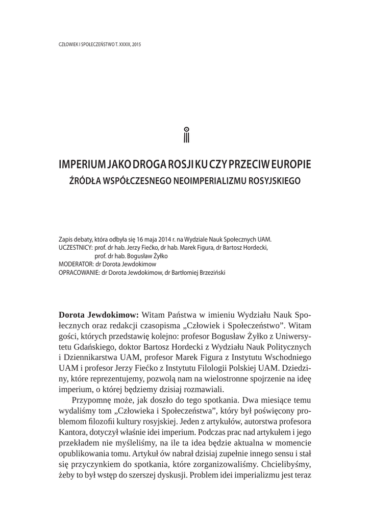 Człowiek i Społeczeństwo t. XXXIX, 2015 ! Imperium jako droga Rosji ku czy przeciw Europie Źródła współczesnego neoimperializmu rosyjskiego Zapis debaty, która odbyła się 16 maja 2014 r. na Wydziale Nauk Społecznych UAM. UCZESTNICY: prof. dr hab. Jerzy Fiećko, dr hab. Marek Figura, dr Bartosz Hordecki, prof. dr hab. Bogusław Żyłko MODERATOR: dr Dorota Jewdokimow OPRACOWANIE: dr Dorota Jewdokimow, dr Bartłomiej Brzeziński Dorota Jewdokimow: Witam Państwa w imieniu Wydziału Nauk Społecznych oraz redakcji czasopisma „Człowiek i Społeczeństwo”. Witam gości, których przedstawię kolejno: profesor Bogusław Żyłko z Uniwersytetu Gdańskiego, doktor Bartosz Hordecki z Wydziału Nauk Politycznych i Dziennikarstwa UAM, profesor Marek Figura z Instytutu Wschodniego UAM i profesor Jerzy Fiećko z Instytutu Filologii Polskiej UAM. Dziedziny, które reprezentujemy, pozwolą nam na wielostronne spojrzenie na ideę imperium, o której będziemy dzisiaj rozmawiali. Przypomnę może, jak doszło do tego spotkania. Dwa miesiące temu wydaliśmy tom „Człowieka i Społeczeństwa”, który był poświęcony problemom filozofii kultury rosyjskiej. Jeden z artykułów, autorstwa profesora Kantora, dotyczył właśnie idei imperium. Podczas prac nad artykułem i jego przekładem nie myśleliśmy, na ile ta idea będzie aktualna w momencie opublikowania tomu. Artykuł ów nabrał dzisiaj zupełnie innego sensu i stał się przyczynkiem do spotkania, które zorganizowaliśmy. Chcielibyśmy, żeby to był wstęp do szerszej dyskusji. Problem idei imperializmu jest teraz 216 debata bardzo często omawiany. Wszyscy śmiało wypowiadają się na ten temat, a jednocześnie brakuje pewnej podstawy merytorycznej, która by wyjaśniała źródła działań, jakich jesteśmy teraz świadkami. Zaprosiliśmy więc gości, aby pomogli nam zrozumieć tę ideę. Chodzi o takie podejście, które niekoniecznie byłoby próbą zgodzenia się bądź nie z pewnymi postawami, ale raczej próbą zrozumienia tych postaw. Przeczytam Państwu wyjściową tezę, sformułowaną przez profesora Kantora. Fragment będzie dość obszerny, potraktujemy go jako wstęp, po którym poprosimy o komentarze zaproszonych gości oraz odczytamy wcześniej nadesłane wypowiedzi. Profesor Kantor pisze: „Rosja pozostaje imperium bez względu na rozpad ZSRR. Konieczne byłoby zatem zrozumienie owego fenomenu. Pisze się u nas dzisiaj o zasadzie »imperialnej modernizacji«, uznając ją za szczególnie rosyjską, podczas gdy wszystkie kraje europejskie do niej się stosowały. Możemy również obecnie mówić, powtarzając słowa G.P. Fiedotowa, o Unii Europejskiej jako formie »imperium federalnego«. W każdym bądź razie normalny rozwój tak ogromnego organizmu, jakim pozostaje Rosja, niemożliwy jest poza imperium. Odrzucenie idei europeizmu doprowadziło niegdyś Rosję do ostatecznego przekształcenia prawosławia w religię ludu. Należało przeciwstawić temu coś, co objęłoby zarówno lud, jak i wyższe stany. Marksizm był ideologią europejską, jednak włączał w ową strukturę europejską również lud. Należałoby się tu zgodzić z Leninem, który twierdził, że Rosja wywalczyła sobie marksizm cierpieniem. Odpowiadał on na potrzeby nie tylko różnych klas, ale i wszystkich narodów. Dzisiaj potrzebna jest podobna idea. Słuszna wydaje się jednak stara sentencja mówiąca, że nowe jest zapomnianym już starym. Jak pisał jeden z mądrzejszych emigrantów trzydzieści lat przed pierestrojką, »dzisiaj marzenie o odbudowie w Rosji liberalno-konserwatywnego typu wolności jest pragnieniem ożywienia jej ducha imperialnego, a ściślej, oznacza to próbę wskrzeszenia samej Rosji, albowiem pozostaje ona najwyższym i jedynym osiągnięciem naszej twórczości imperialnej. Piotr Wielki nadał jej imię, odróżniające ją od Rusi, i zbudowana została nie przez Ruskich, ale przez Rosjan. [...] Dokonawszy życiowego czynu, obumarłszy, Ruscy, podobnie do zasianego ziarna, ożyli w duchowym ciele Imperium, powstali do nowego życia, przekształcili się w Rosjan, na równi z innymi przekształconymi narodowościami, które weszły w jej skład«1”2. Dalej Kantor stawia tezę, że imperium jest jedyną drogą Rosji ku Europie Г. Мейер, Поруганное чудо, „Вопросы философии” 10/2006, s. 101. W. Kantor, Imperium jako droga Rosji ku europeizacji, „Człowiek i Społeczeństwo” t. XXXV/2, 2013, s. 352. 1 2 Imperium jako droga Rosji ku czy przeciw Europie... 217 i przeciwstawia temu ideę nacjonalizmu. Pytanie brzmi: Czy idea imperium rzeczywiście stanowi rosyjską drogę do Europy, czy raczej prowadziłaby w przeciwnym kierunku? O odpowiedź proszę gości. Czy możemy zacząć od pana profesora? Jerzy Fiećko: Sporządziłem sobie stosowną notatkę przez szacunek dla wszystkich tu obecnych i aby nie odstępować dygresyjnie od tematu, będę się jej trzymał. Postawione przez panią pytanie jest zastanawiające, przewrotne. Zależy bowiem, o jaki model, o jakie wyobrażenie imperium chodzi, prawda? Kim jest Władimir Kantor? To wpływowy filozof i historyk kultury rosyjskiej, znawca kultury rosyjskiej, który się w tym tekście definiuje jako antynacjonalista. Rosyjski imperializm, rosyjskie wyobrażenie o byciu imperium trudno oderwać od pewnego typu nacjonalizmu. Kantor zdaje się sugerować, że każdy terytorialnie rozległy lub ekonomicznie silny organizm jest, czy tego chce, czy nie, bytem o charakterze imperialnym. Tak rozumiem jego wywód. Tylko tak można rozumieć tezę, że także Unia Europejska – on za Fiedotowem to powtarza, ale powtarza w sensie aprobatywnym – jest swoistym imperium federalnym. Kantor, w tym odczytanym przez panią urywku eseju, zdaje się mówić mniej więcej tak: wszędzie i zawsze były imperia, więc Rosja-imperium to żaden szczególny przypadek. Przeciwnie, uosabia zjawisko, które tkwi w rdzennie europejskiej 