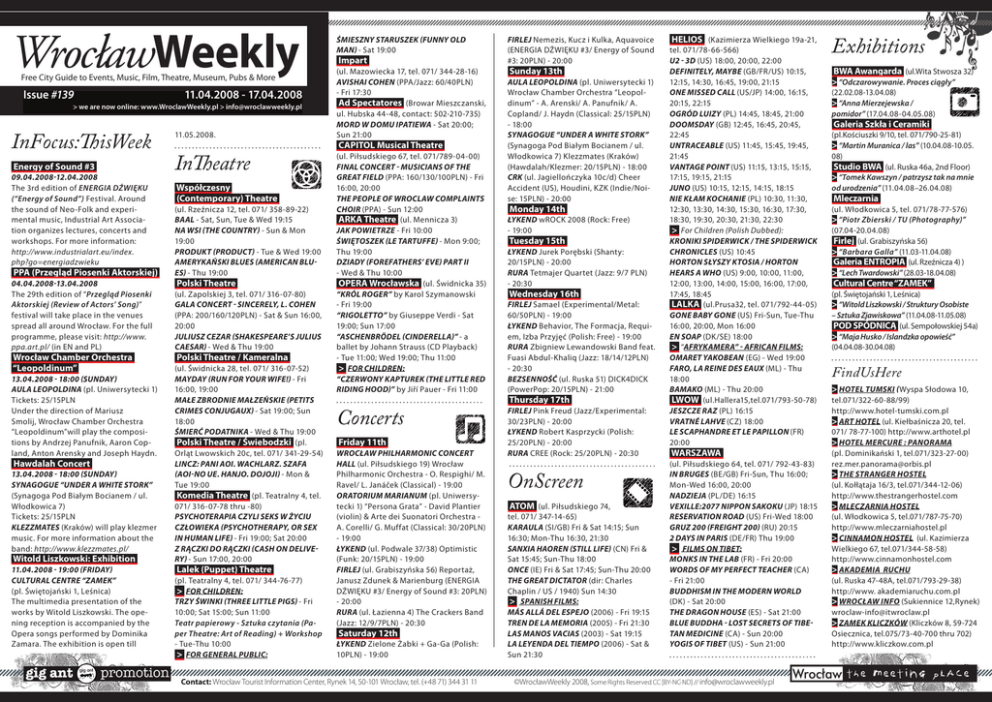WrocławWeekly Free City Guide to Events, Music, Film, Theatre, Museum, Pubs & More Issue #139 11.04.2008 - 17.04.2008 > we are now online: www.WroclawWeekly.pl > [email protected] InFocus:ThisWeek Energy of Sound #3 09.04.2008-12.04.2008 The 3rd edition of ENERGIA DŹWIĘKU (“Energy of Sound”) Festival. Around the sound of Neo-Folk and experimental music, Industrial Art Association organizes lectures, concerts and workshops. For more information: http://www.industrialart.eu/index. php?go=energiadzwieku 11.05.2008. InTheatre Współczesny (Contemporary) Theatre PPA (Przegląd Piosenki Aktorskiej) (ul. Rzeźnicza 12, tel. 071/ 358-89-22) Baal - Sat, Sun, Tue & Wed 19:15 Na wsi (The Country) - Sun & Mon 19:00 Produkt (Product) - Tue & Wed 19:00 Amerykański blues (American blues) - Thu 19:00 04.04.2008-13.04.2008 The 29th edition of “Przegląd Piosenki Aktorskiej (Review of Actors’ Song)” festival will take place in the venues spread all around Wrocław. For the full programme, please visit: http://www. ppa.art.pl/ (in EN and PL) (ul. Zapolskiej 3, tel. 071/ 316-07-80) Gala Concert - Sincerely, L. Cohen (PPA: 200/160/120PLN) - Sat & Sun 16:00, 20:00 Juliusz Cezar (Shakespeare’s Julius Caesar) - Wed & Thu 19:00 Wrocław Chamber Orchestra “Leopoldinum” 13.04.2008 - 18:00 (Sunday) AULA LEOPOLDINA (pl. Uniwersytecki 1) Tickets: 25/15PLN Under the direction of Mariusz Smolij, Wrocław Chamber Orchestra “Leopoldinum”will play the compositions by Andrzej Panufnik, Aaron Copland, Anton Arensky and Joseph Haydn. Hawdalah Concert 13.04.2008 - 18:00 (Sunday) SYNAGOGUE “UNDER A WHITE STORK” (Synagoga Pod Białym Bocianem / ul. Włodkowica 7) Tickets: 25/15PLN Klezzmates (Kraków) will play klezmer music. For more information about the band: http://www.klezzmates.pl/ Witold Liszkowski: Exhibition 11.04.2008 - 19:00 (Friday) Cultural Centre “ZAMEK” (pl. Świętojański 1, Leśnica) The multimedia presentation of the works by Witold Liszkowski. The opening reception is accompanied by the Opera songs performed by Dominika Zamara. The exhibition is open till Polski Theatre Polski Theatre / Kameralna (ul. Świdnicka 28, tel. 071/ 316-07-52) Mayday (Run for Your Wife!) - Fri 16:00, 19:00 Małe zbrodnie małzeńskie (Petits crimes conjugaux) - Sat 19:00; Sun 18:00 Śmierć podatnika - Wed & Thu 19:00 Polski Theatre / Świebodzki (pl. Orląt Lwowskich 20c, tel. 071/ 341-29-54) LINCZ: Pani Aoi. Wachlarz. Szafa (Aoi-no Ue. Hanjo. Dojoji) - Mon & Tue 19:00 Komedia Theatre (pl. Teatralny 4, tel. 071/ 316-07-78 thru -80) Psychoterapia czyli seks w życiu człowieka (Psychotherapy, or sex in human life) - Fri 19:00; Sat 20:00 Z rączki do rączki (Cash On Delivery) - Sun 17:00, 20:00 Lalek (Puppet) Theatre (pl. Teatralny 4, tel. 071/ 344-76-77) > For Children: Trzy Świnki (Three Little Pigs) - Fri 10:00; Sat 15:00; Sun 11:00 Teatr papierowy - Sztuka czytania (Paper Theatre: Art of Reading) + Workshop - Tue-Thu 10:00 > For General Public: Śmieszny Staruszek (Funny Old Man) - Sat 19:00 Impart (ul. Mazowiecka 17, tel. 071/ 344-28-16) Avishai Cohen (PPA/Jazz: 60/40PLN) - Fri 17:30 Ad Spectatores (Browar Mieszczanski, ul. Hubska 44-48, contact: 502-210-735) Mord w domu Ipatiewa - Sat 20:00; Sun 21:00 CAPITOL Musical Theatre (ul. Piłsudskiego 67, tel. 071/789-04-00) Final Concert - Musicians of The Great Field (PPA: 160/130/100PLN) - Fri 16:00, 20:00 The People of Wroclaw Complaints Choir (PPA) - Sun 12:00 ARKA Theatre (ul. Mennicza 3) Jak Powietrze - Fri 10:00 Świętoszek (le Tartuffe) - Mon 9:00; Thu 19:00 Dziady (Forefathers’ Eve) Part II - Wed & Thu 10:00 OPERA Wrocławska (ul. Świdnicka 35) “Król Roger” by Karol Szymanowski - Fri 19:00 “Rigoletto” by Giuseppe Verdi - Sat 19:00; Sun 17:00 “Aschenbrödel (Cinderella)” - a ballet by Johann Strauss (CD Playback) - Tue 11:00; Wed 19:00; Thu 11:00 > For Children: “Czerwony Kapturek (The Little Red Riding Hood)” by Jiří Pauer - Fri 11:00 Concerts Friday 11th WROCŁAW PHILHARMONIC CONCERT HALL (ul. Piłsudskiego 19) Wrocław Philharmonic Orchestra - O. Respighi/ M. Ravel/ L. Janáček (Classical) - 19:00 ORATORIUM MARIANUM (pl. Uniwersytecki 1) “Persona Grata” - David Plantier (violin) & Arte dei Suonatori Orchestra A. Corelli/ G. Muffat (Classical: 30/20PLN) - 19:00 ŁYKEND (ul. Podwale 37/38) Optimistic (Funk: 20/15PLN) - 19:00 FIRLEJ (ul. Grabiszyńska 56) Reportaż, Janusz Zdunek & Marienburg (ENERGIA DŹWIĘKU #3/ Energy of Sound #3: 20PLN) - 20:00 RURA (ul. Łazienna 4) The Crackers Band (Jazz: 12/9/7PLN) - 20:30 Saturday 12th ŁYKEND Zielone Żabki + Ga-Ga (Polish: 10PLN) - 19:00 Contact: Wrocław Tourist Information Center, Rynek 14, 50-101 Wrocław, tel. (+48 71) 344 31 11 FIRLEJ Nemezis, Kucz i Kulka, Aquavoice (ENERGIA DŹWIĘKU #3/ Energy of Sound #3: 20PLN) - 20:00 Sunday 13th AULA LEOPOLDINA (pl. Uniwersytecki 1) Wrocław Chamber Orchestra “Leopoldinum” - A. Arenski/ A. Panufnik/ A. Copland/ J. Haydn (Classical: 25/15PLN) - 18:00 SYNAGOGUE “UNDER A WHITE STORK” (Synagoga Pod Białym Bocianem / ul. Włodkowica 7) Klezzmates (Kraków) (Hawdalah/Klezmer: 20/15PLN) - 18:00 CRK (ul. Jagiellończyka 10c/d) Cheer Accident (US), Houdini, KZK (Indie/Noise: 15PLN) - 20:00 Monday 14th ŁYKEND wROCK 2008 (Rock: Free) - 19:00 Tuesday 15th ŁYKEND Jurek Porębski (Shanty: 20/15PLN) - 20:00 RURA Tetmajer Quartet (Jazz: 9/7 PLN) - 20:30 Wednesday 16th FIRLEJ Samael (Experimental/Metal: 60/50PLN) - 19:00 ŁYKEND Behavior, The Formacja, Requiem, Izba Przyjęć (Polish: Free) - 19:00 RURA Zbigniew Lewandowski Band feat. Fuasi Abdul-Khaliq (Jazz: 18/14/12PLN) - 20:30 BEZSENNOŚĆ (ul. Ruska 51) DICK4DICK (PowerPop: 20/15PLN) - 21:00 Thursday 17th FIRLEJ Pink Freud (Jazz/Experimental: 30/23PLN) - 20:00 ŁYKEND Robert Kasprzycki (Polish: 25/20PLN) - 20:00 RURA CREE (Rock: 25/20PLN) - 20:30 OnScreen ATOM (ul. Piłsudskiego 74, tel. 071/ 347-14-65) Karaula (SI/GB) Fri & Sat 14:15; Sun 16:30; Mon-Thu 16:30, 21:30 Sanxia 
