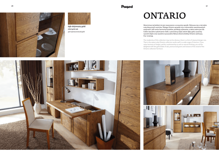 26 27 ONTARIO dąb olejowany gold oiled gold oak дуб промасленный gold Wzornictwo tej kolekcji nie jest nowoczesne w oczywisty sposób. Odczuwa się w niej także nutę klasycznych wzorców. Dlatego Ontario sprawdzi się w różnorodnie zaaranżowanych wnętrzach. Jeśli cenisz harmonię kształtów, perfekcję wykonania, a także ważne jest dla Ciebie naturalne wykończenie mebli, z pewnością ciepły odcień dębu gold, wyrazisty rysunek słojów oraz wyraźnie wyczuwalna faktura drewna kolekcji Ontario zachwycą Cię i oczarują. The modernity of this collection may not be obvious; there is a hint of classical designs too. That is the reason why Ontario collection works well in a wide range of interiors. If you value harmony of shapes, perfect workmanship as well as natural finishing, you will be delighted with the gold shade of oak, pronounced grains and texture of the wood of the Ontario collection furniture. ontario 29 dąb olejowany gold oiled gold oak дуб промасленный gold szafa 2-drzwiowa witryna wysoka 13 witryna niska 14 RTV duża 101/2 szafka RTV duża 101 szafka RTV mała 11 2-door wardrobe high display cabinet 13 low display cabinet 14 TV cabinet large 101 TV cabinet small 11 s 117 x g 55 x w 195 cm s 67 x g 38 x w 195 cm витрина низкая 14 TV cabinet large 101/2 s 97 x g 38 x w 158 cm s 157 x g 45 x w 45 cm s 157 x g 45 x w 45 cm s 117 x g 45 x w 45 cm witryna niska 15 kredens 3 oszklony kredens 3 z szufladami półka wisząca 51 lewa/prawa krzesło Seva low display cabinet 15 glazed sideboard 3 hanging shelf 51 left/right Seva chair s 117 x g 38 x w 158 cm комод 3 застекленный sideboard 3 with drawers s 152 x g 38 x w 87 cm s 152 x g 38 x w 87 cm s 117 x g 22 x w 24 cm s 46,5 x g 56,5 x w 91 cm kredens 2 kredens 2/biurko stół Ontario z szufladą sideboard 2 sideboard 2/desk Ontario table with drawer s 107 x g 38 x w 87 cm s 116,5 x g 45 x w 78 cm s 90 x d 160/210 x w 77 cm шкаф 2-дверный витрина низкая 15 комод 2 витрина высокая 13 комод 2/письменный стол комод 3 с ящиками шкафчик ТВ большой 101/2 полка висячая 51 левая/правая стол Ontario с ящиком шкафчик ТВ большой 101 стул Seva шкафчик ТВ маленький 11 stolik Ontario jesion Ontario side table ash wood столик Ontario s 110 x g 68 x w 45 cm