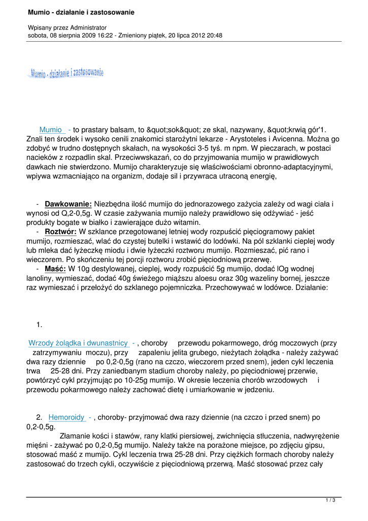 Mumio - działanie i zastosowanie Wpisany przez Administrator sobota, 08 sierpnia 2009 16:22 - Zmieniony piątek, 20 lipca 2012 20:48 Mumio - to prastary balsam, to "sok" ze skal, nazywany, "krwią gór'1. Znali ten środek i wysoko cenili znakomici starożytni lekarze - Arystoteles i Avicenna. Można go zdobyć w trudno dostępnych skałach, na wysokości 3-5 tyś. m npm. W pieczarach, w postaci nacieków z rozpadlin skal. Przeciwwskazań, co do przyjmowania mumijo w prawidłowych dawkach nie stwierdzono. Mumijo charakteryzuje się właściwościami obronno-adaptacyjnymi, wpiywa wzmacniająco na organizm, dodaje sil i przywraca utraconą energię, - Dawkowanie: Niezbędna ilość mumijo do jednorazowego zażycia zależy od wagi ciała i wynosi od Q,2-0,5g. W czasie zażywania mumijo należy prawidłowo się odżywiać - jeść produkty bogate w białko i zawierające dużo witamin. - Roztwór: W szklance przegotowanej letniej wody rozpuścić pięciogramowy pakiet mumijo, rozmieszać, wlać do czystej butelki i wstawić do lodówki. Na pól szklanki cieplej wody lub mleka dać łyżeczkę miodu i dwie łyżeczki roztworu mumijo. Rozmieszać, pić rano i wieczorem. Po skończeniu tej porcji roztworu zrobić pięciodniową przerwę. - Maść: W 10g destylowanej, cieplej, wody rozpuścić 5g mumijo, dodać lOg wodnej lanoliny, wymieszać, dodać 40g świeżego miąższu aloesu oraz 30g wazeliny bornej, jeszcze raz wymieszać i przełożyć do szklanego pojemniczka. Przechowywać w lodówce. Działanie: 1. Wrzody żolądka i dwunastnicy - , choroby przewodu pokarmowego, dróg moczowych (przy zatrzymywaniu moczu), przy zapaleniu jelita grubego, nieżytach żołądka - należy zażywać dwa razy dziennie po 0,2-0,5g (rano na czczo, wieczorem przed snem), jeden cykl leczenia trwa 25-28 dni. Przy zaniedbanym stadium choroby należy, po pięciodniowej przerwie, powtórzyć cykl przyjmując po 10-25g mumijo. W okresie leczenia chorób wrzodowych i przewodu pokarmowego należy zachować dietę i umiarkowanie w jedzeniu. 2. Hemoroidy - , choroby- przyjmować dwa razy dziennie (na czczo i przed snem) po 0,2-0,5g. Złamanie kości i stawów, rany klatki piersiowej, zwichnięcia stłuczenia, nadwyrężenie mięśni - zażywać po 0,2-0,5g mumijo. Należy także na porażone miejsce, po zdjęciu gipsu, stosować maść z mumijo. Cykl leczenia trwa 25-28 dni. Przy ciężkich formach choroby należy zastosować do trzech cykli, oczywiście z pięciodniową przerwą. Maść stosować przez cały 1/3 Mumio - działanie i zastosowanie Wpisany przez Administrator sobota, 08 sierpnia 2009 16:22 - Zmieniony piątek, 20 lipca 2012 20:48 czas, 3. Kostna tuberkuloza (gruźlica), choroby stawów biodrowych i kolanowych, choroby kręgosłupa - przyjmować po 0,2-0,5g dwa razy dziennie w ciągu 21-25 dni, Po przerwie pięciodniowej powtórzyć. Niezbędna ilość mumijo 10-25g. 4. Zakrzepowe zapalenie żył (także żyt nóg), czyli żylaki - przyjmować raz dziennie po 0,2-0,3 g mumijo przez 20-25 dni, z pięciodniową przerwą między cyklami leczenia, Znacznie zmniejsza się ból. 5. Ropne, zapalne, zainfekowane rany, oparzenia, ropne wrzody - należy smarować 10% roztworem mumijo i jednocześnie zażywać po 0,2-0,5g dwa razy dziennie. Wpływa to na zmniejszenie bólu, przeciwdziała powstawaniu nowych stanów zapalnych oraz przyspiesza gojenie się ran. 6. Krwotoki z płuc - zażywać po 0,2-0,5g mumijo, razem z syropem np. wiśniowym lub morelowym, 2-3 razy dziennie, wieczorem koniecznie przed snem. Niezbędne są 3-4 cykle leczenia po 25 dni z dziesięciodniowymi przerwami, 7. Alergie, katary, nieżyty górnych dróg oddechowych, kichanie, anginy - przyjmować rano i wieczorem po 0,2-0,5g, razem z mlekiem i miodem. Przy anginie płukać gardło 10% roztworem mumijo. Niezbędne są nawet i trzy cykle leczenia, w zależności od zaawansowania choroby. Jeden cykl trwa 25-28 dni z pięciodniową przerwą. 8. Astma bronchialna - po 0,2-0,5g dwa razy dziennie (na czczo i przed snem). Cykl leczenia trwa 25-28 dni. W zależności od stanu choroby mogą być niezbędne i trzy cykle leczenia z pięciodniową przerwą. 9. Choroby kobiece, uszkodzenia tkanek kobiecych organów płciowych (tkanki pochwy i szyjki macicy) i inne stany zapalne - na chore miejsca przykładać waciki nasączone 4% roztworem mumijo. Cykl leczenia trwa dwa - trzy tygodnie, po czym, w razie potrzeby, można go, po dziesięciodniowej przerwie, powtórzyć. Ponadto wskazane jest zażywać raz dziennie, po 0,2-0,5g, mumijo, co znacznie skraca leczenie. Najlepiej okłady stosować na noc. Po 5-7 dniach rany oczyszczają się. Przestrzegać higieny. 10. Bezpłodność u kobiet i mężczyzn, wzmocnienie płciowych funkcji mężczyzny (słabe nasienie) - przyjmować po 0,2-0,5 g z sokiem z marchwi lub z czarnej jagody po dwa razy dziennie. Cykl leczenia trwa 25-28 dni z pięciodniową przerwą. Wzmocnienie prawidłowych funkcji płciowych zauważalne jest po 6-7 dniach. Wskazane jest jedzenie dużej ilości kiełków pszenicy i zażywanie witaminy E. 11. Choroby narządów ruchu, zapalenie korzonków nerwowych, nerwobóle - w ciągu 20 dni należy wcierać przez 5-6 minut w chore miejsca 8-10% roztwór mumijo, przy jednoczesnym zażywaniu po 0,2-0,5g mumijo z mlekiem i miodem. Ustalono, że przy wcieraniu mumijo i lekkim masażu obniża się zapalenie mięśni, zanika, bo! I niepokój, Zażywać dodatkowo duże ilości magnezu i wit. B. 12. Parodontoza (dziąseł i przyzębia) - przyjmować po 0,2-0,5g mumijo, dwa razy dziennie, w ciągu 25 dni, z mlekiem i miodem. Jednocześnie, po posiłkach, płukać usta 5% roztworem wodnym mumijo. Na noc robić okłady z 5% roztworu, a także, po płukaniu, masować dziąsła palcem. 13. Egzemy, grzybice, zwyrodnienia kończyn - należy wygrzać chore miejsca w parze wodnej, a następnie natrzeć maścią z mumijo. Choroby te wymagają bardzo regularnego, często powtarzanego leczenia. Skuteczność- 60% wyleczeń