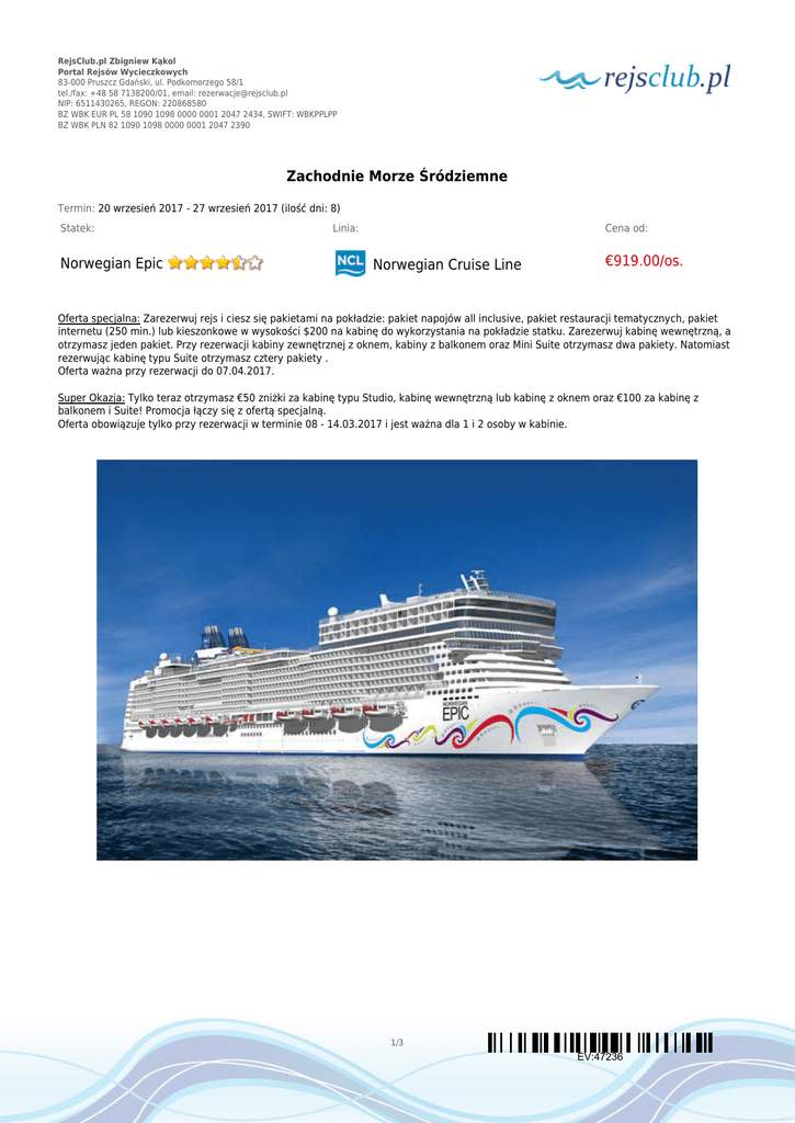 RejsClub.pl Zbigniew Kąkol Portal Rejsów Wycieczkowych 83-000 Pruszcz Gdański, ul. Podkomorzego 58/1 tel./fax: +48 58 7138200/01, email: [email protected] NIP: 6511430265, REGON: 220868580 BZ WBK EUR PL 58 1090 1098 0000 0001 2047 2434, SWIFT: WBKPPLPP BZ WBK PLN 82 1090 1098 0000 0001 2047 2390 Zachodnie Morze Śródziemne Termin: 20 wrzesień 2017 - 27 wrzesień 2017 (ilość dni: 8) Statek: Norwegian Epic Linia: Cena od: Norwegian Cruise Line €919.00/os. Oferta specjalna: Zarezerwuj rejs i ciesz się pakietami na pokładzie: pakiet napojów all inclusive, pakiet restauracji tematycznych, pakiet internetu (250 min.) lub kieszonkowe w wysokości $200 na kabinę do wykorzystania na pokładzie statku. Zarezerwuj kabinę wewnętrzną, a otrzymasz jeden pakiet. Przy rezerwacji kabiny zewnętrznej z oknem, kabiny z balkonem oraz Mini Suite otrzymasz dwa pakiety. Natomiast rezerwując kabinę typu Suite otrzymasz cztery pakiety . Oferta ważna przy rezerwacji do 07.04.2017. Super Okazja: Tylko teraz otrzymasz €50 zniżki za kabinę typu Studio, kabinę wewnętrzną lub kabinę z oknem oraz €100 za kabinę z balkonem i Suite! Promocja łączy się z ofertą specjalną. Oferta obowiązuje tylko przy rezerwacji w terminie 08 - 14.03.2017 i jest ważna dla 1 i 2 osoby w kabinie. 1/3 EV:47236 RejsClub.pl Zbigniew Kąkol Portal Rejsów Wycieczkowych 83-000 Pruszcz Gdański, ul. Podkomorzego 58/1 tel./fax: +48 58 7138200/01, email: [email protected] NIP: 6511430265, REGON: 220868580 BZ WBK EUR PL 58 1090 1098 0000 0001 2047 2434, SWIFT: WBKPPLPP BZ WBK PLN 82 1090 1098 0000 0001 2047 2390 TRASA REJSU Data Port Wpłynięcie Wypłynięcie środa 20.09.2017 Civitavecchia, Rzym --:-- 19:00 czwartek 21.09.2017 Livorno, Florencja i Piza 07:00 19:00 piątek 22.09.2017 Cannes 08:00 18:00 sobota 23.09.2017 Palma de Mallorca, Majorka 13:00 20:00 niedziela 24.09.2017 Barcelona 05:00 18:00 dzień 6 poniedziałek 25.09.2017 Dzień na morzu --:-- --:-- dzień 7 wtorek 26.09.2017 Neapol 07:00 19:00 środa 27.09.2017 Civitavecchia, Rzym 06:00 --:-- dzień 1 dzień 2 dzień 3 dzień 4 dzień 5 dzień 8 Legenda Włochy Włochy Francja Hiszpania Hiszpania Włochy Włochy CENNIK Cena katalogowa Kabina wewnętrzna od €919.00 Kabina zewnętrzna z balkonem od €1 479.00 Suite (apartament) od €1 619.00 Kabina jednoosobowa na zapytanie 3 i 4 osoba dorosła w kabinie na zapytanie dziecko od 2 do 17 lat jako 3 i 4 osoba w kabinie na zapytanie dziecko od 0 do 2 lat jako 3 i 4 osoba w kabinie na zapytanie Opłaty portowe Cena promocyjna w cenie 2/3 EV:47236 RejsClub.pl Zbigniew Kąkol Portal Rejsów Wycieczkowych 83-000 Pruszcz Gdański, ul. Podkomorzego 58/1 tel./fax: +48 58 7138200/01, email: [email protected] NIP: 6511430265, REGON: 220868580 BZ WBK EUR PL 58 1090 1098 0000 0001 2047 2434, SWIFT: WBKPPLPP BZ WBK PLN 82 1090 1098 0000 0001 2047 2390 Uwaga! Ceny za osobę w kabinie dwuosobowej. Cena zawiera: zakwaterowanie w kabinie wybranej kategorii; wyżywienie - 3 główne posiłki, przekąski między posiłkami, bufet lub przekąski o północy; napoje serwowane do śniadania i w bufetach samoobsługowych; serwis bagażowy podczas wejścia i zejścia ze statku; serwis kabinowy; korzystanie ze wszystkich urządzeń sportowo - rekreacyjnych znajdujących się na pokładzie statku (basen, jacuzzi, sala fitness, itp.); udział we wszystkich imprezach organizowanych na statku (przedstawienia w teatrze, koncerty, programy animacyjne itp.). Cena nie zawiera: kosztów dojazdu do portu; ewentualnych noclegów w hotelu przed/po rejsie i transferów; wycieczek fakultatywnych w trakcie rejsu; korzystania z barów, mini baru w kabinie oraz napojów zamawianych w restauracji; korzystania z punktów usługowych (fryzjer, pralnia, fotograf, salon piękności i odnowy biologicznej, internet) i wydatków osobistych; napiwków dla obsługi na statku (kwota uzależniona od długości rejsu); ubezpieczenia KL, NNW i bagaż, kosztów wiz (tam gdzie wymagane). 3/3 EV:47236