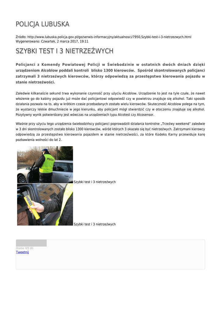 POLICJA LUBUSKA Źródło: http://www.lubuska.policja.gov.pl/go/serwis-informacyjny/aktualnosci/7950,Szybki-test-i-3-nietrzezwych.html Wygenerowano: Czwartek, 2 marca 2017, 19:11 SZYBKI TEST I 3 NIETRZEŹWYCH Policjanci z Komendy Powiatowej Policji w Świebodzinie w ostatnich dwóch dniach dzięki urządzeniom Alcoblow poddali kontroli blisko 1300 kierowców. Spośród skontrolowanych policjanci zatrzymali 3 nietrzeźwych kierowców, którzy odpowiedzą za przestępstwo kierowania pojazdu w stanie nietrzeźwości. Zaledwie kilkanaście sekund trwa wykonanie czynność przy użyciu Alcoblow. Urządzenie to jest na tyle czułe, że nawet włożenie go do kabiny pojazdu już może dać policjantowi odpowiedź czy w powietrzu znajduje się alkohol. Taki sposób działania pozwala na to, aby w krótkim czasie przebadanych zostało wielu kierowców. Skuteczność Alcoblow polega na tym, że wystarczy lekkie dmuchniecie w jego kierunku, aby policjant mógł stwierdzić czy w otoczeniu znajduje się alkohol. Pozytywny wynik potwierdzany jest wówczas na urządzeniach typu Alcotest czy Alcosensor. Właśnie przy użyciu tego urządzenia świebodzińscy policjanci poprowadzili działania kontrolne „Trzeźwy weekend” zaledwie w 3 dni skontrolowanych zostało blisko 1300 kierowców, wśród których 3 okazało się być nietrzeźwych. Zatrzymani kierowcy odpowiedzą za przestępstwo kierowania pojazdem w stanie nietrzeźwości, za które Kodeks Karny przewiduje karę pozbawienia wolności do lat 2. Szybki test i 3 nietrzeźwych Szybki test i 3 nietrzeźwych Ocena: 0/5 (0) Tweetnij