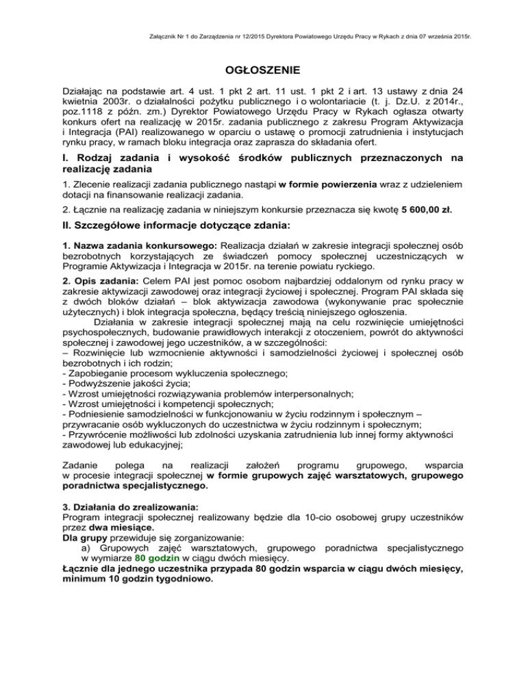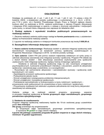Załącznik Nr 1 do Zarządzenia nr 12/2015 Dyrektora Powiatowego Urzędu Pracy w Rykach z dnia 07 września 2015r. OGŁOSZENIE Działając na podstawie art. 4 ust. 1 pkt 2 art. 11 ust. 1 pkt 2 i art. 13 ustawy z dnia 24 kwietnia 2003r. o działalności pożytku publicznego i o wolontariacie (t. j. Dz.U. z 2014r., poz.1118 z późn. zm.) Dyrektor Powiatowego Urzędu Pracy w Rykach ogłasza otwarty konkurs ofert na realizację w 2015r. zadania publicznego z zakresu Program Aktywizacja i Integracja (PAI) realizowanego w oparciu o ustawę o promocji zatrudnienia i instytucjach rynku pracy, w ramach bloku integracja oraz zaprasza do składania ofert. I. Rodzaj zadania i wysokość środków publicznych przeznaczonych na realizację zadania 1. Zlecenie realizacji zadania publicznego nastąpi w formie powierzenia wraz z udzieleniem dotacji na finansowanie realizacji zadania. 2. Łącznie na realizację zadania w niniejszym konkursie przeznacza się kwotę 5 600,00 zł. II. Szczegółowe informacje dotyczące zdania: 1. Nazwa zadania konkursowego: Realizacja działań w zakresie integracji społecznej osób bezrobotnych korzystających ze świadczeń pomocy społecznej uczestniczących w Programie Aktywizacja i Integracja w 2015r. na terenie powiatu ryckiego. 2. Opis zadania: Celem PAI jest pomoc osobom najbardziej oddalonym od rynku pracy w zakresie aktywizacji zawodowej oraz integracji życiowej i społecznej. Program PAI składa się z dwóch bloków działań – blok aktywizacja zawodowa (wykonywanie prac społecznie użytecznych) i blok integracja społeczna, będący treścią niniejszego ogłoszenia. Działania w zakresie integracji społecznej mają na celu rozwinięcie umiejętności psychospołecznych, budowanie prawidłowych interakcji z otoczeniem, powrót do aktywności społecznej i zawodowej jego uczestników, a w szczególności: – Rozwinięcie lub wzmocnienie aktywności i samodzielności życiowej i społecznej osób bezrobotnych i ich rodzin; - Zapobieganie procesom wykluczenia społecznego; - Podwyższenie jakości życia; - Wzrost umiejętności rozwiązywania problemów interpersonalnych; - Wzrost umiejętności i kompetencji społecznych; - Podniesienie samodzielności w funkcjonowaniu w życiu rodzinnym i społecznym – przywracanie osób wykluczonych do uczestnictwa w życiu rodzinnym i społecznym; - Przywrócenie możliwości lub zdolności uzyskania zatrudnienia lub innej formy aktywności zawodowej lub edukacyjnej; Zadanie polega na realizacji założeń programu grupowego, wsparcia w procesie integracji społecznej w formie grupowych zajęć warsztatowych, grupowego poradnictwa specjalistycznego. 3. Działania do zrealizowania: Program integracji społecznej realizowany będzie dla 10-cio osobowej grupy uczestników przez dwa miesiące. Dla grupy przewiduje się zorganizowanie: a) Grupowych zajęć warsztatowych, grupowego poradnictwa specjalistycznego w wymiarze 80 godzin w ciągu dwóch miesięcy. Łącznie dla jednego uczestnika przypada 80 godzin wsparcia w ciągu dwóch miesięcy, minimum 10 godzin tygodniowo. Dla dziesięcioosobowej grupy przez okres 2 miesięcy przewiduje się do zrealizowania: a) 80 godzin grupowych zajęć warsztatowych i grupowego poradnictwa specjalistycznego. Za godzinę pracy trenera przyjmuje się 60 minut. Zajęcia odbywają się tylko w dni robocze. 4. Specyfikacja szczegółowa działań Program zajęć powinien obejmować następujące tematy: 1/ W ramach grupowego poradnictwa specjalistycznego i zajęć warsztatowych przewiduję się realizację następujących tematów: A. Trening umiejętności interpersonalnych: • Rozumienie pojęcia „komunikacja” • Nabycie wiedzy z zakresu komunikacji werbalnej i niewerbalnej ważnej w relacjach interpersonalnych • Kształtowanie umiejętności nadawania i odbioru informacji • Nabycie umiejętności nawiązywania i podtrzymywania rozmowy w różnych kontekstach społecznych • Nabycie umiejętności aktywnego słuchania • Umiejętność odczytywania i przekazywania sygnałów niewerbalnych • Rozwijanie umiejętności współpracy w grupie • Rozwijanie potrzeby empatii oraz udzielania innym wzmocnień pozytywnych niezbędnych do podtrzymywania relacji z innymi ludźmi • Rozwijanie umiejętności prezentacji własnego stanowiska w dialogu z innymi • Nabycie umiejętności autoprezentacji B. Trening z zakresu asertywności i pozytywnego myślenia o sobie • Przekazanie wiedzy na temat zachowania i postawy asertywnej • Poznanie swoich słabych i mocnych umiejętności asertywnych • Praca nad budowaniem poczucia własnej wartości; • Przekazanie wiedzy na temat zachowania i postawy asertywnej; różnice między stylem asertywnym, agresywnym, uległym. • Poznanie swoich mocnych i słabych umiejętności asertywnych • Praca nad budowaniem poczucia własnej wartości i pozytywnym myśleniem o sobie (monolog wewnętrzny) • sobą Nauka asertywnej komunikacji, skutecznego odmawiania i bycia w zgodzie z samym • Wzmocnienie motywacji do stanowczego przedstawiania swoich racji i egzekwowania własnych praw • Nabycie umiejętności eksponowania własnych potrzeb i emocji • Radzenie sobie z krytyką • Wzmocnienie pozytywnego nastawienia do innych oraz pozbywanie się negatywnych emocji, zwłaszcza poczucia winy i poczucia krzywdy • Nauka stawiania i realizacji własnych celów życiowych i umiejętność przezwyciężanie osobistych ograniczeń C. Trening radzenia sobie ze stresem • Zdobycie wiedzy z zakresu teorii stresu oraz zrozumienie źródeł jego powstawania • Zwiększenie świadomości stresujących wydarzeń i ich potencjalnego wpływu na zdrowie • Określenie indywidualnego poziomu podatności na stres poprzez rozpoznanie swoich słabych i mocnych stron • Zdefiniowanie indywidualnych źródeł stresu i opracowanie strategii ich eliminowania • Poznanie efektywnych technik radzenia sobie ze stresem • Nauka skutecznego radzenia sobie ze str