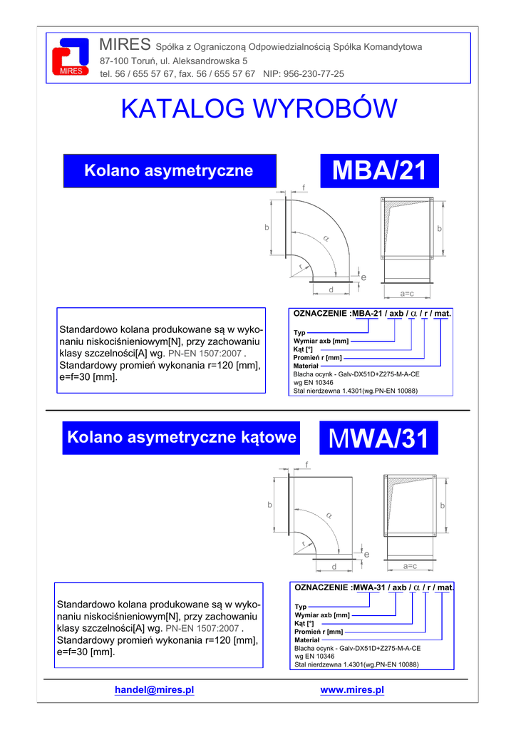 MIRES tel. 56 / 655 57 67, fax. 56 / 655 57 67 NIP: 956-230-77-25 MBA/21 Kolano asymetryczne f b b . . r e d a=c OZNACZENIE :MBA-21 / axb / / r / mat. Typ Wymiar axb [mm] PN-EN 1507:2007 . Blacha ocynk - Galv-DX51D+Z275-M-A-CE wg EN 10346 Stal nierdzewna 1.4301(wg.PN-EN 10088) e=f=30 [mm]. MWA/31 f b b . . r e d a=c OZNACZENIE :MWA-31 / axb / Typ Wymiar axb [mm] PN-EN 1507:2007 . e=f=30 [mm]. [email protected] Blacha ocynk - Galv-DX51D+Z275-M-A-CE wg EN 10346 Stal nierdzewna 1.4301(wg.PN-EN 10088) www.mires.pl / r / mat.