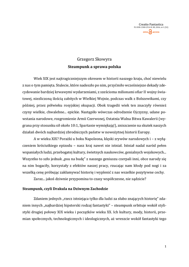 Creatio Fantastica PL ISSN: 2300-2514 R. XII, 2016, nr 1 (52) Grzegorz Skowyra Steampunk a sprawa polska Wiek XIX jest najtragiczniejszym okresem w historii naszego kraju, choć niewielu z nas o tym pamięta. Stulecie, które nadeszło po nim, przyćmiło wcześniejsze dekady zdecydowanie bardziej krwawymi wydarzeniami, z sześcioma milionami ofiar II wojny światowej, niezliczoną ilością zabitych w Wielkiej Wojnie, podczas walk z Bolszewikami, czy później, przez półwieku rosyjskiej okupacji. Obok tragedii wiek ten znaczyły również czyny wielkie, chwalebne... epickie. Nastąpiło wówczas odrodzenie Ojczyzny, udane powstania narodowe, rozgromienie Armii Czerwonej, Ostatnia Walna Bitwa Kawalerii (wygrana przy stosunku sił około 10:1, Spartanie wymiękają!), zniszczenie na skutek naszych działań dwóch najbardziej zbrodniczych państw w nowożytnej historii Europy. A w wieku XIX? Porażki u boku Napoleona, klęski zrywów narodowych i – z wyłączeniem króciutkiego epizodu – nasz kraj nawet nie istniał. Istniał nadal naród pełen wspaniałych ludzi, przebogatej kultury, świetnych naukowców, genialnych wojskowych... Wszystko to szło jednak „psu na budę” z naszego geniuszu czerpali inni, obce narody się na nim bogaciły, korzystały z efektów naszej pracy, rzucając nam kłody pod nogi i za wszelką cenę próbując zakłamywać historię i wyplenić z nas wszelkie pozytywne cechy. Zaraz... jakoś dziwnie przypomina to czasy współczesne, nie sądzicie? Steampunk, czyli Drakula na Dziwnym Zachodzie Zdaniem jednych „rzecz istniejąca tylko dla ludzi za słabo znających historię” zdaniem innych „najbardziej hipsterski rodzaj fantastyki” – steampunk orbituje wokół stylistyki drugiej połowy XIX wieku i początków wieku XX. Ich kultury, mody, historii, przemian społecznych, technologicznych i ideologicznych, aż wreszcie wokół fantastyki tego 1 okresu. Czy to będąc alternatywą świata znanego z podręczników, wersją retro czegoś łatwo rozpoznawalnego (jak bohaterowie komiksów czy Gwiezdnych wojen), czy jedynie inspiracją, swoistą kotwicą formy dla nieograniczonej floty ludzkiej wyobraźni. Steampunk nie jest niczym nowym. Nawet jeśli po raz pierwszy spotkaliście się z tą nazwą, istnieje wielkie prawdopodobieństwo, że zetknęliście się ze steampunkową stylistyką. Filmy takie jak Van Helsing czy Bardzo Dziki Zachód, animacje pokroju Atlantydy: Zaginionego Lądu albo Planety Skarbów Disneya, czy gry komputerowe, od kultowych jak Arcanum po nowości jak The Order 1886 – wszystkie mniej lub bardziej czerpią z tego trendu w fantastyce. I będąc właśnie trendem, stylem, formą, steampunk pasuje do każdego gatunku i klimatu, jaki tylko autor zechce stworzyć. Steampunkowy „starożytny Egipt” ma taką samą rację bytu, jak pozbawiony wszelkiej elektroniki okręt kosmiczny napędzany kotłem na kryształy Eternianu. Dowcipna, komediowa opowiastka o dżentelmenach pojedynkujących się w wielkich parowych mechach o rękę znudzonej damy może spokojnie egzystować obok romansidła o nieumarłym transylwańskim władcy szukającym w dziewiętnastowiecznym Londynie reinkarnacji swojej dawnej miłości, czy pełnej przygód i grozy historii o poszukiwaniach kości dinozaurów na afrykańskim cmentarzysku. Właśnie w tej wszechstronności, nieprzebranych inspiracjach, zaprawionych nutą nostalgii do czasów, których przecież nigdy nie było dane nam poznać, można upatrywać źródeł rosnącej popularności steampunku. Pasuje jak szabla do gajera Steampunk zdaniem niektórych wymaga „garnituru, gogli i cylindra”. Nie mogę się z tym zgodzić. Wbrew obiegowej opinii steampunk nie jest victorianpunkiem. Nie wymaga nawet wzmianki o Londynie, Imperium Brytyjskim czy nucenia „Rule Britannia”. Opowieść o nakręcanym samuraju, szalonym naukowcu polującym na wendigo za pomocą parowo napędzanego granatnika czy o etiopskim władcy przemierzającym swój kraj na pokładzie sterowca może być tak samo – a czasem nawet bardziej – zgodna z duchem tego trendu. Każdy kraj na świecie ma jakieś wydarzenia, postaci czy miejsca pasujące do steampunku jak kiełbasa do grilla. Wiedzieliście na przykład, że malutki bułgarski torpedo- 2 wiec uszkodził „z przyłożenia” turecki krążownik w 1912 roku? Albo że lud Hakka w Chinach stawia jednobudynkowe, warowne wioski? Albo wreszcie, że w czasach Wieku Pary we wspomnianej Etiopii monarchia istniała od około półtora tysiąca lat, podobnie zresztą jak chrześcijaństwo? To dopiero prztyczek w nos dla zadufanych w sobie brytyjskich imperialistów. A wszystko to jedynie przykłady historyczne. Co możemy osiągnąć, wspomagając się naszą wyobraźnią i mocą stwórczą? Tu niebo nie jest limitem, jest ono dopiero początkiem. Latające bachouany, pociągi pancerne walczące z lodowymi gigantami na transskandynawskiej estakadzie, kapłani azteccy i egipscy spotykający się w Nowym Babilonie na konferencji „Maszyna Parowa a tradycyjne techniki wznoszenia piramid”… Wszystko to czeka na nas, jeśli tylko wyjdziemy z tej mglistej, deszczowej Anglii. Odkrywcy, sarmaci i wojacy Ponownie, każdy kraj ma historię pełną wydarzeń, miejsc i bohaterów dosłownie promieniujących czystym, epickim steampunkiem. I nie inaczej jest w naszym przypadku. I nie chodzi tu o to, że koszula jest bliższa ciału – lecz o obiektywną ocenę faktów. Mamy w końcu wybitnych naukowców: człowieka, który oświetlił wszystkie domy od Dzikiego Zachodu po Syberię – Ignacego Łukasiewicza; gigantkę nauki, która rozpromieniła nasz świat – Marię Skłodowską; czy twórcę kamizelki kuloodpornej, między setką innych wynalazków – Jana Szczepanika. Towarzyszy im zgraja awanturników, podróżników, odkrywców, żołnierzy, na których omówienie zabrakłoby miejsca w całym numerze. O wydarzeniach też można niejedno napisać. Wojny, powstania, brawurowe akcj