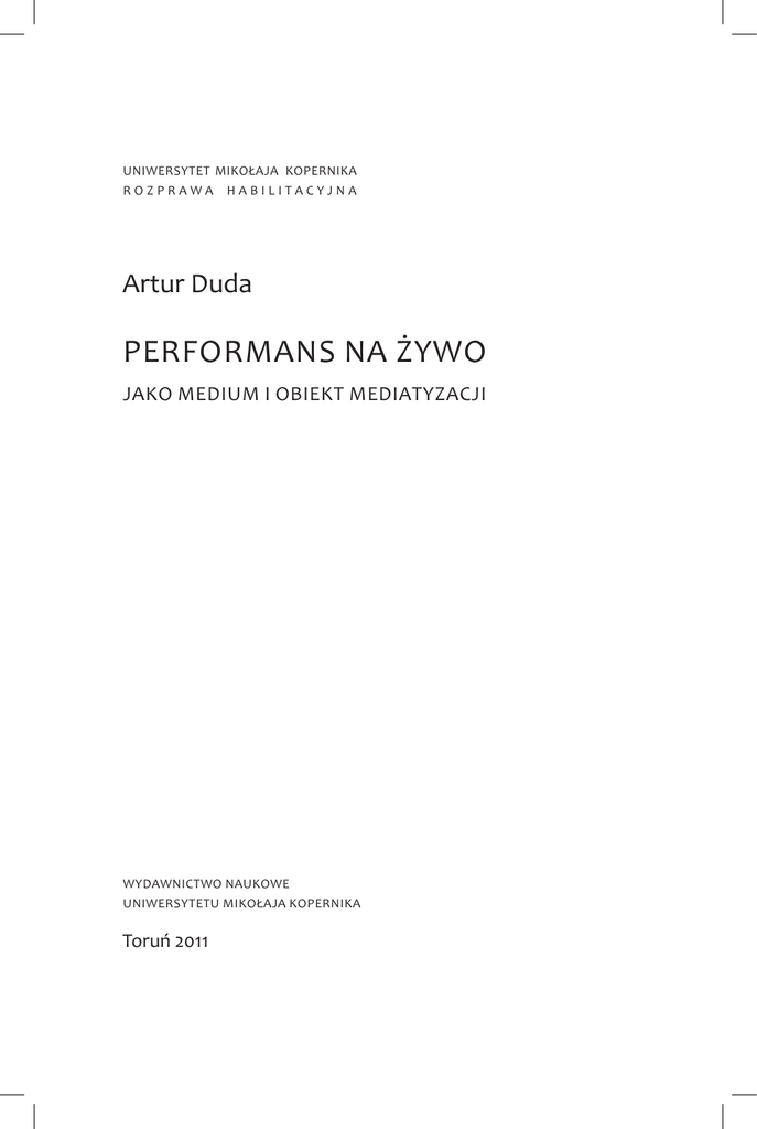 Uniwersytet Mikołaja Kopernika Rozprawa habilitacyjna Artur Duda Performans na żywo jako medium i obiekt mediatyzacji Wydawnictwo Naukowe Uniwersytetu Mikołaja Kopernika Toruń 2011 Spis treści Wstęp 9 Rozdział pierwszy Performans – zagadnienia teoretyczne Performans – cechy podstawowe 19 Performans ludyczny – widowisko – spektakl teatralny 31 Teatr jako technologia komunikacji i medium 41 Teatr, kino, telewizja – wspólny mit założycielski i relacje ontologiczne 46 Teatr i inne performanse na żywo jako media ludzkie 51 Teatr jako wehikuł, multimedialny terminal i wir zachowań 54 Definicja performansu 58 Rozdział drugi Sphairomachia, harpastum, football, czyli o kulturowych korzeniach piłki nożnej Przedmiot gry – kamień, owoc, ludzka głowa czy bukłak? 67 Tsu-czu, kemari, tlatchli – gry w piłkę w Chinach, Japonii i Ameryce Środkowej 70 Folk football i narodziny piłki nożnej w Wielkiej Brytanii 75 La soule, jeu de paume, calcio fiorentino – gry w piłkę na kontynencie europejskim 88 Sphairomachiai i inne gry w piłkę starożytnych Greków i Rzymian 98 5 Spis treści Rozdział trzeci „Piękna gra”. Mecz piłki nożnej jako performans ludyczny Performatywność piłki nożnej 121 Fabularność meczu piłki nożnej 127 Performatywna moc piłki nożnej 136 Rozdział czwarty Od minstrel show do hip hopu. Kulturowe korzenie muzyki rockowej Wędrowny teatr minstrel show 151 Czarne i białe korzenie minstrel show 166 Ragtime, blues, jazz – narodziny muzyki z ducha teatru 175 Performanse rock’n’rolla i hip hopu 180 Rozdział piąty Koncert rockowy jako performans ludyczny Wprowadzenie w estetykę muzyki rockowej 195 Główne kategorie estetyki hałasu – brzmienie, riff, rytm 198 Technologia nagrań i media muzyki rockowej 205 Słowa, słowa, słowa 210 Eklektyzm, hybrydyczność i wielokodowość rocka 216 Performatywność koncertu rockowego 219 Rozdział szósty Kulturowe korzenie telewizji i reality show Najważniejsze cechy estetyki telewizji 244 Performatywne korzenie telewizji 256 Kino atrakcji jako pretelewizja 262 Kino w strefie wpływów teatru atrakcji 271 6 Spis treści Aparatury do stwarzania sztucznych światów – od figury i automatu do fantomatycznego obrazu człowieka 278 Performatywne korzenie kina Georges’a Mélièsa 288 Performatywne korzenie reality show 291 Rozdział siódmy Reality show jako zmediatyzowany performans ludyczny Ile opery mydlanej? Iluzyjny wymiar reality show 307 Ile „reality”? Performatywny wymiar reality show 311 Ile prawdy, a ile pieniędzy? Komercyjny wymiar reality show 318 Rozdział ósmy Strefa wpływów estetyki performatywności – od performansu ludycznego do teatru Franka Castorfa Podstawy estetyki performatywności 328 Estetyka performatywności w teatrze Franka Castorfa 343 Wybrana bibliografia 377 Spis ilustracji 391 Live Performance as Medium and Mediatized Object. Summary 395 7