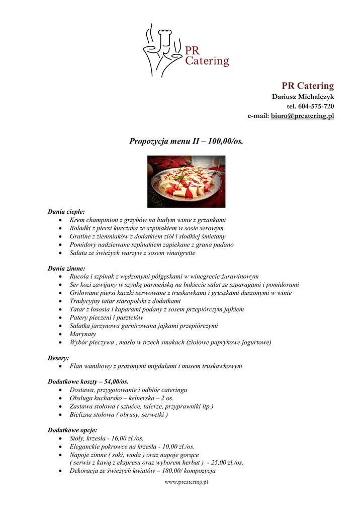 PR Catering Dariusz Michalczyk tel. 604-575-720 e-mail: [email protected] Propozycja menu II – 100,00/os. Dania ciepłe:  Krem champinion z grzybów na białym winie z grzankami  Roladki z piersi kurczaka ze szpinakiem w sosie serowym  Gratine z ziemniaków z dodatkiem ziół i słodkiej śmietany  Pomidory nadziewane szpinakiem zapiekane z grana padano  Sałata ze świeżych warzyw z sosem vinaigrette Dania zimne:  Rucola i szpinak z wędzonymi półgęskami w winegrecie żurawinowym  Ser kozi zawijany w szynkę parmeńską na bukiecie sałat ze szparagami i pomidorami  Grilowane piersi kaczki serwowane z truskawkami i gruszkami duszonymi w winie  Tradycyjny tatar staropolski z dodatkami  Tatar z łososia i kaparami podany z sosem przepiórczym jajkiem  Patery pieczeni i pasztetów  Sałatka jarzynowa garnirowana jajkami przepiórczymi  Marynaty  Wybór pieczywa , masło w trzech smakach (ziołowe paprykowe jogurtowe) Desery:  Flan waniliowy z prażonymi migdałami i musem truskawkowym Dodatkowe koszty – 54,00/os.  Dostawa, przygotowanie i odbiór cateringu  Obsługa kucharsko – kelnerska – 2 os.  Zastawa stołowa ( sztućce, talerze, przyprawniki itp.)  Bielizna stołowa ( obrusy, serwetki ) Dodatkowe opcje:  Stoły, krzesła - 16,00 zł./os.  Eleganckie pokrowce na krzesła - 10,00 zł./os.  Napoje zimne ( soki, woda ) oraz napoje gorące ( serwis z kawą z ekspresu oraz wyborem herbat ) - 25,00 zł./os.  Dekoracja ze świeżych kwiatów – 180,00/ kompozycja www.prcatering.pl Dodatkowe informacje:  Istnieje możliwość wykonania usługi w ogrodzie z namiotami lub w formie bufetów połączonych z serwisem – koszt ustalany indywidualnie www.prcatering.pl