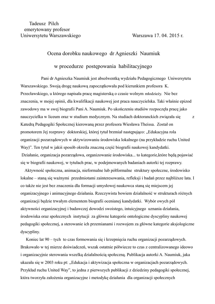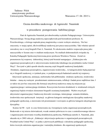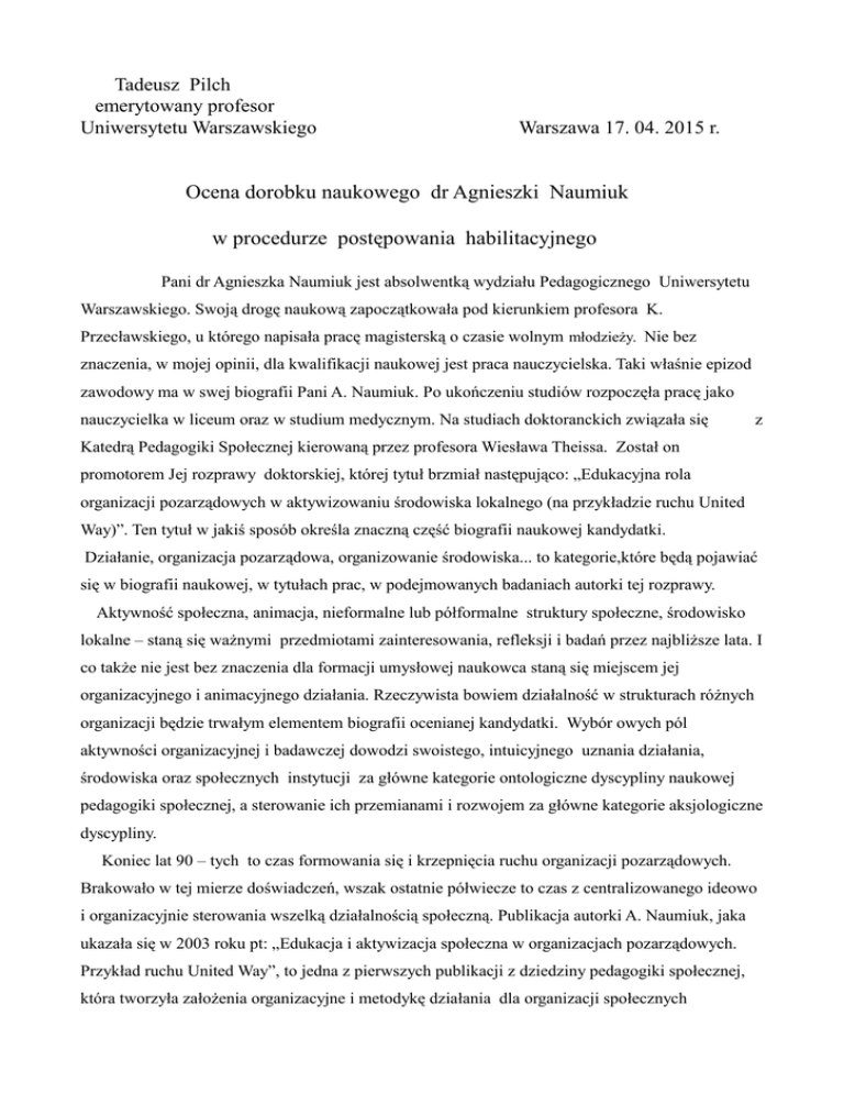 Tadeusz Pilch emerytowany profesor Uniwersytetu Warszawskiego Warszawa 17. 04. 2015 r. Ocena dorobku naukowego dr Agnieszki Naumiuk w procedurze postępowania habilitacyjnego Pani dr Agnieszka Naumiuk jest absolwentką wydziału Pedagogicznego Uniwersytetu Warszawskiego. Swoją drogę naukową zapoczątkowała pod kierunkiem profesora K. Przecławskiego, u którego napisała pracę magisterską o czasie wolnym młodzieży. Nie bez znaczenia, w mojej opinii, dla kwalifikacji naukowej jest praca nauczycielska. Taki właśnie epizod zawodowy ma w swej biografii Pani A. Naumiuk. Po ukończeniu studiów rozpoczęła pracę jako nauczycielka w liceum oraz w studium medycznym. Na studiach doktoranckich związała się z Katedrą Pedagogiki Społecznej kierowaną przez profesora Wiesława Theissa. Został on promotorem Jej rozprawy doktorskiej, której tytuł brzmiał następująco: „Edukacyjna rola organizacji pozarządowych w aktywizowaniu środowiska lokalnego (na przykładzie ruchu United Way)”. Ten tytuł w jakiś sposób określa znaczną część biografii naukowej kandydatki. Działanie, organizacja pozarządowa, organizowanie środowiska... to kategorie,które będą pojawiać się w biografii naukowej, w tytułach prac, w podejmowanych badaniach autorki tej rozprawy. Aktywność społeczna, animacja, nieformalne lub półformalne struktury społeczne, środowisko lokalne – staną się ważnymi przedmiotami zainteresowania, refleksji i badań przez najbliższe lata. I co także nie jest bez znaczenia dla formacji umysłowej naukowca staną się miejscem jej organizacyjnego i animacyjnego działania. Rzeczywista bowiem działalność w strukturach różnych organizacji będzie trwałym elementem biografii ocenianej kandydatki. Wybór owych pól aktywności organizacyjnej i badawczej dowodzi swoistego, intuicyjnego uznania działania, środowiska oraz społecznych instytucji za główne kategorie ontologiczne dyscypliny naukowej pedagogiki społecznej, a sterowanie ich przemianami i rozwojem za główne kategorie aksjologiczne dyscypliny. Koniec lat 90 – tych to czas formowania się i krzepnięcia ruchu organizacji pozarządowych. Brakowało w tej mierze doświadczeń, wszak ostatnie półwiecze to czas z centralizowanego ideowo i organizacyjnie sterowania wszelką działalnością społeczną. Publikacja autorki A. Naumiuk, jaka ukazała się w 2003 roku pt: „Edukacja i aktywizacja społeczna w organizacjach pozarządowych. Przykład ruchu United Way”, to jedna z pierwszych publikacji z dziedziny pedagogiki społecznej, która tworzyła założenia organizacyjne i metodykę działania dla organizacji społecznych wyzwalanych z kostiumu nakazowo – kontrolnego obejmującego cały system aktywności społecznej. Ta monografia, która nominalnie poświęcona jest jednemu z typów organizacji, niesie znacznie szersze przesłanie. Jest swoistym modelem i diagnozą warunków w jakich może kształtować się z powodzeniem społeczeństwo obywatelskie. Tym warunkiem jest obudzenie motywacji do aktywności społecznej. Ale zależność sprawcza działa także w odwrotnym kierunku. Właściwości społeczeństwa obywatelskiego wyzwalają aktywność społeczną, a ta z kolei umacnia walory społeczeństwa obywatelskiego. W ten sposób powstaje konieczny związek przyczynowo – sprawczy, który buduje pożądany ład społeczny, a jego inspiracją, drożdżami jest wychowanie i motywowanie do działania – jednego z ważnych atrybutów normatywnej pedagogiki społecznej. Te poglądy i ten spójny system interpretacji roli pedagoga społecznego w kształtowaniu pożądanego ładu społecznego dowodzą dojrzałości intelektualnej kandydatki do tytułu naukowego. Mimowolnie książka ta staje się doniosłym przyczynkiem teoretycznym i badawczym objaśniającym kształtowanie się idei wolontariatu. Wspominam o tym dlatego, ze idea wolontariatu, jego formy organizacyjne oraz miejsce w świadomości społecznej – to zjawisko deficytowe w naszej polskiej rzeczywistości. Stąd wszelkie działania, które zawierają impulsy do budowania przychylności, zainteresowania i tworzenia instytucjonalnych form wolontariatu należy uznać za niezwykle pożyteczne i konieczne dla społecznego rozwoju. Trzecia monografia dr Agnieszki Naumiuk jest zwieńczeniem wieloletnich zainteresowań autorki. Tytuł nie powala na kolana. Jest enigmatyczny i mało komunikatywny. „Edukacja – partycypacja – zmiana. W doświadczeniach i wyobrażeniach działaczy lokalnych (animatorów społecznych)”. Z treści książki wynika, że jest to specyficznie ujęta teoria i praktyka działania społecznego - fundamentalnego elementu naszej dyscypliny, pedagogiki społecznej. Nawet bez zgłębiania treści książki, z samej jej struktury treściowej; czytelnik może łatwo stwierdzić, ze jest to praca zawierająca swoistą filozofię działania społecznego. Oto treść wybranych rozdziałów i podrozdziałów: 1. Działanie społeczne jako konstruowanie przyszłości. , 2. Działanie społeczne jako realizacja ideałów wychowania., 4. Działanie społeczne w wyobrażeniu i doświadczeniu praktyki., 4.2.3 Nauka osiągania sukcesów i przezwyciężania oporów., 4.4.1. Tkanka społecznikowskich idei. …. itp. Odnoszę wrażenie,że autorka stworzyła jakby encyklopedyczny, wyczerpujący przegląd pojęć, a także nurtów praktyki społecznej w kontekście teorii i idei wychowania oraz działalności społecznej. Walor tych definicyjnych, pojęciowych i pragmatycznych ustaleń podnosi okoliczność, że ich podstawą są doświadczenia i badania samej autorki.. To nie są rozważania gabinetowego uczonego. To owoc doświadczeń badawczych, praktykowania osobistego w różnych strukturach społecznego działania, zarówno w Polsce, jak i za granicą. Jak sama pisze: „W publikacji tej chodzi o ukazanie indywidualnego odbioru i rozumienia świata wymagającego zmiany”. „Jest to ujecie tematu w wymiarze ind