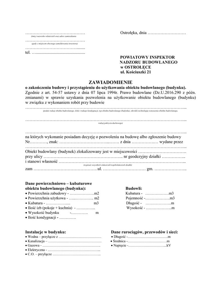 …………………………………… Ostrołęka, dnia ……………………… (imię i nazwisko właścicieli oraz adres zamieszkania …………………………………… zgody z miejscem obecnego zameldowania inwestora) ………………………………........ tel. ….............................................. POWIATOWY INSPEKTOR NADZORU BUDOWLANEGO w OSTROŁĘCE ul. Kościuszki 21 ZAWIADOMIENIE o zakończeniu budowy i przystąpieniu do użytkowania obiektu budowlanego (budynku). Zgodnie z art. 54-57 ustawy z dnia 07 lipca 1994r. Prawo budowlane (Dz.U.2016.290 z późn. zmianami) w sprawie uzyskania pozwolenia na użytkowanie obiektu budowlanego (budynku) w związku z wykonaniem robót przy budowie …………………………………………………………………………………………………... (podać rodzaj obiektu budowlanego, ilość i rodzaje kondygnacji, typ obiektu budowlanego (budynku), określić technologię wznoszenia obiektu budowlanego, …………………………………………………………………………………………………... rodzaj pokrycia dachowego) …………………………………………………………………………………………………... na których wykonanie posiadam decyzję o pozwoleniu na budowę albo zgłoszenie budowy Nr…………, znak: ……………………………...……. z dnia …………….… wydane przez …………………………………………………………………………………………………... Obiekt budowlany (budynek) zlokalizowany jest w miejscowości ……………………………. przy ulicy ……………………………………………….. nr geodezyjny działki …………….. i stanowi własność ……………………………………………………………………………... (wypisać wszystkich właścicieli/współwłaścicieli działki) zam ………………………………………ul. ………………………… gm. ………………….. Dane powierzchniowo – kubaturowe obiektu budowlanego (budynku): Powierzchnia zabudowy - ……………….m2 Powierzchnia użytkowa - …...………….. m2 Kubatura - ……………..... m3 Ilość izb (pokoje + kuchnia) - …………... Wysokość budynku -…………. m Ilość kondygnacji - …………. Budowli: Kubatura - ………………m3 Pojemność -……………….m3 Długość - ………………..m Wysokość - ………………..m Instalacje w budynku: Dane rurociągów, przewodów i sieci: Wodna – przyłącze z ……………………………… Kanalizacja – ……………………………………… Gazowa - …………………………………………. Elektryczna - ……………………………………... C.O. – przyłącze ………………………………….. Długość -…………………………….m Średnica -……………………………m Napięcie -…………………………...kV Dane dotyczące efektywności energetycznej budynku [przy t i ≥16oC]: Wskaźnik EP -………………………………………………………………………kWh/(m2*rok) Współczynnik przenikania ciepła U ścian zewnętrznych- …………………………..….W/(m2*K) Współczynnik przenikania ciepła U dachu / stropodachu / stropu pod nieogrzewanymi poddaszami- ….……………...…..W/(m2*K) Współczynnik przenikania ciepła U podłogi na gruncie w pomieszczeniach ogrzewanych…………………………….…..…W/(m2*K) Współczynnik przenikania ciepła U okien i drzwi balkonowych- ………………………W/(m2*K) Współczynnik przenikania ciepła U drzwi zewnętrznych- ……………….…………..…W/(m2*K) Wraz z zawiadomieniem przedkładam następujące załączniki: 1. Oryginał dziennika budowy z wpisem geodety uprawnionego o wytyczeniu obiektu budowlanego na gruncie 2. Oświadczenie kierownika budowy: o zgodności wykonania obiektu, budowlanego z projektem budowlanym i warunkami pozwolenia na budowę, o doprowadzeniu do należytego stanu i porządku terenu budowy, a także – w razie korzystania – ulicy, sąsiedniej nieruchomości, budynku lub lokalu, informacja o dokonaniu pomiarów powierzchni użytkowej budynku i poszczególnych lokali mieszkalnych, w sposób zgodny z przepisami Rozporządzenia Ministra Transportu, Budownictwa i Gospodarki Morskiej w sprawie szczegółowego zakresu i formy projektu budowlanego (Dz.U.2012.462). 3. Oświadczenie inspektora nadzoru inwestorskiego budowy o zakończeniu robót budowlanych. 4. Protokoły badań i sprawdzeń oraz opinie: opinia mistrza kominiarskiego, protokół lub oświadczenie osoby posiadającej wymagane kwalifikacje o wykonaniu instalacji elektrycznej wewnątrz budynku, protokół z odbioru instalacji gazowej oraz jej szczelności, protokół z odbioru przyłącza wod-kan do budynku, protokół z odbioru przyłącza C.O. do budynku, protokół odbioru przyłącza energetycznego. 5. Inwentaryzację geodezyjną powykonawczą – 2 egz. 6. Projekt budowlany (do wglądu). 7. Fotografie elewacji budynku - 4 szt. …………………………………… (podpis właściciela/współwłaściciela) UWAGA: Do składania zawiadomień o zakończeniu budowy i przystąpieniu na użytkowanie obiektów budowlanych jak i odbioru decyzji o pozwoleniu na użytkowanie, uprawnieni są właściciele lub osoby posiadające upoważnienia pisemne od właściciela z potwierdzoną przez organ administracji własnoręcznością podpisu właściciela.