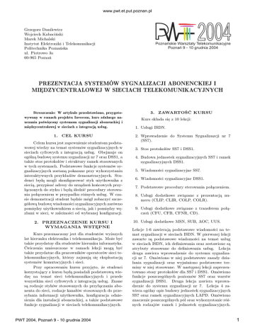 www.pwt.et.put.poznan.pl Grzegorz Danilewicz Wojciech Kabaciński Marek Michalski Instytut Elektroniki i Telekomunikacji Politechnika Poznańska ul. Piotrowo 3a 60-965 Poznań 2004 Poznańskie Warsztaty Telekomunikacyjne Poznań 9 - 10 grudnia 2004 PREZENTACJA SYSTEMÓW SYGNALIZACJI ABONENCKIEJ I MIĘDZYCENTRALOWEJ W SIECIACH TELEKOMUNIKACYJNYCH Streszczenie: W artykule przedstawiono, przygotowywany w ramach projektu Invocom, kurs zdalnego nauczania poświęcony systemom sygnalizacji abonenckiej i międzycentralowej w sieciach z integracją usług. 1. CEL KURSU Celem kursu jest zapewnienie studentom podstawowej wiedzy na temat systemów sygnalizacyjnych w sieciach cyfrowych z integracją usług. Obejmuje on ogólną budowę systemu sygnalizacji nr 7 oraz DSS1, a także stos protokołów i struktury ramek stosowanych w tych systemach. Podstawowe funkcje systemów sygnalizacyjnych zostaną pokazane przy wykorzystaniu interaktywnych przykładów demonstracyjnych. Studenci będą mogli skonfigurować styk użytkownika z siecią, przypisać adresy do urządzeń końcowych przyłączonych do styku i będą śledzić procedury sterowania połączeniem w przypadku różnych usług. W czasie demonstracji student będzie mógł zobaczyć szczegółową budowę wiadomości sygnalizacyjnych zarówno pomiędzy użytkownikiem a siecią, jak i pomiędzy węzłami w sieci, w zależności od wybranej konfiguracji. 2. PRZEZNACZENIE KURSU I WYMAGANIA WSTĘPNE Kurs przeznaczony jest dla studentów wyższych lat kierunku elektronika i telekomunikacja. Może być także przydatny dla studentów kierunku informatyka. Ćwiczenia umieszczone w ramach lekcji mogą być także przydatne dla pracowników operatorów sieci telekomunikacyjnych, którzy zajmują się eksploatacją systemów komutacyjnych i sieci. Przy opracowaniu kursu przyjęto, że studenci korzystający z kursu będą posiadali podstawową wiedzę na temat sieci telekomunikacyjnych i przede wszystkim sieci cyfrowych z integracją usług. Znane są rodzaje styków stosowanych do przyłączania abonenta do sieci, rodzaje kanałów stosowanych do przesyłania informacji użytkownika, konfiguracja odniesienia dla instalacji abonenckiej, a także podstawowe funkcje sygnalizacji w sieciach telekomunikacyjnych. PWT 2004, Poznań 9 - 10 grudnia 2004 3. ZAWARTOŚĆ KURSU Kurs składa się z 10 lekcji: 1. Usługi ISDN. 2. Wprowadzenie do Systemu Sygnalizazcji nr 7 (SS7). 3. Stos protokołów SS7 i DSS1. 4. Budowa jednostek sygnalizacyjnych SS7 i ramek sygnalizacyjnych DSS1. 5. Wiadomości sygnalizacyjne SS7. 6. Wiadomości sygnalizacyjne DSS1. 7. Podstawowe procedury sterowania połączeniem. 8. Usługi dodatkowe związane z prezentacją numeru (CLIP, CLIR, COLP, COLR). 9. Usługi dodatkowe związane z transferem połączeń (CFU, CFB, CFNR, CD). 10. Usługi dodatkowe MSN, SUB, AOC, UUS. Lekcje 1-6 zawierają podstawowe wiadomości na temat sygnalizacji w sieciach ISDN. W pierwszej lekcji zawarte są podstawowe wiadomości na temat usług w sieciach ISDN, ich definiowania oraz zestawione są atrybuty stosowane do definiowania usług. Lekcja druga zawiera wprowadzenie do systemu sygnalizacji nr 7. Omówiono w niej podstawowe zasady działania sygnalizacji oraz wyjaśniono podstawowe terminy w niej stosowane. W następnej lekcji zaprezentowano stosy protokołów dla SS7 i DSS1. Omówiono funkcje poszczególnych poziomów SS7 oraz warstw sygnalizacji DSS1. Druga lekcja zawiera wprowadzenie do systemu sygnalizacji nr 7. Lekcja 4 zawiera ogólny opis budowy jednostek sygnalizacyjnych SS7 oraz ramek sygnalizacyjnych LAPD. Omówiono znaczenie poszczególnych pól oraz wykorzystanie różnych rodzajów ramek i jednostek sygnalizacyjnych. 1 www.pwt.et.put.poznan.pl Część wprowadzającą kończą lekcje 6 i 7 omawiające budowę wiadomości sygnalizacyjnych stosowanych w dalszej części kursu. Druga część kursu zawiera zestaw ćwiczeń do wykonania przez studentów. W każdym ćwiczeniu pokazane są reprezentatywne przykłady obsługi połączeń dla usług podstawowych i dodatkowych. Zadaniem studentów jest wybór konfiguracji instalacji abonenckiej, jeżeli jest to możliwe, przypisanie numeracji dla określonej konfiguracji, zestawienie określonego połączenia oraz obserwacja wiadomości sygnalizacyjnych wymienianych w czasie obsługi połączenia. W pierwszym ćwiczeniu - lekcja 7 - pokazano przykłady obsługi połączeń dla usług podstawowych. W kolejnych ćwiczeniach pokazano różne scenariusze dla obsługi usług dodatkowych CLIP, CLIR, COLP, COLR, CFU, CFB, CFNR, CD oraz MSN, SUB, AOC, UUS. Poniżej przedstawiony zostanie przykład dla obsługi usługi dodatkowej CLIP - prezentacja numeru linii wywołującej. 4. PRZYKŁADOWE ĆWICZENIE Zasada obsługi ćwiczeń zostanie przedstawiona na przykładzie usługi CLIP. Po uruchomieniu ćwiczenia student jest informowany o usłudze, która przedstawiana jest w ćwiczeniu (rys. 1). schematycznie przedstawionej sieci (rys. 3). Wiadomości przesyłane są w takiej kolejności w jakiej pojawiają się w rzeczywistych wymianach. Ruch wiadomości jest animowany. Animacja zatrszymuje się w punktach milowych, którymi są momenty nadejścia wiadomości do węzła sieci lub do urządzeń końcowych abonentów. W momencie, gdy animacja zatrzymuje się student ma możliwość „kliknięcia” na nazwie przesyłanej wiadomości. Powoduje to przejście do zakładki „ZAWARTOŚĆ WIAD.” (rys. 4). W zakładce tej klikając na elementy list z lewej strony ekranu można podejrzeć jak wyglądają poszczególne składowe wiadomości, a tym samym można odnaleźć elementy i parametry wiadomości odpowiedzialne za obsługę usługi dodatkowej. Trzecia zakładka „DSS1 i SS7” (rys. 5) umożliwia obserwację wymiany wiadomości w postaci wykresu MSC (ang. Message Sequence Chart). Na wykresie przedstawione są kolejne wiadomości oraz kierunek ich transmisji. Tu również możliwe jest wybranie danej wiadomości w ce