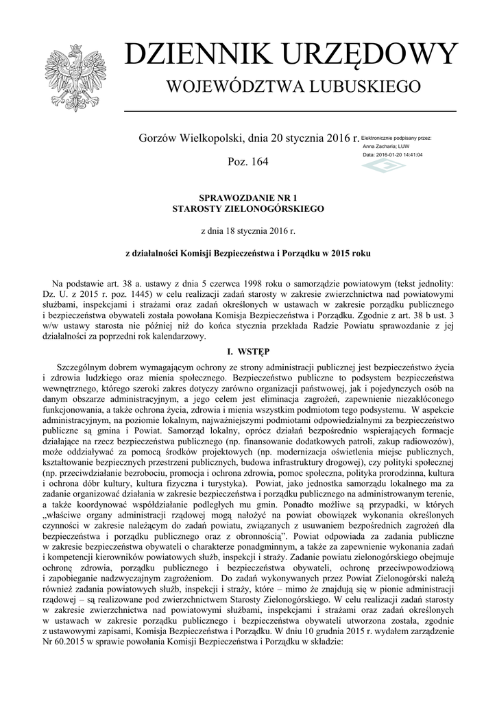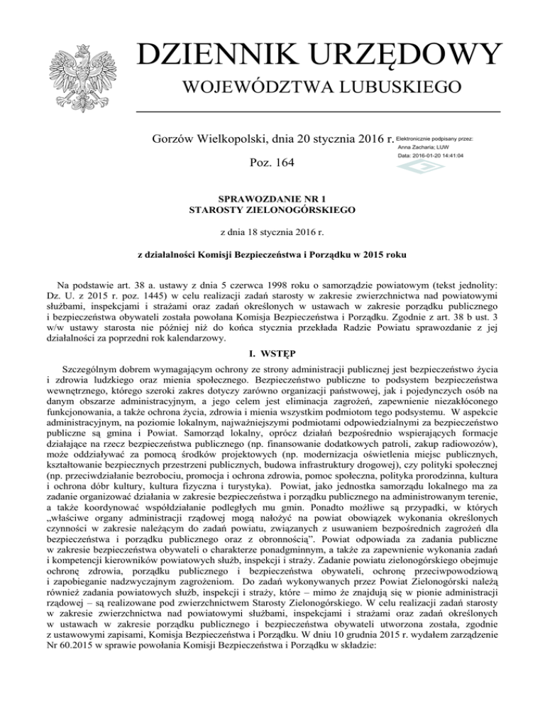 DZIENNIK URZĘDOWY WOJEWÓDZTWA LUBUSKIEGO Gorzów Wielkopolski, dnia 20 stycznia 2016 r. Elektronicznie podpisany przez: Anna Zacharia; LUW Poz. 164 Data: 2016-01-20 14:41:04 SPRAWOZDANIE NR 1 STAROSTY ZIELONOGÓRSKIEGO z dnia 18 stycznia 2016 r. z działalności Komisji Bezpieczeństwa i Porządku w 2015 roku Na podstawie art. 38 a. ustawy z dnia 5 czerwca 1998 roku o samorządzie powiatowym (tekst jednolity: Dz. U. z 2015 r. poz. 1445) w celu realizacji zadań starosty w zakresie zwierzchnictwa nad powiatowymi służbami, inspekcjami i strażami oraz zadań określonych w ustawach w zakresie porządku publicznego i bezpieczeństwa obywateli została powołana Komisja Bezpieczeństwa i Porządku. Zgodnie z art. 38 b ust. 3 w/w ustawy starosta nie później niż do końca stycznia przekłada Radzie Powiatu sprawozdanie z jej działalności za poprzedni rok kalendarzowy. I. WSTĘP Szczególnym dobrem wymagającym ochrony ze strony administracji publicznej jest bezpieczeństwo życia i zdrowia ludzkiego oraz mienia społecznego. Bezpieczeństwo publiczne to podsystem bezpieczeństwa wewnętrznego, którego szeroki zakres dotyczy zarówno organizacji państwowej, jak i pojedynczych osób na danym obszarze administracyjnym, a jego celem jest eliminacja zagrożeń, zapewnienie niezakłóconego funkcjonowania, a także ochrona życia, zdrowia i mienia wszystkim podmiotom tego podsystemu. W aspekcie administracyjnym, na poziomie lokalnym, najważniejszymi podmiotami odpowiedzialnymi za bezpieczeństwo publiczne są gmina i Powiat. Samorząd lokalny, oprócz działań bezpośrednio wspierających formacje działające na rzecz bezpieczeństwa publicznego (np. finansowanie dodatkowych patroli, zakup radiowozów), może oddziaływać za pomocą środków projektowych (np. modernizacja oświetlenia miejsc publicznych, kształtowanie bezpiecznych przestrzeni publicznych, budowa infrastruktury drogowej), czy polityki społecznej (np. przeciwdziałanie bezrobociu, promocja i ochrona zdrowia, pomoc społeczna, polityka prorodzinna, kultura i ochrona dóbr kultury, kultura fizyczna i turystyka). Powiat, jako jednostka samorządu lokalnego ma za zadanie organizować działania w zakresie bezpieczeństwa i porządku publicznego na administrowanym terenie, a także koordynować współdziałanie podległych mu gmin. Ponadto możliwe są przypadki, w których „właściwe organy administracji rządowej mogą nałożyć na powiat obowiązek wykonania określonych czynności w zakresie należącym do zadań powiatu, związanych z usuwaniem bezpośrednich zagrożeń dla bezpieczeństwa i porządku publicznego oraz z obronnością”. Powiat odpowiada za zadania publiczne w zakresie bezpieczeństwa obywateli o charakterze ponadgminnym, a także za zapewnienie wykonania zadań i kompetencji kierowników powiatowych służb, inspekcji i straży. Zadanie powiatu zielonogórskiego obejmuje ochronę zdrowia, porządku publicznego i bezpieczeństwa obywateli, ochronę przeciwpowodziową i zapobieganie nadzwyczajnym zagrożeniom. Do zadań wykonywanych przez Powiat Zielonogórski należą również zadania powiatowych służb, inspekcji i straży, które – mimo że znajdują się w pionie administracji rządowej – są realizowane pod zwierzchnictwem Starosty Zielonogórskiego. W celu realizacji zadań starosty w zakresie zwierzchnictwa nad powiatowymi służbami, inspekcjami i strażami oraz zadań określonych w ustawach w zakresie porządku publicznego i bezpieczeństwa obywateli utworzona została, zgodnie z ustawowymi zapisami, Komisja Bezpieczeństwa i Porządku. W dniu 10 grudnia 2015 r. wydałem zarządzenie Nr 60.2015 w sprawie powołania Komisji Bezpieczeństwa i Porządku w składzie: Dziennik Urzędowy Województwa Lubuskiego –2– Poz. 164 1) Przewodniczący – Starosta Zielonogórski – Dariusz Wróblewski 2) Radny Powiatu Zielonogórskiego – Czesław Hołołub 3) Radny Powiatu Zielonogórskiego – Romuald Malinowski 4) Burmistrz Czerwieńska – Piotr Iwanus 5) Burmistrz Kargowej – Jerzy Fabiś 6) Dyrektor Powiatowego Centrum Pomocy Rodzinie – Anna Gołębska 7) Komendant Miejski Policji w Zielonej Górze – Andrzej Kostka 8) Naczelnik Wydziału Ruchu Drogowego Komendy Miejskiej Policji w Zielonej Górze – Jarosław Tchorowski Do pracy komisji bezpieczeństwa z głosem doradczym powołani zostali: 1) Dyrektor Powiatowego Urzędu Pracy - Edmund Prekurat 2) Komenda Państwowej Straży Pożarnej w Zielonej Górze – Dariusz Mach 3) Państwowy Powiatowy Inspektor Sanitarny – Tomasz Janik 4) Powiatowy Lekarz Weterynarii – Czesław Kochajkiewicz 5) Inspektor Starostwa Powiatowego ds. obronnych, obrony cywilnej i zarządzania kryzysowego – Zygmunt Ostrowski 6) Prokurator (wskazany przez właściwego prokuratora okręgowego) – Prokurator Rejonowy w Zielonej Górze Pan Robert Kmiecik. Do zadań ww. komisji należy: 1) ocena zagrożeń porządku publicznego i bezpieczeństwa obywateli na terenie powiatu zielonogórskiego; 2) opiniowanie pracy Policji i innych powiatowych służb, inspekcji i straży, a także jednostek organizacyjnych wykonujących na terenie powiatu zielonogórskiego zadania z zakresu porządku publicznego i bezpieczeństwa obywateli; 3) przygotowywanie projektu powiatowego programu zapobiegania przestępczości oraz porządku publicznego i bezpieczeństwa obywateli; 4) opiniowanie projektów innych programów współdziałania Policji i innych powiatowych służb, inspekcji i straży oraz jednostek organizacyjnych wykonujących na terenie powiatu zielonogórskiego zadania z zakresu porządku publicznego i bezpieczeństwa obywateli; 5) opiniowanie projektu budżetu powiatu zielonogórskiego – w zakresie, o którym mowa w pkt 1 (Dział 754 – Bezpieczeństwo publiczne i ochrona przeciwpożarowa); 6) opiniowanie projektów aktów prawa miejscowego i innych dokumentów w sprawach związanych z wykonywaniem zadań, o których mowa w pkt 1, 2 i 4; 7) opiniowanie, zlecon