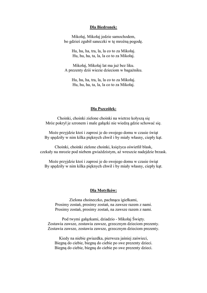 Dla Biedronek: Mikołaj, Mikołaj jedzie samochodem, bo gdzieś zgubił saneczki w tę mroźną pogodę. Hu, hu, ha, tra, la, la co to za Mikołaj. Hu, hu, ha, ta, la, la co to za Mikołaj. Mikołaj, Mikołaj lat ma już bez liku. A prezenty dziś wiezie dzieciom w bagażniku. Hu, hu, ha, tra, la, la co to za Mikołaj. Hu, hu, ha, ta, la, la co to za Mikołaj. Dla Pszczółek: Choinki, choinki zielone choinki na wietrze kołyszą się Mróz pokrył je szronem i male gałązki nie wiedzą gdzie schować się. Może przyjdzie ktoś i zaprosi je do swojego domu w czasie świąt By spędziły w nim kilka pięknych chwil i by miały własny, ciepły kąt. Choinki, choinki zielone choinki, księżyca oświetlił blask, czekały na mrozie pod niebem gwiaździstym, aż wreszcie nadejdzie brzask. Może przyjdzie ktoś i zaprosi je do swojego domu w czasie świąt By spędziły w nim kilka pięknych chwil i by miały własny, ciepły kąt. Dla Motylków: Zielona choineczko, pachnąca igiełkami, Prosimy zostań, prosimy zostań, na zawsze razem z nami. Prosimy zostań, prosimy zostań, na zawsze razem z nami. Pod twymi gałązkami, dziadzio - Mikołaj Święty. Zostawia zawsze, zostawia zawsze, grzecznym dzieciom prezenty. Zostawia zawsze, zostawia zawsze, grzecznym dzieciom prezenty. Kiedy na niebie gwiazdka, pierwsza jaśniej zaświeci, Biegną do ciebie, biegną do ciebie po swe prezenty dzieci. Biegną do ciebie, biegną do ciebie po swe prezenty dzieci. Dla Ślimaczków: Gdy w pokoju wyrośnie choinka, Łańcuszkami, bombkami zaświeci. Ref.: To znaczy, że już Święta, Że już blisko kolęda, Że Mikołaj przyjedzie do dzieci. Hej kolęda, kolęda. Gdy opłatek już leży na stole, Pierwsza gwiazdka zabłyśnie na niebie. To znaczy, że już Święta, Że już blisko kolęda, Że Mikołaj przyjedzie do Ciebie. Hej kolęda, kolęda. Gdy upieką się słodkie makowce I głos dzwonka z daleka zawoła. To znaczy, że już Święta, Że już blisko kolęda, I za drzwiami już stoi Mikołaj. Hej kolęda, kolęda