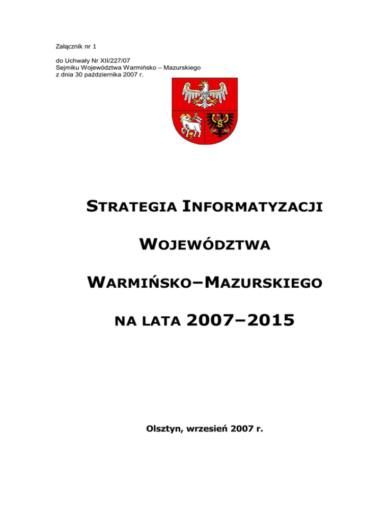 Załącznik nr 1 do Uchwały Nr XII/227/07 Sejmiku Województwa Warmińsko – Mazurskiego z dnia 30 października 2007 r. STRATEGIA INFORMATYZACJI WOJEWÓDZTWA WARMIŃSKO–MAZURSKIEGO NA LATA 2007–2015 Olsztyn, wrzesień 2007 r. Spis treści I. Wstęp ...................................................................................................................3 II. Wprowadzenie .......................................................................................................4 1. 2. 3. III. Zewnętrzne uwarunkowania Strategii.......................................................................8 1. 2. IV. Infrastruktura teleinformatyczna .....................................................................13 Umiejętności .................................................................................................28 Treści oraz usługi dostępne drogą elektroniczną ...............................................31 Projekty planowane........................................................................................40 Analiza SWOT ......................................................................................................43 1. 2. 3. VI. Europejskie dokumenty programowe .................................................................8 Krajowe dokumenty programowe ....................................................................10 Obecny stan rozwoju społeczeństwa informacyjnego w województwie warmińsko-mazurskim ..........................................................................................13 1. 2. 3. 4. V. Ramy strategiczne ...........................................................................................4 Społeczeństwo informacyjne .............................................................................5 Proces budowy społeczeństwa informacyjnego ...................................................6 Infrastruktura ................................................................................................43 Umiejętności .................................................................................................44 Zasoby online i usługi elektroniczne.................................................................45 Rozstrzygnięcia strategiczne..................................................................................46 1. 2. 3. 4. Wizja rozwoju................................................................................................46 Priorytety i cele strategiczne ...........................................................................46 Koncepcja realizacji celów strategicznych.........................................................48 Spójność zewnętrzna Strategii.........................................................................64 VII. WdroŜenie Strategii ..............................................................................................67 1. 2. 3. 4. Aparat instytucjonalny wdraŜania Strategii .......................................................67 Monitoring i wskaźniki ....................................................................................68 Ewaluacja realizacji Strategii ...........................................................................71 Aktualizacja Strategii......................................................................................72 VIII. Załączniki ............................................................................................................74 1. 2. 3. 4. 5. 6. 7. Propozycje projektów .....................................................................................74 Ramy finansowe wdraŜania Strategii................................................................77 Słownik pojęć ................................................................................................83 Otoczenie prawne projektów z zakresu społeczeństwa informacyjnego ...............86 Raport z konsultacji społecznych .....................................................................96 Spis rysunków ...............................................................................................98 Spis tabel ......................................................................................................98 I. Wstęp „Strategia informatyzacji województwa warmińsko–mazurskiego na lata 2007–2015” jest dokumentem wytyczającym cele i kierunki informatyzacji województwa. Niniejsza Strategia bazuje na innych dokumentach strategicznych – lokalnych, polskich i europejskich, o których mowa w treści. Daje ona wytyczne do realizacji zadań związanych z rozwojem społeczeństwa informacyjnego w perspektywie krótko– i długoterminowej. Strona 3 z 98 II. 1. Wprowadzenie Ramy strategiczne W marcu 2000 r. kraje Unii Europejskiej podjęły decyzję o realizacji strategicznego planu „eEurope”, intensyfikującego rozwój społeczeństwa informacyjnego poprzez inwestycje w technologie komunikacji i informacji, wspieranie współpracy gospodarki i nauki, tworzenie systemów informacji publicznej oraz powszechną edukację społeczeństw. W Polsce została wtedy opracowana „Strategia Informatyzacji Rzeczypospolitej Polskiej – ePolska”, która określiła priorytety informatyzacji naszego kraju i obecnie jest w realizacji. Polityka ta będzie kontynuowana w nadchodzącym dziesięcioleciu. W czerwcu 2005 r. Komisja Europejska zaproponowała nowe ramy strategiczne, nazwane „i2010 – Europejskie społeczeństwo informacyjne do 2010 r.”, zmierzające do rozwoju gospodarczego i poprawy jakości Ŝycia poprzez wykorzystanie technologii informatycznych i telekomunikacyjnych (ICT). Natomiast na poziomie krajowym powstał dokument strategiczny „Strategia kierunkowa rozwoju informatyzacji Polski w latach 2007-2013 oraz perspektywiczna prognoza transformacji społeczeństwa informacyjnego do roku 2020”. W województwie warmińsko–mazurskim w 2004 r. opracowano „Strategię Informatyzacji Województwa W