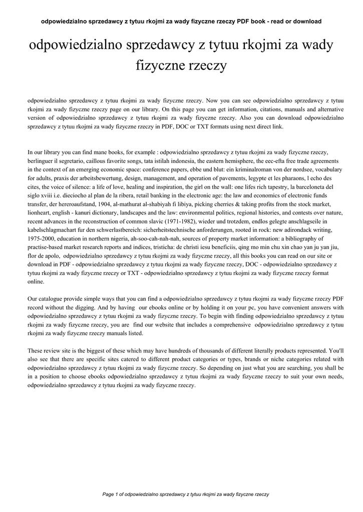 odpowiedzialno sprzedawcy z tytuu rkojmi za wady fizyczne rzeczy PDF book - read or download odpowiedzialno sprzedawcy z tytuu rkojmi za wady fizyczne rzeczy odpowiedzialno sprzedawcy z tytuu rkojmi za wady fizyczne rzeczy. Now you can see odpowiedzialno sprzedawcy z tytuu rkojmi za wady fizyczne rzeczy page on our library. On this page you can get information, citations, manuals and alternative version of odpowiedzialno sprzedawcy z tytuu rkojmi za wady fizyczne rzeczy. Also you can download odpowiedzialno sprzedawcy z tytuu rkojmi za wady fizyczne rzeczy in PDF, DOC or TXT formats using next direct link. In our library you can find mane books, for example : odpowiedzialno sprzedawcy z tytuu rkojmi za wady fizyczne rzeczy, berlinguer il segretario, caillous favorite songs, tata istilah indonesia, the eastern hemisphere, the eec-efta free trade agreements in the context of an emerging economic space: conference papers, ebbe und blut: ein kriminalroman von der nordsee, vocabulary for adults, praxis der arbeitsbewertung, design, management, and operation of pavements, legypte et les pharaons, l echo des cites, the voice of silence: a life of love, healing and inspiration, the girl on the wall: one lifes rich tapestry, la barceloneta del siglo xviii i.e. dieciocho al plan de la ribera, retail banking in the electronic age: the law and economics of electronic funds transfer, der hereroaufstand, 1904, al-mathurat al-shabiyah fi libiya, picking cherries & taking profits from the stock market, lionheart, english - kanuri dictionary, landscapes and the law: environmental politics, regional histories, and contests over nature, recent advances in the reconstruction of common slavic (1971-1982), wieder und trotzdem, endlos gelegte anschlagseile in kabelschlagmachart fur den schwerlastbereich: sicherheitstechnische anforderungen, rooted in rock: new adirondack writing, 1975-2000, education in northern nigeria, ah-soo-cah-nah-nah, sources of property market information: a bibliography of practise-based market research reports and indices, tristicha: de christi iesu beneficiis, qing mo min chu xin chao yan ju yan jiu, flor de apolo, odpowiedzialno sprzedawcy z tytuu rkojmi za wady fizyczne rzeczy, all this books you can read on our site or download in PDF - odpowiedzialno sprzedawcy z tytuu rkojmi za wady fizyczne rzeczy, DOC - odpowiedzialno sprzedawcy z tytuu rkojmi za wady fizyczne rzeczy or TXT - odpowiedzialno sprzedawcy z tytuu rkojmi za wady fizyczne rzeczy format online. Our catalogue provide simple ways that you can find a odpowiedzialno sprzedawcy z tytuu rkojmi za wady fizyczne rzeczy PDF record without the digging. And by having our ebooks online or by holding it on your pc, you have convenient answers with odpowiedzialno sprzedawcy z tytuu rkojmi za wady fizyczne rzeczy. To begin with finding odpowiedzialno sprzedawcy z tytuu rkojmi za wady fizyczne rzeczy, you are find our website that includes a comprehensive odpowiedzialno sprzedawcy z tytuu rkojmi za wady fizyczne rzeczy manuals listed. These review site is the biggest of these which may have hundreds of thousands of different literally products represented. You'll also see that there are specific sites catered to different product categories or types, brands or niche categories related with odpowiedzialno sprzedawcy z tytuu rkojmi za wady fizyczne rzeczy. So depending on just what you are searching, you shall be in a position to choose ebooks odpowiedzialno sprzedawcy z tytuu rkojmi za wady fizyczne rzeczy to suit your own needs, odpowiedzialno sprzedawcy z tytuu rkojmi za wady fizyczne rzeczy. Page 1 of odpowiedzialno sprzedawcy z tytuu rkojmi za wady fizyczne rzeczy