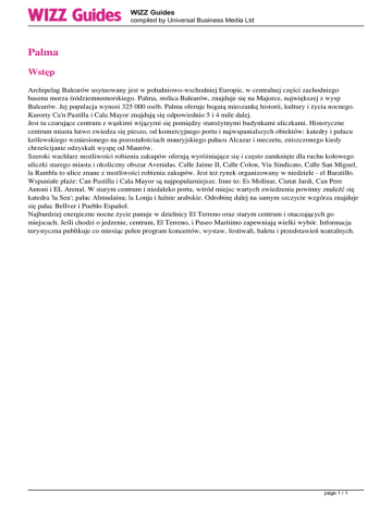 WIZZ Guides compiled by Universal Business Media Ltd Palma Wstęp Archipelag Balearów usytuowany jest w południowo-wschodniej Europie, w centralnej części zachodniego basenu morza śródziemnomorskiego. Palma, stolica Balearów, znajduje się na Majorce, największej z wysp Balearów. Jej populacja wynosi 325 000 osób. Palma oferuje bogatą mieszankę historii, kultury i życia nocnego. Kurorty Ca'n Pastilla i Cala Mayor znajdują się odpowiednio 5 i 4 mile dalej. Jest tu czarujące centrum z wąskimi wijącymi się pomiędzy starożytnymi budynkami uliczkami. Historyczne centrum miasta łatwo zwiedza się pieszo, od komercyjnego portu i najwspanialszych obiektów: katedry i pałacu królewskiego wzniesionego na pozostałościach mauryjskiego pałacu Alcazar i meczetu, zniszczonego kiedy chrześcijanie odzyskali wyspę od Maurów. Szeroki wachlarz możliwości robienia zakupów oferują wyróżniające się i często zamknięte dla ruchu kołowego uliczki starego miasta i okoliczny obszar Avenidas. Calle Jaime II, Calle Colon, Via Sindicato, Calle San Miguel, la Rambla to ulice znane z możliwości robienia zakupów. Jest też rynek organizowany w niedziele - el Baratillo. Wspaniałe plaże: Can Pastilla i Cala Mayor są najpopularniejsze. Inne to: Es Molinar, Ciutat Jardi, Can Pere Antoni i EL Arenal. W starym centrum i niedaleko portu, wśród miejsc wartych zwiedzenia powinny znaleźć się katedra 'la Seu'; pałac Almudaina; la Lonja i łaźnie arabskie. Odrobinę dalej na samym szczycie wzgórza znajduje się pałac Bellver i Pueblo Español. Najbardziej energiczne nocne życie panuje w dzielnicy El Terreno oraz starym centrum i otaczających go miejscach. Jeśli chodzi o jedzenie, centrum, El Terreno, i Paseo Maritimo zapewniają wielki wybór. Informacja turystyczna publikuje co miesiąc pełen program koncertów, wystaw, festiwali, baletu i przedstawień teatralnych. page 1 / 1