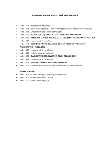FILMOWY PIKNIK BANKU BGŻ BNP PARIBAS • godz. 13:00 – rozpoczęcie aktywności • godz. 13:05 - powitanie uczestników i omówienie/zaproszenie do zaplanowanych atrakcji • godz. 13:10 - uroczyste otwarcie strefy z atrakcjami • godz. 13:20 - BAJKA JAK SIĘ PATRZY, CZYLI FILMOWE KALAMBURY • godz. 14:00 - FILMOWE POSZUKIWANIE, CZYLI TROPIENIE BAJKOWYCH POSTACI – • godz. 14:20 - relacja ze stref z atrakcjami • godz. 14:40 - FILMOWE PODRÓŻOWANIE, CZYLI RODZINNE PAKOWANIE WAKACYJNYCH PLECAKÓW • godz. 15:00 - relacja ze stref z atrakcjami • godz. 15:20 - pokaz magicznych sztuczek • godz. 16:00 - BAŚNIOWE DOPASOWANIE, CZYLI GIGA KLOCKI • godz. 16:20 - relacja ze stref z atrakcjami • godz. 16:40 - KRĘCENIE FILMOWE, CZYLI HULA HOP • godz. 17:00 - przerwa techniczna – przygotowanie strefy na seanse filmowe Seanse filmowe: • godz. 18:00 – I seans filmowy – „Pingwiny z Madagaskaru” • godz. 20.00 – II seans filmowy – „Skyfall” • godz. 22.00 – zakończenie projekcji