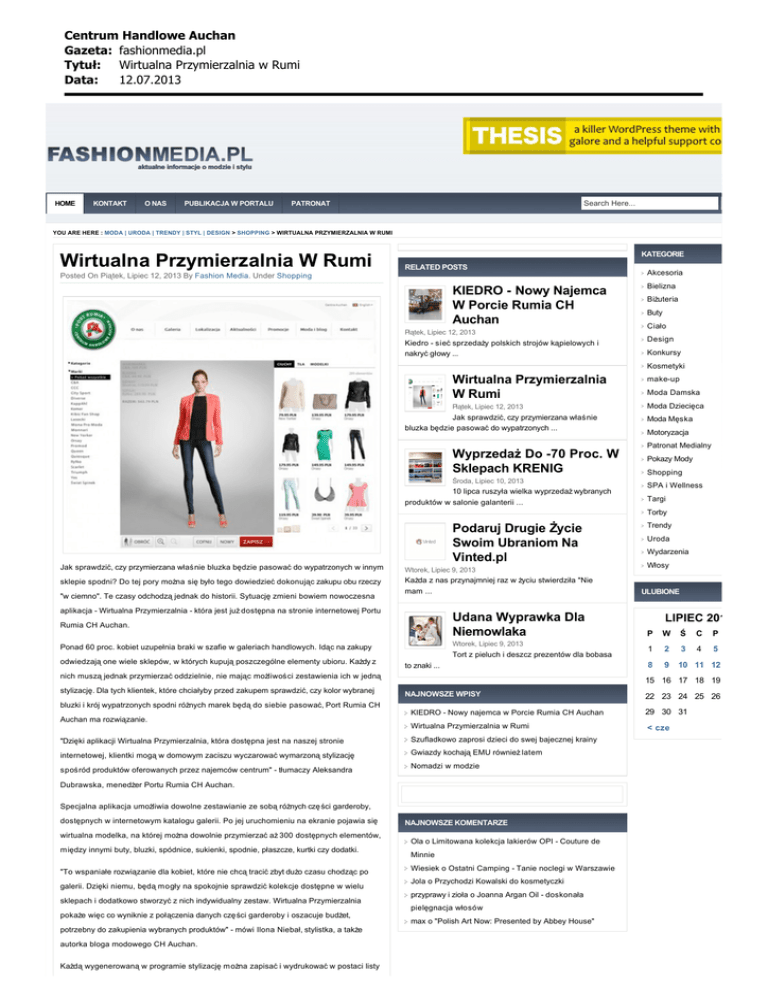 Centrum Handlowe Auchan Gazeta: fashionmedia.pl Tytu³: Wirtualna Przymierzalnia w Rumi Data: 12.07.2013 HOME KONTAKT O NAS PUBLIKACJA W PORTALU Search Here... PATRONAT YOU ARE HERE : MODA | URODA | TRENDY | STYL | DESIGN > SHOPPING > WIRTUALNA PRZYMIERZALNIA W RUMI Wirtualna Przymierzalnia W Rumi KATEGORIE RELATED POSTS Posted On Piątek, Lipiec 12, 2013 By Fashion Media. Under Shopping KIEDRO - Nowy Najemca W Porcie Rumia CH Auchan Piątek, Lipiec 12, 2013 Akcesoria Bielizna Biżuteria Buty Ciało Kiedro - sieć sprzedaży polskich strojów kąpielowych i Design nakryć głowy ... Konkursy Kosmetyki Wirtualna Przymierzalnia W Rumi make-up Piątek, Lipiec 12, 2013 Moda Dziecięca Jak sprawdzić, czy przymierzana właśnie Moda Męska bluzka będzie pasować do wypatrzonych ... Wyprzedaż Do -70 Proc. W Sklepach KRENIG Środa, Lipiec 10, 2013 10 lipca ruszyła wielka wyprzedaż wybranych produktów w salonie galanterii ... Moda Damska Motoryzacja Patronat Medialny Pokazy Mody Shopping SPA i Wellness Targi Torby Podaruj Drugie Życie Swoim Ubraniom Na Vinted.pl Jak sprawdzić, czy przymierzana właśnie bluzka będzie pasować do wypatrzonych w innym Wtorek, Lipiec 9, 2013 sklepie spodni? Do tej pory można się było tego dowiedzieć dokonując zakupu obu rzeczy Każda z nas przynajmniej raz w życiu stwierdziła "Nie "w ciemno". Te czasy odchodzą jednak do historii. Sytuację zmieni bowiem nowoczesna mam ... aplikacja - Wirtualna Przymierzalnia - która jest już dostępna na stronie internetowej Portu Wtorek, Lipiec 9, 2013 Ponad 60 proc. kobiet uzupełnia braki w szafie w galeriach handlowych. Idąc na zakupy odwiedzają one wiele sklepów, w których kupują poszczególne elementy ubioru. Każdy z Tort z pieluch i deszcz prezentów dla bobasa to znaki ... nich muszą jednak przymierzać oddzielnie, nie mając możliwości zestawienia ich w jedną stylizację. Dla tych klientek, które chciałyby przed zakupem sprawdzić, czy kolor wybranej Uroda Wydarzenia Włosy ULUBIONE Udana Wyprawka Dla Niemowlaka Rumia CH Auchan. Trendy LIPIEC 2013 P W Ś C P 1 2 3 4 5 8 9 10 11 12 15 16 17 18 19 NAJNOWSZE WPISY 22 23 24 25 26 bluzki i krój wypatrzonych spodni różnych marek będą do siebie pasować, Port Rumia CH Auchan ma rozwiązanie. KIEDRO - Nowy najemca w Porcie Rumia CH Auchan 29 30 31 Wirtualna Przymierzalnia w Rumi < cze "Dzięki aplikacji Wirtualna Przymierzalnia, która dostępna jest na naszej stronie Szufladkowo zaprosi dzieci do swej bajecznej krainy internetowej, klientki mogą w domowym zaciszu wyczarować wymarzoną stylizację Gwiazdy kochają EMU również latem spośród produktów oferowanych przez najemców centrum" - tłumaczy Aleksandra Nomadzi w modzie Dubrawska, menedżer Portu Rumia CH Auchan. Specjalna aplikacja umożliwia dowolne zestawianie ze sobą różnych czę ści garderoby, dostępnych w internetowym katalogu galerii. Po jej uruchomieniu na ekranie pojawia się wirtualna modelka, na której można dowolnie przymierzać aż 300 dostępnych elementów, m iędzy innymi buty, bluzki, spódnice, sukienki, spodnie, płaszcze, kurtki czy dodatki. "To wspaniałe rozwiązanie dla kobiet, które nie chcą tracić zbyt dużo czasu chodząc po galerii. Dzięki niemu, będą mogły na spokojnie sprawdzić kolekcje dostępne w wielu sklepach i dodatkowo stworzyć z nich indywidualny zestaw. Wirtualna Przymierzalnia NAJNOWSZE KOMENTARZE Ola o Limitowana kolekcja lakierów OPI - Couture de Minnie Wiesiek o Ostatni Camping - Tanie noclegi w Warszawie Jola o Przychodzi Kowalski do kosmetyczki przyprawy i zioła o Joanna Argan Oil - doskonała pielęgnacja włosów pokaże więc co wyniknie z połączenia danych czę ści garderoby i oszacuje budżet, potrzebny do zakupienia wybranych produktów" - mówi Ilona Niebał, stylistka, a także autorka bloga modowego CH Auchan. Każdą wygenerowaną w programie stylizację m ożna zapisać i wydrukować w postaci listy max o "Polish Art Now: Presented by Abbey House" Centrum Handlowe Auchan Gazeta: fashionmedia.pl Tytu³: Wirtualna Przymierzalnia w Rumi Data: 12.07.2013 wybranych produktów do kupienia w sklepach galerii. Dzięki temu, skomponowany wirtualnie zestaw będzie można łatwo i szybko skompletować podczas zakupów w Porcie Rumia CH Auchan. Klientek nie zaskoczą ceny, gdyż program wygeneruje informację o koszcie całkowitym planowanych zakupów. Aplikacja "Wirtualna przymierzalnia" dostępna jest na stronie internetowej Portu Rumia CH Auchan - www.portrumia.pl/przymierzalnia. Port Rumia Centrum Handlowe Auchan mieści się przy ulicy Grunwaldzkiej 108 w Rumi. Przez 7 dni w tygodniu klienci galerii mają do dyspozycji ponad 80 sklepów znanych i wiodących na rynku marek, które kompleksowo spełniają potrzeby całej rodziny. W ofercie galerii znajdują s ię butiki odzieżowe, obuwnicze, z wyposażeniem i aranżacją wnętrz. Całości oferty dopełniają punkty usługowe oraz restauracje i kawiarnie, a także plac zabaw dla dzieci. Przy Porcie Rumia mieszczą s ię: hipermarket Auchan, Leroy Merlin, Decathlon oraz stacja benzynowa. Galeria jest czynna od poniedziałku do soboty w godzinach 9:00 - 21:00, natomiast w niedzielę od 9:30 do 20.00. Centrum Handlowe posiada blisko 2000 miejsc parkingowych, w tym 30 dla niepełnosprawnych. Zostało otwarte w 2007 roku. Więcej informacji na stronie internetowej www.portrumia.pl. Tags: Centrum Handlowe Auchan, Port Rumia Leave a Reply Name (Required) E-Mail (Required) Website (Optional) 5 6 Submit Comment ← SZUFLADKOWO ZAPROSI DZIECI DO SWEJ BAJECZNEJ KRAINY Kontakt O Nas Publikacja w Portalu KIEDRO - NOWY NAJEMCA W PORCIE RUMIA CH AUCHAN → Patronat Copyright (c) 2013. All Rights Reserved. Wideo Theme Is Released By The Debtor Help Site Get Federal Debt Relief Grants From The Credit Card Experts