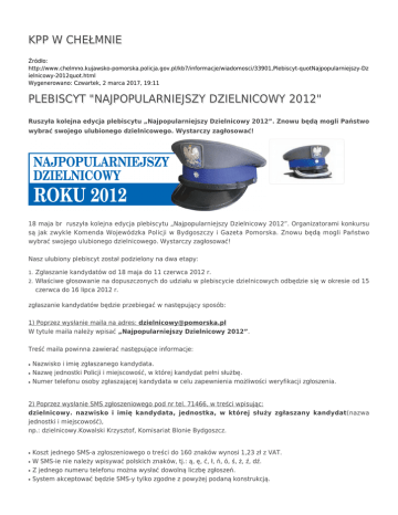 KPP W CHEŁMNIE Źródło: http://www.chelmno.kujawsko-pomorska.policja.gov.pl/kb7/informacje/wiadomosci/33901,Plebiscyt-quotNajpopularniejszy-Dz ielnicowy-2012quot.html Wygenerowano: Czwartek, 2 marca 2017, 19:11 PLEBISCYT "NAJPOPULARNIEJSZY DZIELNICOWY 2012" Ruszyła kolejna edycja plebiscytu „Najpopularniejszy Dzielnicowy 2012”. Znowu będą mogli Państwo wybrać swojego ulubionego dzielnicowego. Wystarczy zagłosować! 18 maja br ruszyła kolejna edycja plebiscytu „Najpopularniejszy Dzielnicowy 2012”. Organizatorami konkursu są jak zwykle Komenda Wojewódzka Policji w Bydgoszczy i Gazeta Pomorska. Znowu będą mogli Państwo wybrać swojego ulubionego dzielnicowego. Wystarczy zagłosować! Nasz ulubiony plebiscyt został podzielony na dwa etapy: 1. 2. Zgłaszanie kandydatów od 18 maja do 11 czerwca 2012 r. Właściwe głosowanie na dopuszczonych do udziału w plebiscycie dzielnicowych odbędzie się w okresie od 15 czerwca do 16 lipca 2012 r. zgłaszanie kandydatów będzie przebiegać w następujący sposób: 1) Poprzez wysłanie maila na adres: [email protected] W tytule maila należy wpisać „Najpopularniejszy Dzielnicowy 2012”. Treść maila powinna zawierać następujące informacje: ● ● ● Nazwisko i imię zgłaszanego kandydata. Nazwę jednostki Policji i miejscowość, w której kandydat pełni służbę. Numer telefonu osoby zgłaszającej kandydata w celu zapewnienia możliwości weryfikacji zgłoszenia. 2) Poprzez wysłanie SMS zgłoszeniowego pod nr tel. 71466, w treści wpisując: dzielnicowy. nazwisko i imię kandydata, jednostka, w której służy zgłaszany kandydat(nazwa jednostki i miejscowość), np.: dzielnicowy.Kowalski Krzysztof, Komisariat Blonie Bydgoszcz. ● ● ● ● Koszt jednego SMS-a zgłoszeniowego o treści do 160 znaków wynosi 1,23 zł z VAT. W SMS-ie nie należy wpisywać polskich znaków, tj.: ą, ę, ć, ł, ń, ó, ś, ż, ź, dź. Z jednego numeru telefonu można wysłać dowolną liczbę zgłoszeń. System akceptować będzie SMS-y tylko zgodne z powyżej podaną konstrukcją. ● Organizatorzy nie ponoszą odpowiedzialności za wysłanie SMS-a o niepoprawnej treści i z tego tytułu nie zwracają ewentualnych kosztów. Tak jak co roku i tym razem w Plebiscycie nie mogą brać udziału policjanci, którzy są karani dyscyplinarnie oraz wobec których toczy się postępowanie dyscyplinarne lub zostanie ono wszczęte w trakcie trwania Plebiscytu. Szczegóły zasad Plebiscytu zamieszamy w załączonym do tej informacji regulaminie. Regulamin Plebiscytu „Najpopularniejszy Dzielnicowy 2012” Wśród czytelników Gazety Pomorskiej głosujących w Plebiscycie tradycyjnie zostaną rozlosowane atrakcyjne nagrody! Gorąco zapraszamy Państwa do udziału w zabawie! Wyniki rywalizacji będzie można śledzić na bieżąco na stronie internetowej: Mamy nadzieję, że tegoroczna edycja Plebiscytu będzie się cieszyć co najmniej takim samym powodzeniem jak w ubiegłym roku, kiedy wysłali Państwo ponad 24 tysiące SMS-ów na swoich dzielnicowych. podkom. Marek Kolinski Wydział Prewencji KWP w Bydgoszczy Autor: red1.kppc Publikacja: red1.kppc Ocena: 0/5 (0) Tweetnij