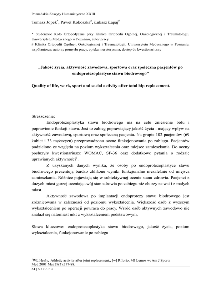 Poznańskie Zeszyty Humanistyczne XXIII Tomasz Jopek*, Paweł Kokoszka#, Łukasz Łapaj# * Studenckie Koło Ortopedyczne przy Klinice Ortopedii Ogólnej, Onkologicznej i Traumatologii, Uniwersytetu Medycznego w Poznaniu, autor pracy # Klinika Ortopedii Ogólnej, Onkologicznej i Traumatologii, Uniwersytetu Medycznego w Poznaniu, współautorzy, autorzy pomysłu pracy, opieka merytoryczna, dostęp do kwestionariuszy „Jakość życia, aktywność zawodowa, sportowa oraz społeczna pacjentów po endoprotezoplastyce stawu biodrowego” Quality of life, work, sport and social activity after total hip replacement. Streszczenie: Endoprotezoplastyka stawu biodrowego ma na celu zniesienie bólu i poprawienie funkcji stawu. Jest to zabieg poprawiający jakość życia i mający wpływ na aktywność zawodową, sportową oraz społeczną pacjenta. Na grupie 102 pacjentów (69 kobiet i 33 mężczyzn) przeprowadzono ocenę funkcjonowania po zabiegu. Pacjentów podzielono ze względu na poziom wykształcenia oraz miejsce zamieszkania. Do oceny posłużyły kwestionariusze WOMAC, SF-36 oraz dodatkowe pytania o rodzaje uprawianych aktywności1. Z uzyskanych danych wynika, że osoby po endoprotezoplastyce stawu biodrowego prezentują bardzo zbliżone wyniki funkcjonalne niezależnie od miejsca zamieszkania. Różnice pojawiają się w subiektywnej ocenie stanu zdrowia. Pacjenci z dużych miast gorzej oceniają swój stan zdrowia po zabiegu niż chorzy ze wsi i z małych miast. Aktywność zawodowa po implantacji endoprotezy stawu biodrowego jest zróżnicowana w zależności od poziomu wykształcenia. Większość osób z wyższym wykształceniem po operacji powraca do pracy. Wśród osób aktywnych zawodowo nie znalazł się natomiast nikt z wykształceniem podstawowym. Słowa kluczowe: endoprotezoplastyka stawu biodrowego, jakość życia, poziom wykształcenia, funkcjonowanie po zabiegu 1 WL Healy, Athletic activity after joint replacement., [w] R Iorio, MJ Lemos w: Am J Sports Med 2001 Maj 29(3):377-88. 34 | S t r o n a Poznańskie Zeszyty Humanistyczne XXIII Abstract: The main aims of total hip replacement (THR) are elimination of pain and improvement of the joint function. THR improves quality of life, work, sport and social activities. 102 patients (69 females and 33 males) operated in Department of Genereal Orthopeadics, Orthopeadic Oncology and Traumatology in Poznan University of Medical Sciences were asked to fill questionnaires WOMAC and SF-36 and to answer additional questions about types of their activities. Patients were divided in groups depending on their education level and place of living. Patients after total hip replacement have similar functional outcomes regardless the place of living. There were differences in subjective evaluation of health state. Patients, who live in big cities assessed their health state worse than patients from small cities and villages. Professional activity after total hip replacement depends on level of education. Most of the patients with higher education went back to work after the treatment. None of the patients with primary education work after the operation. Key words: total hip replacement, quality of life, education level, function after treatment Wstęp: Totalna endoprotezoplastyka stawu biodrowego jest „złotym standardem” w leczeniu choroby zwyrodnieniowej, wyraźnie poprawiając jakość życia (quality of life)2 i umożliwiając pacjentom powrót do codziennych aktywności. „Endoprotezoplastyka nie jest operacją wykonywaną z powodu bezpośredniego zagrożenia życia. Ma ona na celu przede wszystkim zniesienie bólu i poprawienie funkcji stawu3”. Materiał: Grupę badaną stanowiło 102 chorych operowanych w latach 1995-2011 w Klinice Ortopedii Ogólnej, Onkologicznej i Traumatologii Uniwersytetu Medycznego w Poznaniu. Wśród badanych było 69 kobiet oraz 33 mężczyzn. Średnia wieku wynosiła 56,6 (mężczyźni 56,8, kobiety 56,4). Średnia okresu obserwacji w całej grupie wyniosła 9,2 lata (min. 6 – maks. 15 lat). 11,8% pacjentów posiadało wykształcenie podstawowe, 30,4% wykształcenie zawodowe, 41,2% wykształcenie średnie, a 16,7% wykształcenie wyższe. 2 A. Szczeklik i in.. Choroby wewnętrzne. Stan wiedzy na rok 2010, Medycyna Praktyczna, Kraków 2010, str. 2355. 3 R. Włodarczyk, A. Kiciński, w A. Szulc, W. Marciniak, Wiktora Degi Ortopedia i Rehabilitacja; Wydawnictwo Lekarskie PZWL, Warszawa 2008 Tom II str. 295 35 | S t r o n a Poznańskie Zeszyty Humanistyczne XXIII Metody: Pacjenci wypełnili kwestionariusze WOMAC (Western Ontario and McMaster Universities) i SF-364 oraz odpowiedzieli na dodatkowe pytania o rodzaj uprawianej aktywności po zabiegu5 (jazda na rowerze, spacer, uprawianie ogródka, pływanie), poziom wykształcenia, miejsce zamieszkania oraz współistniejące choroby przewlekłe. Kwestionariusz WOMAC – zawiera pytania dotyczące bólu, sztywności oraz funkcji w chorobie zwyrodnieniowej stawów biodrowych i kolanowych. Służy do oceny stanu funkcjonalnego chorego. Kwestionariusz SF - 36 ocenia poziom jakości życia. Wyniki prezentowane są w postaci ośmiu podskal: funkcjonowanie fizyczne, funkcjonowanie społeczne, ograniczenie roli w odniesieniu do problemów fizycznych, ograniczenie roli w odniesieniu do problemów emocjonalnych, zdrowie psychiczne, witalność, ból oraz ogólna ocena stanu zdrowia. Wyniki ankiety podaje się w wartościach od 0 (najniższy możliwy do uzyskania wynik) do 100 (wynik maksymalny)6. Kwestionariusz SF-36, posiada walidację w języku polskim. W celu przedstawienia rezultatów dokonaliśmy analizy wyników kwestionariusza SF-36 wg miejsca zamieszkania (wieś, małe miasta, duże miasta). 4 M. Kocot-Kępska, Skale oceny bólu. [w] K. Szułdrzyński, Medycyna Praktyczna, 2014; http://www.mp.pl/bol/wytyczne/show.html?id=91404 ; (dostęp 03.04.2014). 5 U. Chatterji, Effect of total hip arthroplasty on recreational and sporting activity. [w] Ashworth MJ, Lewis PL, 