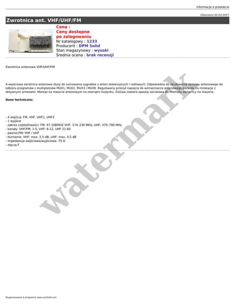 Informacje o produkcie Utworzono 02-03-2017 Zwrotnica ant. VHF/UHF/FM Cena : Ceny dostępne po zalogowaniu Nr katalogowy : 1233 Producent : DPM Solid Stan magazynowy : wysoki Średnia ocena : brak recenzji Zwrotnica antenowa VHF/UHF/FM er m ar k 4-wejściowa zwrotnica antenowa służy do sumowania sygnałów z anten telewizyjnych i radiowych. Odpowiedna do zbudowania zestawu antenowego do odbioru programów z multipleksów MUX1, MUX2, MUX3 i MUX8. Regulowany przesył napięcia do wzmacniacza antenowego pozwala na instalacje z aktywnymi antenami. Montaż na maszcie antenowym na zewnątrz budynku. Zestaw zawiera opaskę zaciskową do montażu zwrotnicy na maszcie. Dane techniczne: w at - 4 wejścia: FM, VHF, UHF1, UHF2 - 1 wyjście - zakres częstotliwości: FM: 47-108MHZ VHF: 174–230 MHz; UHF: 470–790 MHz - kanały: VHF/FM: 1-5, VHF: 6-12, UHF 21-60 - pasmo:FM/ VHF / UHF - tłumienie: VHF: max. 2,5 dB; UHF: max. 4,5 dB - impedancja wejściowa/wyjściowa: 75 Ω - złącza F Wygenerowano w programie www.oscGold.com