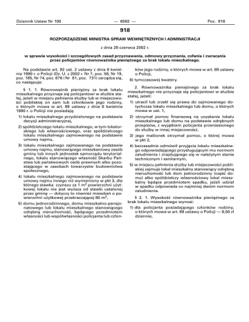 Dziennik Ustaw Nr 100 — 6582 — Poz. 918 918 ROZPORZÑDZENIE MINISTRA SPRAW WEWN¢TRZNYCH I ADMINISTRACJI z dnia 28 czerwca 2002 r. w sprawie wysokoÊci i szczegó∏owych zasad przyznawania, odmowy przyznania, cofania i zwracania przez policjantów równowa˝nika pieni´˝nego za brak lokalu mieszkalnego. Na podstawie art. 92 ust. 2 ustawy z dnia 6 kwietnia 1990 r. o Policji (Dz. U. z 2002 r. Nr 7, poz. 58, Nr 19, poz. 185, Nr 74, poz. 676 i Nr 81, poz. 731) zarzàdza si´, co nast´puje: § 1. 1. Równowa˝nik pieni´˝ny za brak lokalu mieszkalnego przyznaje si´ policjantowi w s∏u˝bie sta∏ej, je˝eli w miejscu pe∏nienia s∏u˝by lub w miejscowoÊci pobliskiej on sam lub cz∏onkowie jego rodziny, o których mowa w art. 89 ustawy z dnia 6 kwietnia 1990 r. o Policji nie posiadajà: 1) lokalu mieszkalnego przydzielonego na podstawie decyzji administracyjnej, 2) spó∏dzielczego lokalu mieszkalnego, w tym lokatorskiego lub w∏asnoÊciowego, oraz spó∏dzielczego lokalu mieszkalnego zajmowanego na podstawie umowy najmu, 3) lokalu mieszkalnego zajmowanego na podstawie umowy najmu, stanowiàcego mieszkaniowy zasób gminy lub innych jednostek samorzàdu terytorialnego, lokalu stanowiàcego w∏asnoÊç Skarbu Paƒstwa lub paƒstwowych osób prawnych albo pozostajàcego w zasobach towarzystw budownictwa spo∏ecznego, 4) lokalu mieszkalnego zajmowanego na podstawie umowy najmu innego ni˝ wymieniony w pkt 3, dla którego stawka czynszu za 1 m2 powierzchni u˝ytkowej lokalu nie jest wy˝sza od stawki ustalonej przez gmin´ — dotyczy to równie˝ mieszkaƒ o powierzchni u˝ytkowej przekraczajàcej 80 m2, 5) domu jednorodzinnego, domu mieszkalno-pensjonatowego lub lokalu mieszkalnego stanowiàcego odr´bnà nieruchomoÊç, b´dàcego przedmiotem w∏asnoÊci lub wspó∏w∏asnoÊci policjanta lub cz∏on- ków jego rodziny, o których mowa w art. 89 ustawy o Policji, 6) tymczasowej kwatery. 2. Równowa˝nika pieni´˝nego za brak lokalu mieszkalnego nie przyznaje si´ policjantowi w s∏u˝bie sta∏ej, je˝eli: 1) utraci∏ lub zrzek∏ si´ prawa do zajmowanego dotychczas lokalu mieszkalnego lub domu, o których mowa w ust. 1, 2) otrzyma∏ pomoc finansowà na uzyskanie lokalu mieszkalnego lub domu na podstawie odr´bnych przepisów, z wyjàtkiem policjanta przeniesionego do s∏u˝by w innej miejscowoÊci, 3) jego ma∏˝onek otrzyma∏ pomoc, o której mowa w pkt 2, 4) bezzasadnie odmówi∏ przyj´cia lokalu mieszkalnego odpowiadajàcego przys∏ugujàcym mu normom zaludnienia i znajdujàcego si´ w nale˝ytym stanie technicznym i sanitarnym, 5) w miejscu pe∏nienia s∏u˝by lub miejscowoÊci pobliskiej zajmuje lokal mieszkalny stanowiàcy odr´bnà nieruchomoÊç lub dom jednorodzinny (cz´Êç domu) albo spó∏dzielczy w∏asnoÊciowy lokal mieszkalny b´dàce przedmiotem spadku, je˝eli udzia∏ w spadku odpowiada co najmniej dwóm normom zaludnienia. § 2. 1. WysokoÊç równowa˝nika pieni´˝nego za brak lokalu mieszkalnego wynosi: 1) dla policjanta posiadajàcego cz∏onków rodziny, o których mowa w art. 89 ustawy o Policji — 9,50 z∏ dziennie, Dziennik Ustaw Nr 100 — 6583 — 2) dla policjanta — 4,75 z∏ dziennie. 2. Kwoty, o których mowa w ust. 1, po dokonaniu corocznej waloryzacji o prognozowany w ustawie bud˝etowej na dany rok wskaênik Êredniorocznego wzrostu cen towarów i us∏ug konsumpcyjnych ogó∏em, podlegajà zaokràgleniu do pe∏nych dziesiàtek groszy. 3. Podstaw´ waloryzacji stanowi kwota równowa˝nika pieni´˝nego za brak lokalu mieszkalnego obowiàzujàca w roku poprzedzajàcym rok, w którym waloryzacja nast´puje. 4. Wyp∏aty równowa˝nika dokonuje w okresach miesi´cznych w∏aÊciwa jednostka organizacyjna Policji. § 3. Ustalenia uprawnieƒ policjanta do otrzymania równowa˝nika pieni´˝nego za brak lokalu mieszkalnego oraz jego wysokoÊci dokonuje si´ na podstawie oÊwiadczenia mieszkaniowego, którego wzór stanowi za∏àcznik do rozporzàdzenia. § 4. W razie zbiegu uprawnieƒ policjanta i jego ma∏˝onka do równowa˝nika pieni´˝nego za brak lokalu mieszkalnego przys∏uguje jeden korzystniejszy równowa˝nik. § 5. Policjant jest obowiàzany niezw∏ocznie zawiadomiç, sk∏adajàc nowe oÊwiadczenie mieszkaniowe, o ka˝dej zmianie majàcej wp∏yw na uprawnienia do otrzymania równowa˝nika pieni´˝nego za brak lokalu mieszkalnego albo na jego wysokoÊç. § 6. Decyzj´ o cofni´ciu uprawnienia do dotychczas przyznanego równowa˝nika wydaje si´, je˝eli policjant przesta∏ spe∏niaç warunki, o których mowa w § 1 ust. 1, lub zmieni∏ si´ jego stan rodzinny. § 7. Decyzj´ o zwrocie wyp∏aconego równowa˝nika pieni´˝nego za brak lokalu mieszkalnego wydaje si´ w przypadku: 1) nienale˝nego pobrania na skutek niepoinformowania o wystàpieniu zmian lub podania nieprawdziwych danych w oÊwiadczeniu, o którym mowa w § 3, majàcych wp∏yw na istnienie uprawnienia do tego równowa˝nika lub na jego wysokoÊç, 2) uprawomocnienia si´ decyzji stwierdzajàcej niewa˝noÊç decyzji o przyznaniu równowa˝nika. § 8. Przepisy rozporzàdzenia stosuje si´ do emeryta i rencisty policyjnego, o których mowa w ustawie z dnia 18 lutego 1994 r. o zaopatrzeniu emerytalnym funkcjonariuszy Policji, Agencji Bezpieczeƒstwa Wewn´trznego, Agencji Wywiadu, Stra˝y Granicznej, Biura Ochrony Rzàdu, Paƒstwowej Stra˝y Po˝arnej i S∏u˝by Wi´ziennej oraz ich rodzin (Dz. U. Nr 53, poz. 214, z 1995 r. Nr 4, poz. 17, z 1997 r. Nr 28, poz. 153, z 1998 r. Nr 162, poz. 1118, z 1999 r. Nr 106, poz. 1215, z 2000 r. Nr 122, poz. 1313, z 2001 r. Nr 27, poz. 298 i Nr 81, poz. 877 oraz z 2002 r. Nr 74, poz. 676). § 9. 1. Organami w∏aÊciwymi do wydawania decyzji w sprawach przyznawania, odmowy przyznania, cofania albo ˝àdania zwrotu równowa˝nika pieni´˝nego za brak lokalu mieszkalnego sà: Poz. 918 1) minister w∏aÊciwy do spraw wewn´trznych dla Komendanta G∏ównego Policji i zast´pców Komendanta G∏ównego Po