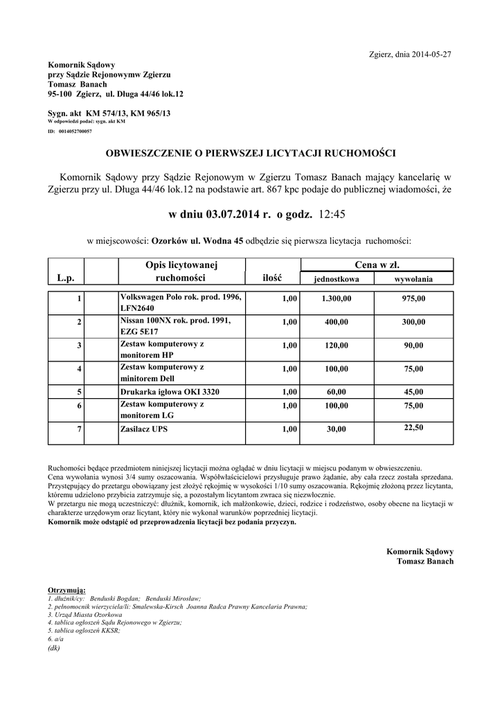 Zgierz, dnia 2014-05-27 Komornik Sądowy przy Sądzie Rejonowymw Zgierzu Tomasz Banach 95-100 Zgierz, ul. Długa 44/46 lok.12 Sygn. akt KM 574/13, KM 965/13 W odpowiedzi podać: sygn. akt KM ID: 0014052700057 OBWIESZCZENIE O PIERWSZEJ LICYTACJI RUCHOMOŚCI Komornik Sądowy przy Sądzie Rejonowym w Zgierzu Tomasz Banach mający kancelarię w Zgierzu przy ul. Długa 44/46 lok.12 na podstawie art. 867 kpc podaje do publicznej wiadomości, Ŝe w dniu 03.07.2014 r. o godz. 12:45 w miejscowości: Ozorków ul. Wodna 45 odbędzie się pierwsza licytacja ruchomości: Opis licytowanej ruchomości L.p. Cena w zł. ilość jednostkowa wywołania Volkswagen Polo rok. prod. 1996, LFN2640 Nissan 100NX rok. prod. 1991, EZG 5E17 Zestaw komputerowy z monitorem HP Zestaw komputerowy z minitorem Dell 1,00 1.300,00 975,00 1,00 400,00 300,00 1,00 120,00 90,00 1,00 100,00 75,00 1,00 60,00 45,00 6 Drukarka igłowa OKI 3320 Zestaw komputerowy z monitorem LG 1,00 100,00 75,00 7 Zasilacz UPS 1,00 30,00 22,50 1 2 3 4 5 Ruchomości będące przedmiotem niniejszej licytacji moŜna oglądać w dniu licytacji w miejscu podanym w obwieszczeniu. Cena wywołania wynosi 3/4 sumy oszacowania. Współwłaścicielowi przysługuje prawo Ŝądanie, aby cała rzecz została sprzedana. Przystępujący do przetargu obowiązany jest złoŜyć rękojmię w wysokości 1/10 sumy oszacowania. Rękojmię złoŜoną przez licytanta, któremu udzielono przybicia zatrzymuje się, a pozostałym licytantom zwraca się niezwłocznie. W przetargu nie mogą uczestniczyć: dłuŜnik, komornik, ich małŜonkowie, dzieci, rodzice i rodzeństwo, osoby obecne na licytacji w charakterze urzędowym oraz licytant, który nie wykonał warunków poprzedniej licytacji. Komornik moŜe odstąpić od przeprowadzenia licytacji bez podania przyczyn. Komornik Sądowy Tomasz Banach Otrzymują: 1. dłuŜnik/cy: Benduski Bogdan; Benduski Mirosław; 2. pełnomocnik wierzyciela/li: Smalewska-Kirsch Joanna Radca Prawny Kancelaria Prawna; 3. Urząd Miasta Ozorkowa 4. tablica ogłoszeń Sądu Rejonowego w Zgierzu; 5. tablica ogloszeń KKSR; 6. a/a (dk)