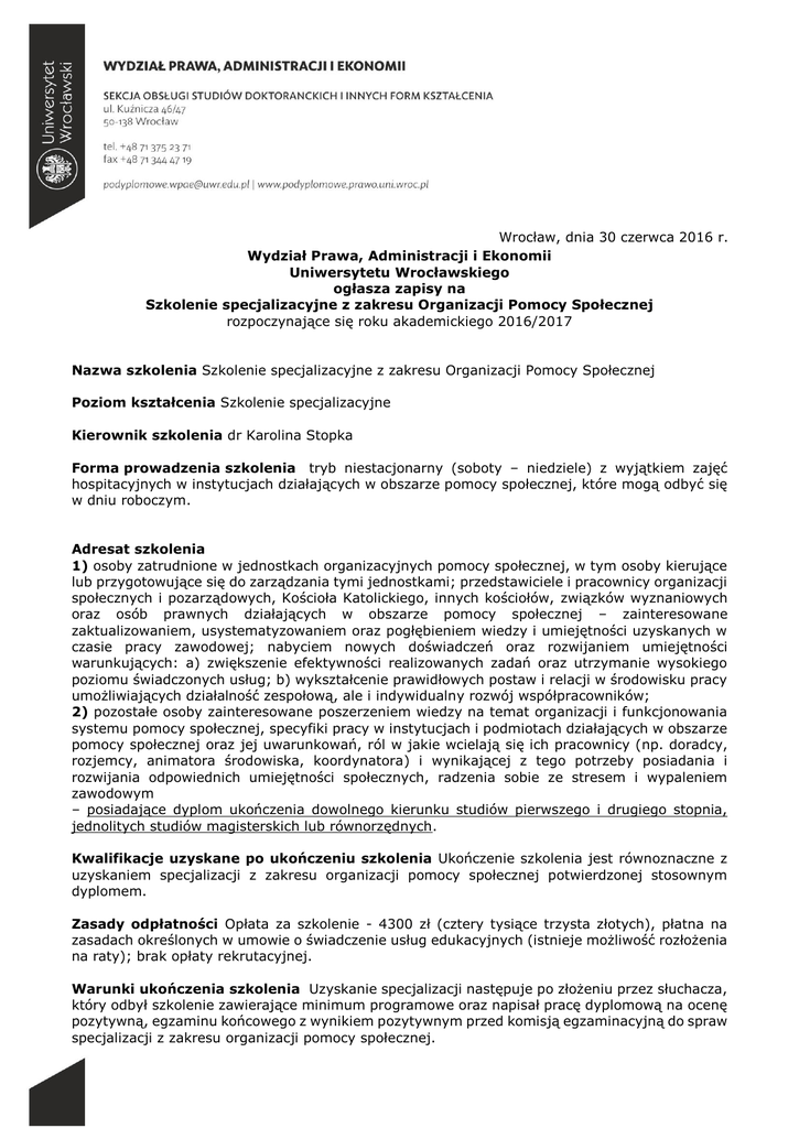 Wrocław, dnia 30 czerwca 2016 r. Wydział Prawa, Administracji i Ekonomii Uniwersytetu Wrocławskiego ogłasza zapisy na Szkolenie specjalizacyjne z zakresu Organizacji Pomocy Społecznej rozpoczynające się roku akademickiego 2016/2017 Nazwa szkolenia Szkolenie specjalizacyjne z zakresu Organizacji Pomocy Społecznej Poziom kształcenia Szkolenie specjalizacyjne Kierownik szkolenia dr Karolina Stopka Forma prowadzenia szkolenia tryb niestacjonarny (soboty – niedziele) z wyjątkiem zajęć hospitacyjnych w instytucjach działających w obszarze pomocy społecznej, które mogą odbyć się w dniu roboczym. Adresat szkolenia 1) osoby zatrudnione w jednostkach organizacyjnych pomocy społecznej, w tym osoby kierujące lub przygotowujące się do zarządzania tymi jednostkami; przedstawiciele i pracownicy organizacji społecznych i pozarządowych, Kościoła Katolickiego, innych kościołów, związków wyznaniowych oraz osób prawnych działających w obszarze pomocy społecznej – zainteresowane zaktualizowaniem, usystematyzowaniem oraz pogłębieniem wiedzy i umiejętności uzyskanych w czasie pracy zawodowej; nabyciem nowych doświadczeń oraz rozwijaniem umiejętności warunkujących: a) zwiększenie efektywności realizowanych zadań oraz utrzymanie wysokiego poziomu świadczonych usług; b) wykształcenie prawidłowych postaw i relacji w środowisku pracy umożliwiających działalność zespołową, ale i indywidualny rozwój współpracowników; 2) pozostałe osoby zainteresowane poszerzeniem wiedzy na temat organizacji i funkcjonowania systemu pomocy społecznej, specyfiki pracy w instytucjach i podmiotach działających w obszarze pomocy społecznej oraz jej uwarunkowań, ról w jakie wcielają się ich pracownicy (np. doradcy, rozjemcy, animatora środowiska, koordynatora) i wynikającej z tego potrzeby posiadania i rozwijania odpowiednich umiejętności społecznych, radzenia sobie ze stresem i wypaleniem zawodowym – posiadające dyplom ukończenia dowolnego kierunku studiów pierwszego i drugiego stopnia, jednolitych studiów magisterskich lub równorzędnych. Kwalifikacje uzyskane po ukończeniu szkolenia Ukończenie szkolenia jest równoznaczne z uzyskaniem specjalizacji z zakresu organizacji pomocy społecznej potwierdzonej stosownym dyplomem. Zasady odpłatności Opłata za szkolenie - 4300 zł (cztery tysiące trzysta złotych), płatna na zasadach określonych w umowie o świadczenie usług edukacyjnych (istnieje możliwość rozłożenia na raty); brak opłaty rekrutacyjnej. Warunki ukończenia szkolenia Uzyskanie specjalizacji następuje po złożeniu przez słuchacza, który odbył szkolenie zawierające minimum programowe oraz napisał pracę dyplomową na ocenę pozytywną, egzaminu końcowego z wynikiem pozytywnym przed komisją egzaminacyjną do spraw specjalizacji z zakresu organizacji pomocy społecznej. Wymagania wstępne dla kandydatów, zasady rekrutacji Osoby zainteresowane udziałem w Szkoleniu specjalizacyjnym z zakresu Organizacji Pomocy Społecznej do dnia 30 października 2016 r. powinny złożyć następujące dokumenty: 1. podanie o przyjęcie na Szkolenie specjalizacyjne z zakresu Organizacji Pomocy Społecznej, 2. kopię dokumentu potwierdzającego tożsamość, 3. odpis dyplomu ukończenia studiów wyższych lub kserokopię dyplomu poświadczoną przez jednostkę przyjmującą dokumenty, 4. kwestionariusz osobowy (który można pobrać ze strony internetowej, zakładka „do pobrania”), 5. jedną fotografie o wymiarach 35 mm x 45 mm bez nakrycia głowy, na jasnym tle, podpisane imieniem i nazwiskiem. Dokumenty można składać osobiście w Sekcji Obsługi Studiów Doktoranckich i Innych Form Kształcenia (www.podyplomowe.prawo.uni.wroc.pl) lub przesłać listem poleconym na adres Sekcji. Warunkiem przyjęcia na Szkolenie jest, poza złożeniem w/w dokumentów, podpisanie umowy o świadczenie usług edukacyjnych. Umowa z uczestnikiem zostanie podpisana po otrzymaniu decyzji o przyjęciu na Szkolenie specjalizacyjne z zakresu Organizacji Pomocy Społecznej (w dniu pierwszych zajęć). Specjalizacja zostanie uruchomiona gdy zgłosi się co najmniej 20 osób. Program szkolenia Program szkolenia jest zgodny z minimum programowym określonym w rozporządzeniu Ministra Pracy i Polityki Społecznej z dnia 26.IX.2012 r. w sprawie specjalizacji z zakresu organizacji pomocy społecznej (Dz. U. z 2012 r., poz. 1081). Zakłada realizację 265 godzin zajęć dydaktycznych. Zajęcia rozpoczną się w semestrze letnim w roku akademickim 2014/2015 po dniu 22 lutego 2016 r., zakończą się (po przerwie wakacyjnej: lipiec – wrzesień) w roku akademickim 2015/2016. Zajęcia prowadzone będą przez nauczycieli akademickich WPAiE, praktyków, w tym pracowników zarządzających jednostkami organizacyjnymi pomocy społecznej, sędziów oraz nauczycieli szkół pracowników socjalnych, wśród których część stanowiła obsadę dydaktyczną, prowadzonych przez WPAiE przez 16 lat, Studiów Podyplomowych Prawa Pracy i Prawa Socjalnego oraz wyodrębnionej w ramach tych Studiów: Specjalizacji - Organizacja Pomocy Społecznej. Szczegółowy program szkolenia 1. Współczesne kierunki rozwoju polityki społecznej w ujęciu globalnym, europejskim i lokalnym 2. Elementy organizacji i zarządzania w pomocy społecznej Liczba godzin 20 90 Forma zajęć W (12) ćw (8) -------- Kadra dydaktyczna pracownik Zakładu Prawa Pracy UWr, członek pozaetatowy SKO dr hab. R. Babińska - Górecka -------------------------------- a. Kadra menedżerska w pomocy społecznej, w tym umiejętność przywództwa, organizacji pracy własnej, zarządzania czasem i rozwiązywania problemów b. Zarządzanie zasobami ludzkimi 14 W (4) ćw (10) pracownik Zakładu Nauki Administracji UWr dr hab. J. Supernat, prof. nadzw. UWr 10 W (2) ćw (8) c. Zarządzanie międzyorganizacyjne na poziomie lokalnym, z uwzględnieniem podmiotów niepublicznych w pomocy społecznej 10 W (2) ćw (8) d. Kierowanie