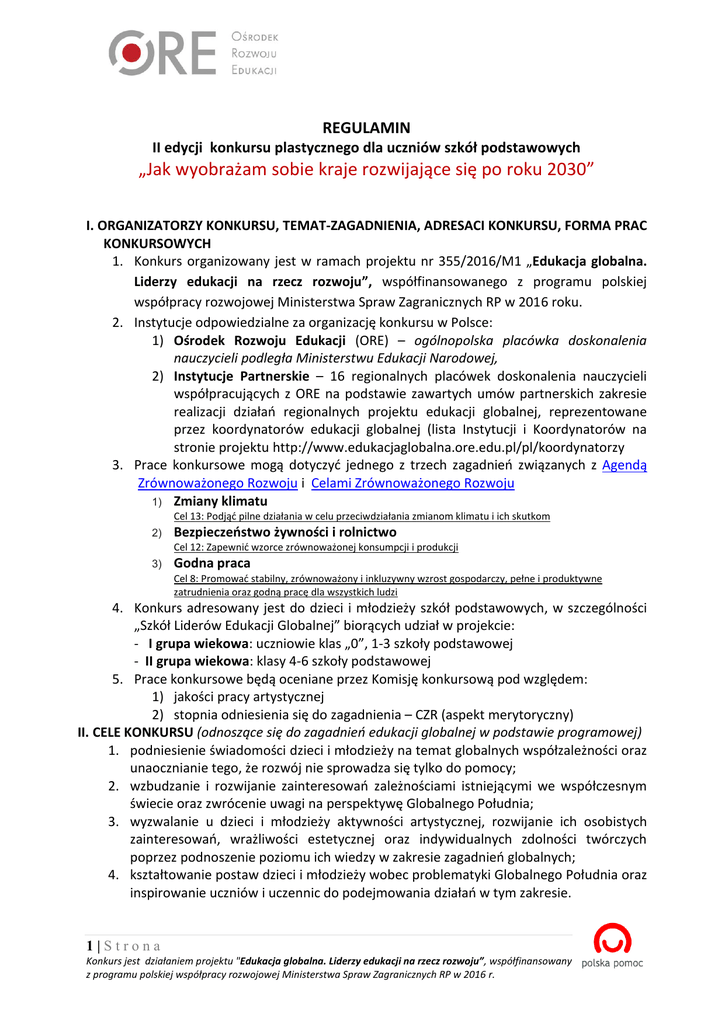 REGULAMIN II edycji konkursu plastycznego dla uczniów szkół podstawowych „Jak wyobrażam sobie kraje rozwijające się po roku 2030” I. ORGANIZATORZY KONKURSU, TEMAT-ZAGADNIENIA, ADRESACI KONKURSU, FORMA PRAC KONKURSOWYCH 1. Konkurs organizowany jest w ramach projektu nr 355/2016/M1 „Edukacja globalna. Liderzy edukacji na rzecz rozwoju”, współfinansowanego z programu polskiej współpracy rozwojowej Ministerstwa Spraw Zagranicznych RP w 2016 roku. 2. Instytucje odpowiedzialne za organizację konkursu w Polsce: 1) Ośrodek Rozwoju Edukacji (ORE) – ogólnopolska placówka doskonalenia nauczycieli podległa Ministerstwu Edukacji Narodowej, 2) Instytucje Partnerskie – 16 regionalnych placówek doskonalenia nauczycieli współpracujących z ORE na podstawie zawartych umów partnerskich zakresie realizacji działań regionalnych projektu edukacji globalnej, reprezentowane przez koordynatorów edukacji globalnej (lista Instytucji i Koordynatorów na stronie projektu http://www.edukacjaglobalna.ore.edu.pl/pl/koordynatorzy 3. Prace konkursowe mogą dotyczyć jednego z trzech zagadnień związanych z Agendą Zrównoważonego Rozwoju i Celami Zrównoważonego Rozwoju 1) Zmiany klimatu Cel 13: Podjąć pilne działania w celu przeciwdziałania zmianom klimatu i ich skutkom 2) Bezpieczeństwo żywności i rolnictwo Cel 12: Zapewnić wzorce zrównoważonej konsumpcji i produkcji 3) Godna praca Cel 8: Promować stabilny, zrównoważony i inkluzywny wzrost gospodarczy, pełne i produktywne zatrudnienia oraz godną pracę dla wszystkich ludzi 4. Konkurs adresowany jest do dzieci i młodzieży szkół podstawowych, w szczególności „Szkół Liderów Edukacji Globalnej” biorących udział w projekcie: - I grupa wiekowa: uczniowie klas „0”, 1-3 szkoły podstawowej - II grupa wiekowa: klasy 4-6 szkoły podstawowej 5. Prace konkursowe będą oceniane przez Komisję konkursową pod względem: 1) jakości pracy artystycznej 2) stopnia odniesienia się do zagadnienia – CZR (aspekt merytoryczny) II. CELE KONKURSU (odnoszące się do zagadnień edukacji globalnej w podstawie programowej) 1. podniesienie świadomości dzieci i młodzieży na temat globalnych współzależności oraz unaocznianie tego, że rozwój nie sprowadza się tylko do pomocy; 2. wzbudzanie i rozwijanie zainteresowań zależnościami istniejącymi we współczesnym świecie oraz zwrócenie uwagi na perspektywę Globalnego Południa; 3. wyzwalanie u dzieci i młodzieży aktywności artystycznej, rozwijanie ich osobistych zainteresowań, wrażliwości estetycznej oraz indywidualnych zdolności twórczych poprzez podnoszenie poziomu ich wiedzy w zakresie zagadnień globalnych; 4. kształtowanie postaw dzieci i młodzieży wobec problematyki Globalnego Południa oraz inspirowanie uczniów i uczennic do podejmowania działań w tym zakresie. 1|Strona Konkurs jest działaniem projektu "Edukacja globalna. Liderzy edukacji na rzecz rozwoju”, współfinansowany z programu polskiej współpracy rozwojowej Ministerstwa Spraw Zagranicznych RP w 2016 r. 5. promowanie szkół zaangażowanych w realizację zadań z zakresu edukacji globalnej. III. ZAŁOŻENIA ORGANIZACYJNE Organizatorem konkursu jest Ośrodek Rozwoju Edukacji. Adres biura organizacyjnego konkursu: Wydział Rozwoju Kompetencji Społecznych i Obywatelskich Ośrodek Rozwoju Edukacji 00-478 Warszawa, Aleje Ujazdowskie 28; tel. 22 345 37 83 IV. ETAPY KONKURSU 1. Etap szkolny (lokalny) 1) trwa od ogłoszenia konkursu na stronie ORE do 18 listopada 2016 r.; 2) konkurs na terenie szkoły ogłasza Dyrektor szkoły; 3) ocena prac konkursowych i wybór zwycięskich prac etapu szkolnego odbywa się lokalnie na poziomie szkoły; 4) Dyrektor szkoły powołuje 3-osobową komisję konkursową, w skład której wchodzą dyrektor/wicedyrektor szkoły jako przewodniczący, dwóch (2) nauczycieli, w tym Lider w Szkołach Liderów Edukacji Globalnej 2016. 5) komisja konkursowa na etapie szkolnym dokonuje wyboru czterech (4) zwycięskich prac konkursowych; 6) zwycięskie prace wybrane przez komisję konkursową (max 4 prace z jednej szkoły) zostaną przesłane w postaci pliku elektronicznego w formacie JPG, opatrzone właściwym opisem (imię i nazwisko autora oraz opiekuna pracy, tytuł pracy oraz opis max 900 znaków), na platformę konkursu najpóźniej do dnia 21 listopada 2016 r. do godz. 23.59 (szczegóły w części VI. Szczegóły konkursu) 2. Etap regionalny (wojewódzki) 1) trwa od 22 do 25 listopada 2016 r.; 2) komisję konkursową na poziomie wojewódzkim powołuje Dyrektor Instytucji Partnerskiej ORE lub upoważniony koordynator regionalny edukacji globalnej, w skład 3-osobowej komisji wchodzą (jako eksperci): Dyrektor Instytucji Partnerskiej ORE lub upoważniony koordynator regionalny edukacji globalnej jako przewodniczący, dwóch (2) nauczycieli konsultantów/specjalistów/ doradców metodycznych z Instytucji Partnerskich ORE; w których zatrudnieni są regionalni koordynatorzy projektu edukacji globalnej; 3) komisja konkursowa na etapie regionalnym wybiera maksymalnie cztery (4) zwycięskie prace (po dwie z każdej grupy wiekowej), najpóźniej do 28 listopada 2016 r. do godz. 23.59 4) komisja konkursowa przesyła protokół z wyboru zwycięskich prac do organizatora konkursu, Ośrodka Rozwoju Edukacji w Warszawie za pośrednictwem platformy konkursowej (login i hasło udostępni Organizator). 3. Etap ogólnokrajowy (centralny): 1) trwa do dnia 5 grudnia 2016 r. 2) komisja konkursowa składa się z przedstawicieli MSZ, ORE oraz powołanych ekspertów zewnętrznych zajmujących się edukacją rozwojową/ globalną; 2|Strona Konkurs jest działaniem projektu "Edukacja globalna. Liderzy edukacji na rzecz rozwoju”, współfinansowany z programu polskiej współpracy rozwojowej Ministerstwa Spraw Zagranicznych RP w 2016 r. 3) komisja konkursowa na etapie centralnym dokonuje wyboru finalistów konkursu - max 16 zwycięskich prac; 4) prace laureatów poszczególnych et