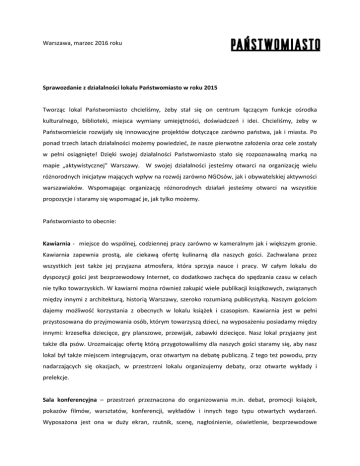 Warszawa, marzec 2016 roku Sprawozdanie z działalności lokalu Państwomiasto w roku 2015 Tworząc lokal Państwomiasto chcieliśmy, żeby stał się on centrum łączącym funkcje ośrodka kulturalnego, biblioteki, miejsca wymiany umiejętności, doświadczeń i idei. Chcieliśmy, żeby w Państwomieście rozwijały się innowacyjne projektów dotyczące zarówno państwa, jak i miasta. Po ponad trzech latach działalności możemy powiedzieć, że nasze pierwotne założenia oraz cele zostały w pełni osiągnięte! Dzięki swojej działalności Państwomiasto stało się rozpoznawalną marką na mapie „aktywistycznej” Warszawy. W swojej działalności jesteśmy otwarci na organizację wielu różnorodnych inicjatyw mających wpływ na rozwój zarówno NGOsów, jak i obywatelskiej aktywności warszawiaków. Wspomagając organizację różnorodnych działań jesteśmy otwarci na wszystkie propozycje i staramy się wspomagać je, jak tylko możemy. Państwomiasto to obecnie: Kawiarnia - miejsce do wspólnej, codziennej pracy zarówno w kameralnym jak i większym gronie. Kawiarnia zapewnia prostą, ale ciekawą ofertę kulinarną dla naszych gości. Zachwalana przez wszystkich jest także jej przyjazna atmosfera, która sprzyja nauce i pracy. W całym lokalu do dyspozycji gości jest bezprzewodowy Internet, co dodatkowo zachęca do spędzania czasu w celach nie tylko towarzyskich. W kawiarni można również zakupić wiele publikacji książkowych, związanych między innymi z architekturą, historią Warszawy, szeroko rozumianą publicystyką. Naszym gościom dajemy możliwość korzystania z obecnych w lokalu książek i czasopism. Kawiarnia jest w pełni przystosowana do przyjmowania osób, którym towarzyszą dzieci, na wyposażeniu posiadamy między innymi: krzesełka dziecięce, gry planszowe, przewijak, zabawki dziecięce. Nasz lokal przyjazny jest także dla psów. Urozmaicając ofertę którą przygotowaliśmy dla naszych gości staramy się, aby nasz lokal był także miejscem integrującym, oraz otwartym na debatę publiczną. Z tego też powodu, przy nadarzających się okazjach, w przestrzeni lokalu organizujemy debaty, oraz otwarte wykłady i prelekcje. Sala konferencyjna – przestrzeń przeznaczona do organizowania m.in. debat, promocji książek, pokazów filmów, warsztatów, konferencji, wykładów i innych tego typu otwartych wydarzeń. Wyposażona jest ona w duży ekran, rzutnik, scenę, nagłośnienie, oświetlenie, bezprzewodowe mikrofony. Sala jest ogólnodostępna i służy głównie do organizacji otwartych dla mieszkańców spotkań, które poszerzają ofertę kulturalną miasta oraz są okazją do spotkań służących konfrontacji opinii i cyrkulacji idei oraz poglądów. Do dnia dzisiejszego z naszej sali skorzystało wiele różnych środowisk, organizując otwarte spotkania cieszące się ogromną publicznością. Pokój spotkań – udało nam się stworzyć również specjalną salę spotkań. Jest to salka mogąca pomieścić ok. 15 osób, wyposażona w stoliki, krzesła, flipchart, można również nieodpłatnie skorzystać z rzutnika i przenośnego ekranu. Pokój spotkań jest dostępny nieodpłatnie dla każdego. Wystarczy zgłosić chęć skorzystania z salki w dogodnym dla siebie terminie – grafik obłożenia pokoju spotkań jest ogólnodostępny i na bieżąco aktualizowany na naszej stronie internetowej. Może służyć między innymi jako: miejsce zebrań, warsztatów, kameralnych prezentacji, cichej pracy zespołowej. Pokój Spotkań to przestrzeń, która pozwala powstawać młodym organizacjom dając im przestrzeń na pierwsze spotkania. To także miejsce narodzin wielu ciekawych projektów, ruchów, inicjatyw i programów. Do tej pory z możliwości skorzystania z tej przestrzeni skorzystało bardzo wiele organizacji pozarządowych oraz osób prywatnych. Wypożyczalnia Roweru Cargo – od lipca 2014 roku dzięki uprzejmości Zarządu Transportu Miejskiego jesteśmy także jedną z kilku dostępnych w Warszawie baz wypożyczania roweru typu cargo bike. Rower Cargo cieszy się ogromną popularnością a liczba wypożyczeń z każdym rokiem znacznie wzrasta plasując się na jednym z najwyższych miejsc w rankingu. Miejsce przyjazne rowerzystom – dla wszystkich rowerzystów posiadamy obszerny parking rowerowy gdzie każdy nasz gość może bezpiecznie zaparkować swój jednoślad. Obok parkingu stoi również nasza stacja Ibombo wyposażona we wszystkie narzędzia niezbędne do konserwacji i naprawy rowerów. Często korzystają z niej także rodzice, którzy podczas spaceru mogą napompować koła w wózkach swoich pociech. Biuro Projekt: Polska – na piętrze lokalu Państwomiasto znajduje się także wyposażone w komputery, drukarki, skaner i telefony miejsce pracy pracowników Fundacji Projekt: Polska. Jest to również siedziba Centrum Cyfrowego Projekt: Polska, ośrodka badawczego promującego ideę otwartości danych publicznych oraz działającego na rzecz znalezienia kompromisu pomiędzy prawem do własności intelektualnej oraz swobodnym korzystaniem z Internetu. Działalność Fundacji opiera się o filozofię, która towarzyszy całemu lokalowi, czyli promuje otwartość w rozumieniu konkretnych zagadnień jak np. otwartość danych publicznych jak i w kontekście nieco szerszym jako otwartość na nowe środowiska, poglądy. a. środowiska związane z budowaniem społeczeństwa cyfrowego w szczególności te związane z otwartością cyfrową i otwartym wykorzystaniem danych b. środowiska związane z budowaniem i rozszerzaniem wartości wolnościowych c. środowiska związane z aktywnością lokalną d. środowiska związane z analizą obecnej sytuacji społeczno-politycznej Podczas swojej działalności w dalszym ciągu poszerzamy grono naszych partnerów strategicznych, z którymi moglibyśmy w naszych przestrzeniach organizować spotkania związane z celami działalności naszej Fundacji. Są to m.in. - środowiska zw