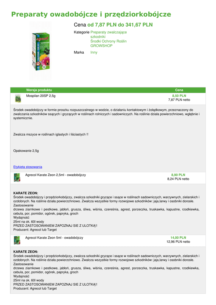Preparaty owadobójcze i przędziorkobójcze Cena od 7,87 PLN do 341,67 PLN Kategorie Preparaty zwalczające szkodniki Środki Ochrony Roślin GROWSHOP Marka Wersja produktu Mospilan 20SP 2,5g Inny Cena 8,50 PLN 7,87 PLN netto Środek owadobójczy w formie proszku rozpuszczalnego w wodzie, o działaniu kontaktowym i żołądkowym, przeznaczony do zwalczania szkodników ssących i gryzących w roślinach rolniczych i sadowniczych. Na roślinie działa powierzchniowo, wgłębnie i systemicznie. Zwalcza mszyce w roślinach iglastych i liściastych !! Opakowanie 2,5g Etykieta stosowania Agrecol Karate Zeon 2,5ml - owadobójczy 8,90 PLN 8,24 PLN netto KARATE ZEON: Środek owadobójczy i przędziorkobójczy, zwalcza szkodniki gryzące i ssące w roślinach sadowniczych, warzywnych, zielarskich i ozdobnych. Na roślinie działa powierzchniowo. Zwalcza wszystkie formy rozwojowe szkodników: jaja,larwy i osobniki dorosłe. Zastosowanie drzewa ziarnkowe i pestkowe, jabłoń, grusza, śliwa, wiśnia, czereśnia, agrest, porzeczka, truskawka, kapustne, rzodkiewka, cebula, por, pomidor, ogórek, papryka, groch Wydajność 25ml na ok. 60l wody PRZED ZASTOSOWANIEM ZAPOZNAJ SIE Z ULOTKĄ!! Producent: Agrecol lub Target Agrecol Karate Zeon 5ml - owadobójczy 14,00 PLN 12,96 PLN netto KARATE ZEON: Środek owadobójczy i przędziorkobójczy, zwalcza szkodniki gryzące i ssące w roślinach sadowniczych, warzywnych, zielarskich i ozdobnych. Na roślinie działa powierzchniowo. Zwalcza wszystkie formy rozwojowe szkodników: jaja,larwy i osobniki dorosłe. Zastosowanie drzewa ziarnkowe i pestkowe, jabłoń, grusza, śliwa, wiśnia, czereśnia, agrest, porzeczka, truskawka, kapustne, rzodkiewka, cebula, por, pomidor, ogórek, papryka, groch Wydajność 25ml na ok. 60l wody PRZED ZASTOSOWANIEM ZAPOZNAJ SIE Z ULOTKĄ!! Producent: Agrecol lub Target Snacol na slimaki 250g 18,00 PLN 16,67 PLN netto Środek ślimakobójczy w formie granulowanej przynęty, przeznaczony do zwalczania ślimaków w roślinach rolniczych i ozdobnych. Agrecol Karate Zeon 10ml - owadobójczy 22,00 PLN 20,37 PLN netto KARATE ZEON: Środek owadobójczy i przędziorkobójczy, zwalcza szkodniki gryzące i ssące w roślinach sadowniczych, warzywnych, zielarskich i ozdobnych. Na roślinie działa powierzchniowo. Zwalcza wszystkie formy rozwojowe szkodników: jaja,larwy i osobniki dorosłe. Zastosowanie drzewa ziarnkowe i pestkowe, jabłoń, grusza, śliwa, wiśnia, czereśnia, agrest, porzeczka, truskawka, kapustne, rzodkiewka, cebula, por, pomidor, ogórek, papryka, groch Wydajność 25ml na ok. 60l wody PRZED ZASTOSOWANIEM ZAPOZNAJ SIE Z ULOTKĄ!! Producent: Agrecol lub Target Ferramol - zwalcza ślimaki 250gr 26,00 PLN 24,07 PLN netto Wysokiej wydajności minigranulat firmy Neudorff. Szybko i skutecznie zwalcza ślimaki. Wyjątkowo odporny na deszcz. Zastosowanie: Środek przeznaczony jest do zwalczania ślimaków w sałacie oraz roślinach ozdobnych uprawianych w gruncie i pod osłonami. Po zauważeniu pierwszych szkód wyrządzonych przez ślimaki, nie częściej jednak niż dwa razy w sezonie uprawy danej rośliny. Rozsypywać równomiernie pomiędzy rzędami roślin. Nie posypywać liści roślin uprawnych. Najlepsze efekty daje stosowany w godzinach popołudniowych lub wieczornych. Działanie: Działa jak przynęta. Wabi ślimaki i jest przez nie zjadany. Ma działanie żołądkowe i kontaktowe. Dawkowanie: Zalecana dawka: 8g/10m2 Dostępne opakowania: granulat 200g Owadum domowe - owadobójczy 0,5l 26,00 PLN 24,07 PLN netto OWADUM: Owadum Domowe przeznaczony do zwalczania szkodników w gospodarstwie domowym. Tak szerokie pojęcie może skłaniać do zastosowania na roślinach występujących w domu jak i również w ogródkach występujących przy domostwach. W momencie zastosowania tego preparatu na rośliny uprawne zaczynają Państwo stosować go jako środek ochrony roślin. 1.Zabrania się stosowania środków w strefie bezpośredniej ochrony ujęć wody oraz na terenie uzdrowisk, otulin parków narodowych i rezerwatów 2.Nie dopuścić do przedostania się środka do zbiorników i cieków wodnych 3.Rośliny doniczkowe opryskiwać poza pomieszczeniami mieszkalnymi np.na balkonie, podwórzu 4.Podczas opryskiwania roślin ozdobnych uprawianych w ogrodzie nie dopuszczać do przedostania się środka na rośliny konsumpcyjne, zwłaszcza przeznaczone wkrótce do zbioru (np. rośliny konsumpcyjne można przykryć folią) 5.Środek działa najskuteczniej w temperaturze poniżej 20oC. 6.Przed użyciem wstrząsnąć zawartością pojemnika. 7.Na plantacjach kwitnących roślin, a także w bliskim ich sąsiedztwie zabieg wykonać przed wieczorem po zakończeniu dziennego lotu pszczół. Nie stosować na roślinach pokrytych spadzią. KARENCJA (okres od dnia ostatniego zabiegu do dnia zbioru i przeznaczenia do konsumpcji) - 7 dni na pomidor,papryka,ogórek(pod osłonami) - 3 dni OKRES PREWENCJI DLA PSZCZÓŁ (okres zapobiegający zatruciu) - 6 godzin OKRES PREWENCJI DLA LUDZI (okres zapobiegający zatruciu) NIE DOTYCZY OKRES PREWENCJI DLA ZWIERZĄT (okres zapobiegający zatruciu) Rośliny warzywne i ozdobne (ogrody działkowe i przydomowe) -mszyce, mączlik szklarniowy, wciornastki, gąsienice zjadające liście,chrząszcze, zmieniki i inne szkodliwe owady. Środek stosować do opryskiwania roślin w momencie wystąpienia szkodnika i w razie potrzeby powtarzać co 4-6 dni. Opakowanie - 500 ml - spray Agrecol Karate Zeon 25ml - owadobójczy 28,00 PLN 25,93 PLN netto KARATE ZEON: Środek owadobójczy i przędziorkobójczy, zwalcza szkodniki gryzące i ssące w roślinach sadowniczych, warzywnych, zielarskich i ozdobnych. Na roślinie działa powierzchniowo. Zwalcza wszystkie formy rozwojowe szkodników: jaja,larwy i osobniki dorosłe. Zastosowanie: drzewa ziarnkowe i pestkowe, jabłoń, grusza, śliwa, wiśnia, czereśnia, agrest, porzeczka, truskawka, kapustne, rzodkiewka, cebula, por, pomidor, ogórek, papryka, groch Wydajność 25ml na ok.
