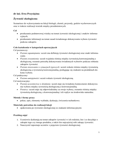 dr inż. Ewa Przysiężna Żywność ekologiczna Scenariusz do wykorzystania na lekcji biologii, chemii, przyrody, godzin wychowawczych oraz w trakcie realizacji ścieżek między przedmiotowych. Cel przekazanie podstawowej wiedzy na temat żywności ekologicznej i znaków informacyjnych, przekazanie informacji na temat zasad świadomego dokonywania wyboru żywności podczas zakupów. Cele kształcenia w kategoriach operacyjnych Cel poznawczy: Poziom zapamiętania: uczeń zna definicję żywności ekologicznej oraz znaki informacyjne. Poziom zrozumienia: uczeń wyjaśnia różnicę między żywnością konwencjonalną a ekologiczną, rozumie potrzebę dokonywania świadomych wyborów podczas robienia zakupów żywności. Poziom stosowania w sytuacjach typowych: uczeń wskaże różnice między żywnością ekologiczną a żywnością konwencjonalną, posługując się znakami na produktach dokona wyboru. Cel praktyczny: Poziom umiejętności: uczeń wskaże żywność ekologiczną. Cel motywacyjny: Poziom uczestnictwa w działaniu: uczeń staje się świadomy konieczności dokonywania wyboru między żywnością ekologiczną a konwencjonalną. Postawy: uczeń staje się odpowiedzialny za swoje wybory, rozumie różnicę między żywnością ekologiczną, a konwencjonalną i ich wpływ na środowisko naturalne. Metody i formy pracy pokaz, opis, elementy wykładu, dyskusja, ćwiczenia rachunkowe. Materiały potrzebne do realizacji lekcji opakowania po żywności ekologicznej ze znakami informacyjnymi. Przebieg zajęć 1. Uczniowie dyskutują na temat zakupów żywności w ich rodzinie, kto i co decyduje o zakupie tego czy innego produktu, a także kto najczęściej robi zakupy żywności. 2. Nauczyciel zapoznaje uczniów z pojęciem żywności ekologicznej. 1 3. Nauczyciel zapoznaje uczniów ze sposobem odróżnienia żywności ekologicznej od konwencjonalnej, dzięki znakom zamieszczanym na żywności ekologicznej. 4. Zapoznanie uczniów ze znakami dla żywności ekologicznej w Polsce jak i w innych krajach. 5. Oszacowanie kosztu całodziennej racji pokarmowej z produktów konwencjonalnych (każdy uczeń dla siebie) oraz urozmaiconych żywnością ekologiczną. Wnioski. 6. Zadanie domowe: świadome zakupy żywności- wyszukanie na półkach sklepu (osiedlowego, hipermarketu itp.) żywności ekologicznej. Materiały dla nauczyciela Definicja żywności ekologicznej Rolnictwo ekologiczne – (organiczne, biologiczne) - system gospodarowania, w którym wyklucza się stosowanie syntetycznych nawozów mineralnych, pestycydów, regulatorów wzrostu i syntetycznych dodatków paszowych. Rolnictwo to charakteryzuje się produkcją w cyklu zamkniętym gleba – roślina – zwierzę, przy zachowaniu dużej samowystarczalności. Traktowane jest jako sposób życia w symbiozie z przyrodą, a cele ekologiczne dominują nad ekonomicznymi. Żywność ekologiczna” to żywność, której sposób wytwarzania jest zgodny z zasadami zawartymi w rozporządzeniu Rady (EWG) 2092/91 w sprawie produkcji ekologicznej produktów rolnych oraz znakowania produktów rolnych i środków spożywczych z późniejszymi zmianami, oznacza między innymi żywność produkowaną bez użycia nawozów sztucznych i chemicznych środków ochrony roślin, przy zachowaniu żyzności gleby oraz różnorodności biologicznej. Uważa się, że stosowanie rolnictwa ekologicznego pozwala na: ochronę środowiska produkcji rolniczej tj. gleby, wody, krajobrazu - dążenie do biologicznej samoregulacji w obrębie gospodarstwa rozumianego jako system ekologiczny, wysoką jakość biologiczną płodów rolnych, podobną do właściwości produktów powstających naturalnie w przyrodzie, bez ingerencji człowieka. Najważniejsze zasady ekologicznej produkcji to: zakaz używania chemicznych środków ochrony roślin, nawozów sztucznych, organizmów genetycznie modyfikowanych, a w produkcji zwierzęcej pasz przemysłowych, antybiotyków, stymulatorów wzrostu, itd. W rolnictwie ekologicznym chodzi nie tylko o regulowane ustawą zakazy i ograniczenia, są one jedynie konsekwencją powrotu do naturalnych metod gospodarowania, wykorzystujących siłę tkwiącą w przyrodzie. Naczelną zasadą ekologicznej produkcji jest równowaga paszowonawozowa, bioróżnorodność, tzn. hodowane zwierzęta spożywają paszę wyprodukowaną w tym samym gospodarstwie, a więc także ekologiczną, a nawóz „produkowany” przez te zwierzęta jest wykorzystywany do użyźniania gleby pod produkcję roślinną. Sprawne funkcjonowanie tego systemu wymaga różnorodności gatunków roślin i zwierząt, przy zachowaniu odpowiednich proporcji, w ich liczebność. W przeciwnym razie łatwo o zachwianie tej równowagi. Przykładem jest koncepcja równoczesnej uprawy kilku gatunków na tej samej powierzchni pola, a powstała w tych rejonach świata, w których brakowało odpowiedniej ziemi pod uprawę. W Indiach, południowo wschodniej Azji oraz w krajach Ameryki Łacińskiej ten system uprawy ma wielowiekową tradycję. Wykorzystując pozytywne aspekty wzajemnej konkurencji pomiędzy komponentami konieczne jest jedynie określenie właściwych proporcji, przy których składniki będą na siebie korzystnie oddziaływać, zachowując zasady komplementarnego wykorzystania zasobów siedliska, a także wpływ zróżnicowanych proporcji na 2 wzrost, rozwój, plon i jakość komponentów. Uprawy współrzędne pozwalają na ograniczania stosowania metod chemicznych i ilości używanych agrochemikaliów. Żywność ekologiczna dostępna jest w wielu sklepach, a różni się od żywności konwencjonalnej między innymi tym, że: do produkcji żywności ekologicznej nie używa się chemicznych środków ochrony roślin i nawozów sztucznych, do nawożenia dopuszczalne są na przykład nawozy zielone, kompost, obornik, minerały dostępne w przyrodzie; w gospodarstwach ekologicznych w żywieniu zwierząt stosuje się przede wszystkim pasze z własnego, ekologicznego gospodars