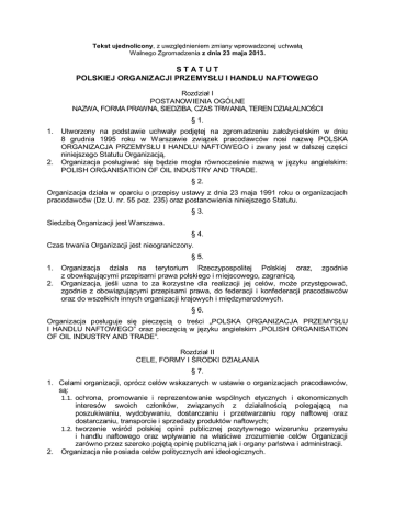 Tekst ujednolicony, z uwzględnieniem zmiany wprowadzonej uchwałą Walnego Zgromadzenia z dnia 23 maja 2013. STAT UT POLSKIEJ ORGANIZACJI PRZEMYSŁU I HANDLU NAFTOWEGO Rozdział I POSTANOWIENIA OGÓLNE NAZWA, FORMA PRAWNA, SIEDZIBA, CZAS TRWANIA, TEREN DZIAŁALNOŚCI § 1. 1. 2. Utworzony na podstawie uchwały podjętej na zgromadzeniu założycielskim w dniu 8 grudnia 1995 roku w Warszawie związek pracodawców nosi nazwę POLSKA ORGANIZACJA PRZEMYSŁU I HANDLU NAFTOWEGO i zwany jest w dalszej części niniejszego Statutu Organizacją. Organizacja posługiwać się będzie mogła równocześnie nazwą w języku angielskim: POLISH ORGANISATION OF OIL INDUSTRY AND TRADE. § 2. Organizacja działa w oparciu o przepisy ustawy z dnia 23 maja 1991 roku o organizacjach pracodawców (Dz.U. nr. 55 poz. 235) oraz postanowienia niniejszego Statutu. § 3. Siedzibą Organizacji jest Warszawa. § 4. Czas trwania Organizacji jest nieograniczony. § 5. 1. 2. Organizacja działa na terytorium Rzeczypospolitej Polskiej oraz, zgodnie z obowiązującymi przepisami prawa polskiego i miejscowego, zagranicą. Organizacja, jeśli uzna to za korzystne dla realizacji jej celów, może przystępować, zgodnie z obowiązującymi przepisami prawa, do federacji i konfederacji pracodawców oraz do wszelkich innych organizacji krajowych i międzynarodowych. § 6. Organizacja posługuje się pieczęcią o treści „POLSKA ORGANIZACJA PRZEMYSŁU I HANDLU NAFTOWEGO” oraz pieczęcią w języku angielskim „POLISH ORGANISATION OF OIL INDUSTRY AND TRADE”. Rozdział II CELE, FORMY I ŚRODKI DZIAŁANIA § 7. 1. Celami organizacji, oprócz celów wskazanych w ustawie o organizacjach pracodawców, są: 1.1. ochrona, promowanie i reprezentowanie wspólnych etycznych i ekonomicznych interesów swoich członków, związanych z działalnością polegającą na poszukiwaniu, wydobywaniu, dostarczaniu i przetwarzaniu ropy naftowej oraz dostarczaniu, transporcie i sprzedaży produktów naftowych; 1.2. tworzenie wśród polskiej opinii publicznej pozytywnego wizerunku przemysłu i handlu naftowego oraz wpływanie na właściwe zrozumienie celów Organizacji zarówno przez szeroko pojętą opinię publiczną jak i organy państwa i administracji. 2. Organizacja nie posiada celów politycznych ani ideologicznych. 3. Dochód Organizacji służy realizacji jej zadań statutowych i nie może być przeznaczony do podziału pomiędzy członków. § 8. Organizacja realizuje swoje cele poprzez: 1. utrzymywanie kontaktów i dobrych stosunków z organami władzy i administracji państwowej i samorządowej, związkami zawodowymi i innymi instytucjami; 2. na żądanie członków prowadzenie negocjacji i wspieranie swoich członków w negocjacjach dotyczących ich zawodowych interesów; 3. promowanie opinii swoich członków dotyczących wszelkich spraw związanych z prowadzoną przez nich działalnością gospodarczą; 4. dostarczanie swoim członkom profesjonalnych informacji i konsultacji na interesujące ich tematy związane z szeroko rozumianą branżą naftową; 5. służenie pomocą członkom Organizacji w pogłębianiu ich kontaktów z rynkami zagranicznymi, w szczególności poprzez wysyłanie i przyjmowanie profesjonalnych delegacji i utrzymywanie kontaktów z zagranicznymi organizacjami o podobnym charakterze; 6. reprezentowanie opinii swoich członków i zajmowanie stanowiska w istotnych kwestiach prawnych i ekonomicznych dotyczących sfery ich aktywności gospodarczej; 7. monitorowanie praktycznej realizacji obowiązujących w branży naftowej przepisów prawnych; 8. inicjowanie i opiniowanie zmian przepisów prawnych oddziaływujących bezpośrednio na realizację celów gospodarczych swoich członków; 9. systematyczne informowanie swoich członków i opinii publicznej o krótko i długoterminowych celach ekonomicznego rozwoju, o programach politycznoekonomicznych i najważniejszych wydarzeniach na rynkach krajowym i zagranicznych; 10. tworzenie warunków do wzajemnej wymiany informacji i danych. Rozdział III CZŁONKOWIE, ICH PRAWA I OBOWIĄZKI § 9. 1. Członkiem Organizacji może zostać podmiot gospodarczy mający siedzibę i działający w Polsce, będący pracodawcą w rozumieniu ustawy o organizacjach pracodawców, specjalizujący się w przemyśle i handlu naftowym, wpisany do Rejestru prowadzonego przez właściwy Sąd lub inny właściwy organ rejestrowy, który dodatkowo spełnia warunki określone w ust. 2 niniejszego paragrafu. 2. Warunkiem członkostwa jest prowadzenie ciągłej działalności gospodarczej w Polsce, w przynajmniej jednej z następujących dziedzin: a) poszukiwanie, wydobywanie i przetwarzanie ropy naftowej w Polsce; b) import/nabycie wewnątrzwspólnotowe ropy naftowej lub produktów ropopochodnych oraz eksport/dostawa wewnątrzwspólnotowa produktów pochodzących z polskich rafinerii, z wyjątkiem podmiotów które importują i eksportują ropę naftową lub produkty naftowe tylko okazjonalnie i nie stanowi to ich regularnej lub podstawowej działalności; c) krajowy handel hurtowy ropą naftową oraz produktami naftowymi; d) prowadzenie sieci stacji paliw; e) prowadzenie terminali z ropą naftową i produktami naftowymi; f) transport ropy naftowej i produktów naftowych g) prowadzenie działalności doradczej, analitycznej, wydawniczej, badań rynku w zakresie produkcji i handlu ropą naftową oraz produktami naftowymi. 3. Członkiem Organizacji może zostać podmiot gospodarczy zależny (podmiot zależny) od podmiotu, będącego członkiem Organizacji. Przez podmiot zależny rozumie się podmiot gospodarczy, kontrolowany przez Członka Organizacji (podmiot dominujący) w ten 4. 5. 6. 7. sposób, że podmiot dominujący posiada bezpośrednio lub pośrednio większość głosów w zgromadzeniu wspólników (walnym zgromadzeniu akcjonariuszy). Warunkiem członkostwa jest zatwierdzenie wniosku o przyjęcie w poczet członków Organizacji przez Radę Dyrektorów. Członkowie Organizacji, z wyłącz