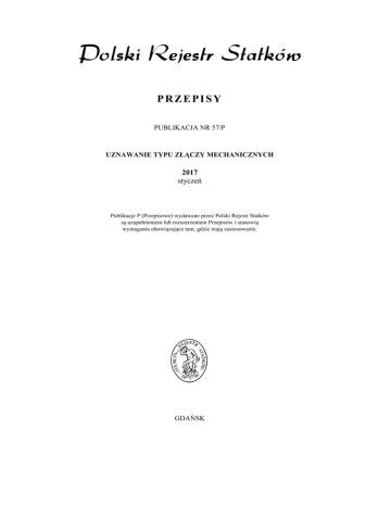 PRZEPISY PUBLIKACJA NR 57/P UZNAWANIE TYPU ZŁĄCZY MECHANICZNYCH 2017 styczeń Publikacje P (Przepisowe) wydawane przez Polski Rejestr Statków są uzupełnieniem lub rozszerzeniem Przepisów i stanowią wymagania obowiązujące tam, gdzie mają zastosowanie. GDAŃSK Publikacja Nr 57/P – Uznawanie typu złączy mechanicznych – styczeń 2017 została zatwierdzona przez Zarząd PRS S.A 16 grudnia 2016 r. i wchodzi w życie z dniem 1 stycznia 2017 r. © Copyright by Polski Rejestr Statków S.A., 2017 PRS/OP, 12/2016 SPIS TREŚCI str. 1 Postanowienia ogólne...................................................................................................................................... 1.1 Zakres zastosowania ................................................................................................................................. 1.2 Dokumentacja techniczna......................................................................................................................... 1.3 Materiały................................................................................................................................................... 1.4 Próby, procedury uznaniowe i wymagania............................................................................................... 5 5 5 5 5 2 Próby ................................................................................................................................................................ 6 2.1 Próba szczelności...................................................................................................................................... 6 2.2 Próba odporności na wibracje................................................................................................................... 7 2.3 Próba odporności na pulsacje ciśnienia .................................................................................................... 8 2.4 Ciśnieniowa próba wytrzymałościowa ..................................................................................................... 9 2.5 Próba odporności na wyrywanie............................................................................................................... 9 2.6 Próba ognioodporności ............................................................................................................................. 10 2.7 Próba odporności na działanie podciśnienia ............................................................................................. 10 2.8 Próba wielokrotnego montażu .................................................................................................................. 10 1 POSTANOWIENIA OGÓLNE 1.1 Zakres zastosowania 1.1.1 Niniejsza Publikacja określa zakres i warunki przeprowadzania prób typu złączy mechanicznych przeznaczonych do stosowania w okrętowych instalacjach rurociągów. 1.1.2 Po pozytywnym zakończeniu procesu uznaniowego PRS wystawia Świadectwo uznania typu złączy mechanicznych. 1.2 Dokumentacja techniczna Dla uzyskania zatwierdzenia typu złączy mechanicznych wytwórca powinien dostarczyć do Centrali PRS następującą dokumentację: .1 wdrożony system zapewniania jakości wyrobu; .2 opis techniczny; .3 rysunki zestawieniowe w przekroju, z wymiarami niezbędnymi do oceny konstrukcji; .4 specyfikacje materiałowe wszystkich elementów; .5 program prób i sprawozdania z uprzednio przeprowadzonych prób i badań; .6 wstępne dane techniczne: – maksymalne ciśnienie obliczeniowe (nadciśnienie i podciśnienie), – maksymalne i minimalne temperatury obliczeniowe, – przewodzony czynnik, – planowane warunki pracy, – dopuszczone przez wytwórcę maksymalne wartości odchylenia osiowego, poprzecznego i kątowego, – instrukcje montażu. 1.3 Materiały 1.3.1 Materiały przeznaczone do wykonania złączy mechanicznych powinny być kompatybilne z materiałem rurociągów oraz mediami wewnętrznymi i zewnętrznymi. 1.3.2 Wytwórca złączy mechanicznych powinien przedstawić dane dotyczące odporności stosowanych materiałów na działanie przewodzonych czynników przy temperaturze i ciśnieniu obliczeniowym. 1.4 Próby, procedury uznaniowe i wymagania 1.4.1 Celem prób jest wykazanie zdolności złączy do działania zgodnego z wymaganiami zawartymi w zatwierdzonej dokumentacji technicznej. 1.4.2 Jeżeli w opisie poszczególnych prób nie postanowiono inaczej, jako cieczy próbnej należy używać wody lub oleju hydraulicznego. 1.4.3 Złącza poddawane próbie typu należy poddać próbom w zakresie określonym w tabeli 1.4.3. Tabela 1.4.3 Próby złączy mechanicznych Rodzaje złączy mechanicznych Próby 1 2 Złącza zaciskane i śrubunkowe Złącza nasuwkowe Złącza zaciskowe i rowkowane Złącza wsuwane 3 4 5 1 Próba szczelności + + + 2 Próba odporności na wibracje + + – 5 Próba odporności na pulsacje ciśnienia 1) 3 2 1 + + – 3 4 5 4 Ciśnieniowa próba wytrzymałościowa + + + 5 Próba odporności na wyrywanie + + – + Próba ognioodporności 6 2) 7 Próba odporności na podciśnienie 8 Próba wielokrotnego montażu 1) 2) 3) 4) 5) 3) + + 4) + + +5) + – + Dla zastosowań w instalacjach, w których występują pulsacje ciśnienia innego typu niż uderzenia wodne. Jeżeli ma zastosowanie według tabeli 1.16.4.5.10-1 Części VI – Urządzenia maszynowe i urządzenia chłodnicze. Dotyczy wyłącznie rurociągów ssących. Z wyjątkiem złączy z uszczelnieniami typu „metal-na-metal”. Z wyjątkiem złączy tłoczonych. 1.4.4 Wybór złączy do prób Elementy do montażu złączy próbnych należy wybrać z linii produkcyjnej lub w sposób losowy z zapasów magazynowych. Jeżeli w obrębie uznawanego typu występują złącza o różnych wielkościach, to należy wybrać – jako minimum – trzy wielkości reprezentatywne dla całego typu zgodnie z wytycznymi zawartymi w Tabeli 1.4.3. 1.4.5 Montaż złączy próbnych Montaż złączy próbnych należy wykonać z 