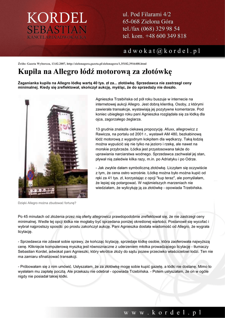 Źróło: Gazeta Wyborcza, 13.02.2007, http://zielonagora.gazeta.pl/zielonagora/1,35182,3916408.html Kupiła na Allegro łódź motorową za złotówkę Żaganianka kupiła na Allegro łódkę wartą 40 tys. zł za... złotówkę. Sprzedawca nie zastrzegł ceny minimalnej. Kiedy się zreflektował, skończył aukcję, myśląc, że do sprzedaży nie doszło. Agnieszka Trzebińska od pół roku buszuje w internecie na internetowej aukcji Allegro. Jest dobrą klientką. Osoby, z którymi zawierała transakcje, wystawiają jej pozytywne komentarze. Pod koniec ubiegłego roku pani Agnieszka rozglądała się za łódką dla ojca, zagorzałego żeglarza. 13 grudnia znalazła ciekawą propozycję. Afuxx, allegrowicz z Rawicza, na portalu od 2001 r., wystawił AM 480, bezkabinową łódź motorową z wygodnym kokpitem dla wędkarzy. Taką łodzią można wypuścić się nie tylko na jezioro i rzekę, ale nawet na morskie przybrzeże. Łódka jest przystosowana także do uprawiania narciarstwa wodnego. Sprzedawca zachwalał jej stan, pływał nią zaledwie kilka razy, m.in. po Adriatyku i po Odrze. - Jak zwykle dałam symboliczną złotówkę. Liczyłam się oczywiście z tym, że cena ostro wzrośnie. Łódkę można było można kupić od ręki za 41 tys. zł, korzystając z opcji "kup teraz", ale pomyślałam, że lepiej się potargować. W najśmielszych marzeniach nie wiedziałam, że wylicytuję ją za złotówkę - opowiada Trzebińska. Dzięki Allegro można zbudować fortunę? Po 45 minutach od złożenia przez nią oferty allegrowicz prawdopodobnie zreflektował się, że nie zastrzegł ceny minimalnej. Wedle tej opcji łódka nie mogłaby być sprzedana poniżej określonej wartości. Postanowił się wycofać i wybrał najprostszy sposób: po prostu zakończył aukcję. Pani Agnieszka dostała wiadomość od Allegro, że wygrała licytację. - Sprzedawca nie zdawał sobie sprawy, że kończąc licytację, sprzedaje łódkę osobie, która zaoferowała najwyższą cenę. Kliknięcie komputerową myszką jest równoznaczne z uderzeniem młotka prowadzącego licytację - tłumaczy Sebastian Kordel, adwokat pani Agnieszki, który wkrótce złoży do sądu pozew przeciwko właścicielowi łodzi. Ten nie ma zamiaru sfinalizować transakcji. - Próbowałam się z nim umówić. Usłyszałam, że za złotówkę mogę sobie kupić gazetę, a łódki nie dostanę. Mimo to wysłałam mu zapłatę pocztą. Ale przekazu nie odebrał - opowiada Trzebińska. - Potem usłyszałam, że on w ogóle nigdy nie posiadał takiej łódki. Źróło: Gazeta Wyborcza, 13.02.2007, http://zielonagora.gazeta.pl/zielonagora/1,35182,3916408.html Rzecznik portalu Allegro Bartek Szambelan przyznaje rację pani Agnieszce. - Sprzedający, wystawiając łódkę, wybrał model aukcji tradycyjnej, gdzie licytacja rozpoczyna się od złotówki. Dołożył jednocześnie opcję "kup teraz" na kwotę kilkudziesięciu tysięcy złotych. W momencie kiedy zalicytował pierwszy oferent, opcja "kup teraz" automatycznie zniknęła. Sprzedawca wtedy zakończył aukcję przed czasem, tym samym zawarł transakcję z kupującym - tłumaczy Szambelan. Czy sprzedający mógł uchronić się przed tak niekorzystnym obrotem sprawy? - Dobrze jest przeczytać regulamin i być świadomym, jakie konsekwencje niesie handel w internecie. Mógł przecież skorzystać z opcji "ceny minimalnej". A nawet jeśli tego nie zrobił, zanim zdecydował się na zakończenie licytacji, powinien wycofać ofertę pani Agnieszki, oczywiście podając rozsądny powód - dodaje Szambelan. Kilka dni temu Sąd Rejonowy dla Warszawy-Pragi Północ przyznał w precedensowym procesie dotyczącym sprzedaży auta w internecie, że wygrana na serwisie Allegro to umowa kupna-sprzedaży ze wszystkimi konsekwencjami. Nakazał oferentowi sprzedać auto - za wylicytowane 23 100 zł - choć cena rynkowa Jeepa Grand Cherokee z silnikiem o pojemności 4,7 cm (rok 2000) była co najmniej dwukrotnie wyższa. Sprzedawca tłumaczył przed sądem, że zapomniał w swej aukcji podać cenę minimalną (30-40 tys. zł), a poza tym zepsuł mu się modem i nie mógł tego skorygować przed końcem aukcji. Sąd uznał, że nie ma wątpliwości co do przebiegu aukcji i pozostaje jedynie prawna ocena sporu. Kodeks cywilny dopuszcza różne formy zawarcia umowy sprzedaży, a więc także formę elektroniczną. Allegro.pl jest aukcją taką jak inne, tyle że elektroniczną. - Wiele osób traktuje Allegro jako formę bezpłatnego ogłoszenia. Wystawia ofertę, podaje swój numer telefonu, licząc, że dogada się z kupującym poza portalem. A aukcja w internecie to nie żarty - tłumaczy mec. Kordel.