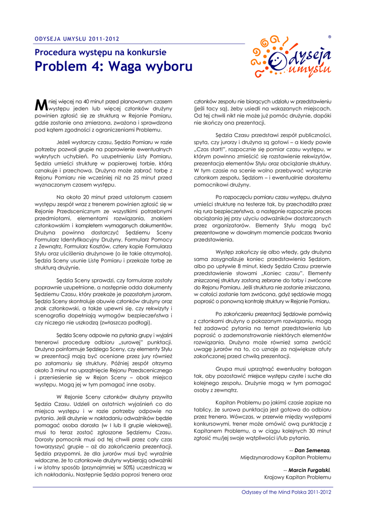 ODYSEJA UMYSŁU 2011-2012 Procedura występu na konkursie Problem 4: Waga wyboru M niej więcej na 40 minut przed planowanym czasem występu jeden lub więcej członków druŜyny powinien zgłosić się ze strukturą w Rejonie Pomiaru, gdzie zostanie ona zmierzona, zwaŜona i sprawdzona pod kątem zgodności z ograniczeniami Problemu. JeŜeli wystarczy czasu, Sędzia Pomiaru w razie potrzeby pozwoli grupie na poprawienie ewentualnych wykrytych uchybień. Po uzupełnieniu Listy Pomiaru, Sędzia umieści strukturę w papierowej torbie, którą oznakuje i przechowa. DruŜyna moŜe zabrać torbę z Rejonu Pomiaru nie wcześniej niŜ na 25 minut przed wyznaczonym czasem występu. Na około 20 minut przed ustalonym czasem występu zespół wraz z trenerem powinien zgłosić się w Rejonie Przedscenicznym ze wszystkimi potrzebnymi przedmiotami, elementami rozwiązania, znakiem członkowskim i kompletem wymaganych dokumentów. DruŜyna powinna dostarczyć Sędziemu Sceny Formularz Identyfikacyjny DruŜyny, Formularz Pomocy z Zewnątrz, Formularz Kosztów, cztery kopie Formularza Stylu oraz uściślenia druŜynowe (o ile takie otrzymała). Sędzia Sceny usunie Listę Pomiaru i przekaŜe torbę ze strukturą druŜynie. Sędzia Sceny sprawdzi, czy formularze zostały poprawnie uzupełnione, a następnie odda dokumenty Sędziemu Czasu, który przekaŜe je pozostałym jurorom. Sędzia Sceny skontroluje obuwie członków druŜyny oraz znak członkowski, a takŜe upewni się, czy rekwizyty i scenografia dopełniają wymogów bezpieczeństwa i czy niczego nie uszkodzą (zwłaszcza podłogi). Sędzia Sceny odpowie na pytania grupy i wyjaśni trenerowi procedurę odbioru „surowej” punktacji. DruŜyna poinformuje Sędziego Sceny, czy elementy Stylu w prezentacji mają być oceniane przez jury równieŜ po załamaniu się struktury. Później zespół otrzyma około 3 minut na uprzątnięcie Rejonu Przedscenicznego i przeniesienie się w Rejon Sceny – obok miejsca występu. Mogą jej w tym pomagać inne osoby. W Rejonie Sceny członków druŜyny przywita Sędzia Czasu. Udzieli on ostatnich wyjaśnień co do miejsca występu i w razie potrzeby odpowie na pytania. Jeśli druŜynie w nakładaniu odwaŜników będzie pomagać osoba dorosła (w I lub II grupie wiekowej), musi to teraz zostać zgłoszone Sędziemu Czasu. Dorosły pomocnik musi od tej chwili przez cały czas towarzyszyć grupie – aŜ do zakończenia prezentacji. Sędzia przypomni, Ŝe dla jurorów musi być wyraźnie widoczne, Ŝe to członkowie druŜyny wybierają odwaŜniki i w istotny sposób (przynajmniej w 50%) uczestniczą w ich nakładaniu. Następnie Sędzia poprosi trenera oraz członków zespołu nie biorących udziału w przedstawieniu (jeśli tacy są), Ŝeby usiedli na wskazanych miejscach. Od tej chwili nikt nie moŜe juŜ pomóc druŜynie, dopóki nie skończy ona prezentacji. Sędzia Czasu przedstawi zespół publiczności, spyta, czy jurorzy i druŜyna są gotowi – a kiedy powie „Czas start!”, rozpocznie się pomiar czasu występu, w którym powinno zmieścić się rozstawienie rekwizytów, prezentacja elementów Stylu oraz obciąŜanie struktury. W tym czasie na scenie wolno przebywać wyłącznie członkom zespołu, Sędziom – i ewentualnie dorosłemu pomocnikowi druŜyny. Po rozpoczęciu pomiaru czasu występu, druŜyna umieści strukturę na testerze tak, by przechodziła przez nią rura bezpieczeństwa, a następnie rozpocznie proces obciąŜania jej przy uŜyciu odwaŜników dostarczonych przez organizatorów. Elementy Stylu mogą być prezentowane w dowolnym momencie podczas trwania przedstawienia. Występ zakończy się albo wtedy, gdy druŜyna sama zasygnalizuje koniec przedstawienia Sędziom, albo po upływie 8 minut, kiedy Sędzia Czasu przerwie przedstawienie słowami „Koniec czasu”. Elementy zniszczonej struktury zostaną zebrane do torby i zwrócone do Rejonu Pomiaru. Jeśli struktura nie zostanie zniszczona, w całości zostanie tam zwrócona, gdyŜ sędziowie mogą poprosić o ponowną kontrolę struktury w Rejonie Pomiaru. Po zakończeniu prezentacji Sędziowie pomówią z członkami druŜyny o pokazanym rozwiązaniu, mogą teŜ zadawać pytania na temat przedstawienia lub poprosić o zademonstrowanie niektórych elementów rozwiązania. DruŜyna moŜe równieŜ sama zwrócić uwagę jurorów na to, co uznaje za największe atuty zakończonej przed chwilą prezentacji. Grupa musi uprzątnąć ewentualny bałagan tak, aby pozostawić miejsce występu czyste i suche dla kolejnego zespołu. DruŜynie mogą w tym pomagać osoby z zewnątrz. Kapitan Problemu po jakimś czasie zapisze na tablicy, Ŝe surowa punktacja jest gotowa do odbioru przez trenera. Wówczas, w przerwie między występami konkursowymi, trener moŜe omówić ową punktację z Kapitanem Problemu, a w ciągu kolejnych 30 minut zgłosić mu/jej swoje wątpliwości i/lub pytania. -- Dan Semenza, Międzynarodowy Kapitan Problemu -- Marcin Furgalski, Krajowy Kapitan Problemu Odyssey of the Mind Polska 2011-2012