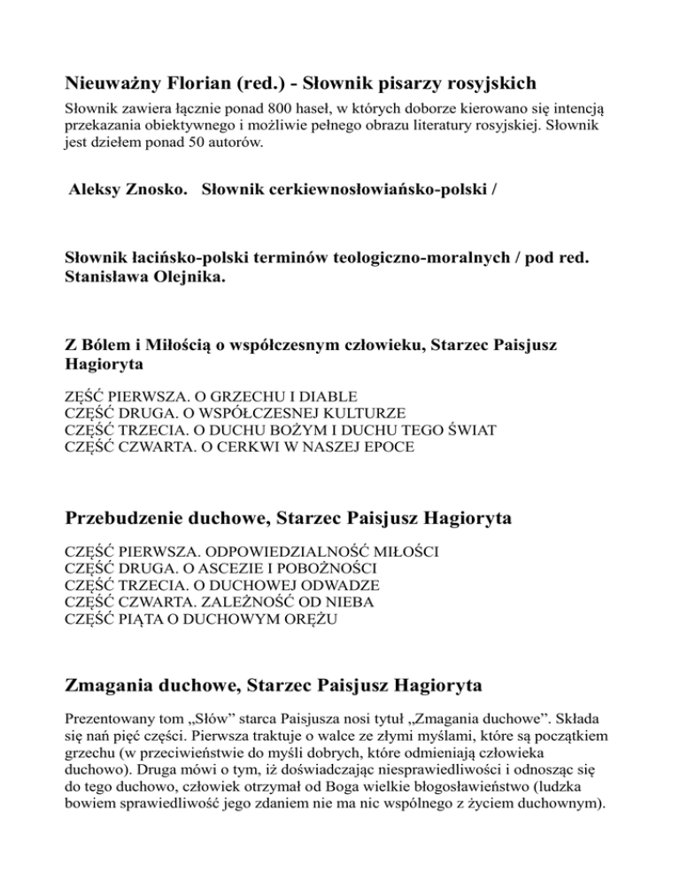 Nieuważny Florian (red.) - Słownik pisarzy rosyjskich Słownik zawiera łącznie ponad 800 haseł, w których doborze kierowano się intencją przekazania obiektywnego i możliwie pełnego obrazu literatury rosyjskiej. Słownik jest dziełem ponad 50 autorów. Aleksy Znosko. Słownik cerkiewnosłowiańsko-polski / Słownik łacińsko-polski terminów teologiczno-moralnych / pod red. Stanisława Olejnika. Z Bólem i Miłością o współczesnym człowieku, Starzec Paisjusz Hagioryta ZĘŚĆ PIERWSZA. O GRZECHU I DIABLE CZĘŚĆ DRUGA. O WSPÓŁCZESNEJ KULTURZE CZĘŚĆ TRZECIA. O DUCHU BOŻYM I DUCHU TEGO ŚWIAT CZĘŚĆ CZWARTA. O CERKWI W NASZEJ EPOCE Przebudzenie duchowe, Starzec Paisjusz Hagioryta CZĘŚĆ PIERWSZA. ODPOWIEDZIALNOŚĆ MIŁOŚCI CZĘŚĆ DRUGA. O ASCEZIE I POBOŻNOŚCI CZĘŚĆ TRZECIA. O DUCHOWEJ ODWADZE CZĘŚĆ CZWARTA. ZALEŻNOŚĆ OD NIEBA CZĘŚĆ PIĄTA O DUCHOWYM ORĘŻU Zmagania duchowe, Starzec Paisjusz Hagioryta Prezentowany tom „Słów” starca Paisjusza nosi tytuł „Zmagania duchowe”. Składa się nań pięć części. Pierwsza traktuje o walce ze złymi myślami, które są początkiem grzechu (w przeciwieństwie do myśli dobrych, które odmieniają człowieka duchowo). Druga mówi o tym, iż doświadczając niesprawiedliwości i odnosząc się do tego duchowo, człowiek otrzymał od Boga wielkie błogosławieństwo (ludzka bowiem sprawiedliwość jego zdaniem nie ma nic wspólnego z życiem duchownym). Trzecia część, nosząc tytuł „O grzechu i pokucie” traktuje o grzechu, który „czyni ziemskie życie człowieka piekielną męką” i uwalniającej od niego pokucie. W przedostatniej, czwartej części, starzec odsłania szatańskie siły, działające w świecie poprzez wszelkiej maści magów, czarowników i im podobnych. Książkę wieńczy piąty rozdział poświęcony sakramentowi spowiedzi i roli, jaką spełnia w nim przewodnik duchowy. Życie rodzinne, Starzec Paisjusz Hagioryta, W książce tej, jak czytamy w przedmowie, „zebrane zostały pouczenia starca na temat rodziny i tych prób, którym poddawany jest człowiek wskutek kryzysu, jaki przeżywa rodzina w naszych czasach”, a przyczyn problemów rodzinnych o. Paisjusz upatruje przede wszystkim w „oddaleniu się ludzi od Boga i ich egoizmie”. Język starca Paisjusza omawiający poszczególne kwestie, cechuje prostota i rozwaga, a obie te cechy zdają się być gwarantem korzyści, jakie czytelnik powinie odnieść po lekturze. Niektóre pouczenia starca zostały wzbogacone o fragmenty jego listów, przekazanych wydawcy przez duchownych i pobożnych świeckich, do których były one adresowane. Namiętności i cnoty chrześcijańskie, Starzec Paisjusz Hagioryta W niniejszym piątym tomie Słów, zebrane są słowa Starca, odnoszące się do namiętności i cnót chrześcijańskich. Składają się z odpowiedzi Starca na nasze pytania o rozpoznawaniu i leczeniu namiętności, a także o kultywowaniu cnót. Te odpowiedzi są interesujące nie tylko dla mnichów, ale dla każdego człowieka, mającego „dobry niepokój” o kształtowanie cnót. Starzec Paisjusz, znany ze swoich metod duszpasterskiego kierownictwa - trafnymi przykładami, błyskotliwym humorem - ogrzewa dusze ciepłem duchowym, pod działaniem którego rozkwitają w duszy kwiaty skruchy, przynoszące owoce cnót. Pobudza nas, byśmy mężnie spojrzeli w twarz swojemu staremu człowiekowi, znienawidzili jego „nikczemną maskę” i zrzucili ją. Listy misjonarskie, św. Mikołaj Serbski Listy misjonarskie świętego Mikołaja Serbskiego to doprawdy bezcenny dar dla współczesnego człowieka z jego problemami, rozterkami i wątpliwościami. Napisane zadziwiająco jasnym językiem, zrozumiałym dla każdego czytelnika, uderzają zarazem swoją siłą i głębią. Każdy wierzący, zapoznawszy się z nimi, jeszcze bardziej umocni się w wierze; niewierzący ujrzy prawdę w całym jej niepokalanym pięknie. Homilie, św. Mikołaj Serbski Książka zawiera komentarze do najbardziej charakterystycznych czytań z Pisma Świętego. Dzieła zebrane t. I, II, III, św. Grzegorz Peradze Zbiór dzieł Grzegorza Peradze - profesora Uniwersytetu Warszawskiego w okresie międzywojennym i męczennika Obozu Auschwitz. Grzegorz Peradze to jeden z najwybitniejszych Gruzinów XX wieku. Św. Grzegorz Peradze był znanym w ówczesnej Europie naukowcem. Zawdzięczamy mu wiele odkryć w zakresie monastycyzmu gruzińskiego, liturgii kościoła gruzińskiego i historii tego kraju. Opublikowane prace dotyczą szeregu zagadnień, jak historii chrześcijaństwa w Gruzji, literatury gruzińskiej, dzienników z podróży naukowych, patrologii, liturgiki. Komentarz Świętych Ojców do Ewangelii według Świętego Mateusza Jeden z najlepszych komentarzy do Ewangelii według Św. Mateusza Na wschód od zachodu, Radziukiewicz A. Książka ta to swoista podróż na Wschód - od Synaju po Nowogród Wielki, przez Grecję, Bułgarię. Rumunie, Ukrainę, Białoruś, na Wschód nie geograficzny, lecz duchowy. Jego pełnię możemy docenić, zwracając się co jakiś czas ku Zachodowi. Zapraszam do przyjrzenia się losom prawosławia, które dla tych krajów i narodów stanowiło fundament, podstawę jedności i długiego trwania. Rzeźbiło ono oblicze narodów bardziej niż włodarze, wojny, przewroty i rewolucje. Człowiek potrafi żyć bez granic państwowych. Ale życie bez granic kulturowych, bez korzeni, może okazać się dla niego próbą nie do wytrzymania. Dlatego w tej książce jest o kulturze, korzeniach i granicach. Jest o prawosławnej cywilizacji, dojrzewającej w basenie Morza Śródziemnego w Cesarstwie Bizantyńskim i przekazanej Słowianom pod koniec pierwszego tysiąclecia, jak hojny posag. Jest o centrach - filarach duchowej ojczyzny. Te centra to między innymi Konstantynopol, Atos, Synaj, Saloniki, Kijów, Turów, Połock, Wilno, Nowogród Wielki, Siergijew Posad, Supraśl, Ostróg, Neamt, Pustelnia Optyńska. Te cen