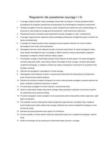 Regulamin dla pasażerów (wyciągi I i II) 1. Z wyciągu mogą korzystać osoby posiadające ważny bilet na przejazd. Z chwilą wykupienia biletu i przystąpienia do przejazdu pasażerowie są zobowiązani do przestrzegania niniejszych postanowień. 2. Przejazd wyciągiem może być zapewniony, jeżeli urządzenie jest otwarte dla ruchu pasażerskiego. W przeciwnym razie dostęp do wyciągu jest dla pasażerów i osób postronnych zabroniony. 3. Pasażerowie powinni posiadać sprzęt odpowiedni do jazdy wyciągiem tj. narty, snowboard itp. 4. Z wyciągu mogą korzystać wyłącznie osoby posiadające podstawowe umiejętności jazdy na nartach lub desce snowboardowej. 5. Z wyciągu nie mogą korzystać osoby znajdujące się pod wpływem alkoholu lub innych środków odurzających oraz osoby chore psychicznie. 6. Wprzęganie narciarzy może odbywać się tylko na peronie stacji dolnej. W czasie wprzęgania należy narty ustawić równolegle do trasy i pozostając w lekkim rozkroku uchwycić ręką drążek urządzenia holującego a następnie umieścić talerzyk między nogami. 7. W przypadku wyciągu 2osobowego przejazd może odbywać się tylko parami. W czasie wprzęgania narciarze stoją obok siebie, narty należy ustawić równolegle do trasy wyciągu, uchwycić ręką drążek urządzenia holującego, a następnie umieścić go między oczekującymi narciarzami na wysokości kroku niższego narciarza. 8. Zabrania się wprzęgania i wyprzęgania na trasie wyciągu. 9. Wyprzęganie może odbywać się tylko w wyznaczonej strefie (peronie) stacji górnej po przejechaniu przez narciarza poza ostatnia podporę. 10. Zabrania się używania urządzeń holujących do innych celów jak jazda wyciągiem, ponadto zabrania się jazdy z drążkiem urządzenia trzymanym w rękach. 11. W czasie jazdy wyciągiem nie wolno zbaczać z wyznaczonej trasy . 12. Jeżeli w czasie jazdy nastąpi zatrzymanie wyciągu należy spokojnie oczekiwać na ponowne ruszenie lub zastosować się do poleceń obsługi. 13. W czasie wprzęgania i jazdy wyciągiem aż do opuszczenia peronu stacji górnej należy wyjąć ręce z pętli kijków narciarskich. 14. Przy wjeździe na peron stacji górnej należy energicznie wyjąć talerzyk z pomiędzy nóg a następnie puścić drążek przed siebie wzdłuż trasy wyciągu. Zabrania się rzucania urządzeniem holującym w bok od kierunku jazdy. 15. Zabrania się wykorzystywania trasy wjazdu do schodzenia . 16. W razie wypadku na trasie wjazdu należy jak najszybciej wypiąć się z urządzenia holującego i opuścić trasę. 17. Osoby nie stosujące się do powyższych postanowień będą usuwane z wyciągu.