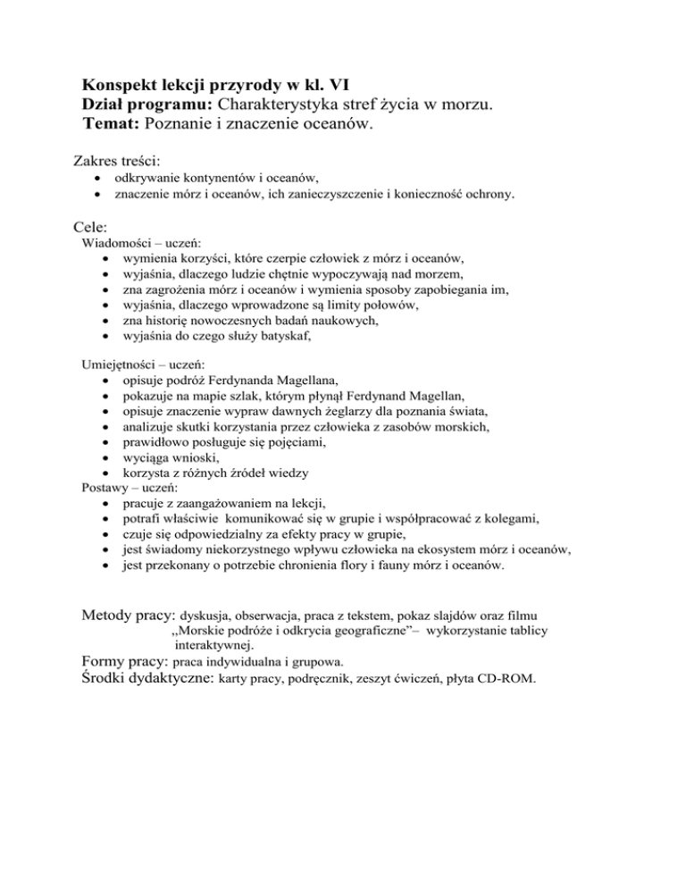 Konspekt lekcji przyrody w kl. VI Dział programu: Charakterystyka stref życia w morzu. Temat: Poznanie i znaczenie oceanów. Zakres treści: odkrywanie kontynentów i oceanów, znaczenie mórz i oceanów, ich zanieczyszczenie i konieczność ochrony. Cele: Wiadomości – uczeń: wymienia korzyści, które czerpie człowiek z mórz i oceanów, wyjaśnia, dlaczego ludzie chętnie wypoczywają nad morzem, zna zagrożenia mórz i oceanów i wymienia sposoby zapobiegania im, wyjaśnia, dlaczego wprowadzone są limity połowów, zna historię nowoczesnych badań naukowych, wyjaśnia do czego służy batyskaf, Umiejętności – uczeń: opisuje podróż Ferdynanda Magellana, pokazuje na mapie szlak, którym płynął Ferdynand Magellan, opisuje znaczenie wypraw dawnych żeglarzy dla poznania świata, analizuje skutki korzystania przez człowieka z zasobów morskich, prawidłowo posługuje się pojęciami, wyciąga wnioski, korzysta z różnych źródeł wiedzy Postawy – uczeń: pracuje z zaangażowaniem na lekcji, potrafi właściwie komunikować się w grupie i współpracować z kolegami, czuje się odpowiedzialny za efekty pracy w grupie, jest świadomy niekorzystnego wpływu człowieka na ekosystem mórz i oceanów, jest przekonany o potrzebie chronienia flory i fauny mórz i oceanów. Metody pracy: dyskusja, obserwacja, praca z tekstem, pokaz slajdów oraz filmu ,,Morskie podróże i odkrycia geograficzne”– wykorzystanie tablicy interaktywnej. Formy pracy: praca indywidualna i grupowa. Środki dydaktyczne: karty pracy, podręcznik, zeszyt ćwiczeń, płyta CD-ROM. Przebieg lekcji: Faza wstępna: I. 1. Sprawy organizacyjno-porządkowe. 2. Przypomnienie wiadomości z poprzedniej lekcji: jakie są źródła dźwięku? co to jest dźwięk? kiedy powstaje echo? do czego służy echosonda? II. Faza realizacji: 1. Oglądanie slajdów oraz filmu na temat podróży Ferdynanda Magellana. Znaczenie odkryć geograficznych. 2. Przeprowadzenie krótkiego wykładu na temat nowoczesnych badań naukowych, przybliżenie postaci Augusta Picarda. 3. Praca w grupach: na podstawie zdobytych wcześniej informacji oraz tekstów zawartych w podręczniku uczniowie odpowiadają na pytania (zał.1). 4. Podsumowanie przez nauczyciela pracy w grupach. 5. Zapisanie krótkiej notatki do zeszytu przedmiotowego. III. Faza podsumowująca: 1. Ocena pracy uczniów. 2. Podanie i omówienie pracy domowej: zeszyt ćw. Zad. 40 str.63, zad.42 str.64, dla chętnych 43 str.64 Opracowanie Magdalena Gajda Załącznik 1. Karta pracy dla grupy 1 Korzystając z tekstu w podręczniku odpowiedz na pytania: 1. Jakie korzyści czerpie człowiek z mórz i oceanów? 2. Na czym polega transport morski? Karta pracy dla grupy 2 Korzystając z tekstu w podręczniku odpowiedz na pytania: 1. Co to jest batyskaf? Do czego służy? 2. Jak chronić florę i faunę mórz i oceanów? Karta pracy dla grupy 3 Korzystając z tekstu w podręczniku odpowiedz na pytania: 1. Dlaczego ludzie chętnie wypoczywają nad morzem? 2. Jakie są główne zagrożenia mórz i oceanów? Jak im zapobiec? Karta pracy dla grupy 4 Korzystając z tekstu w podręczniku odpowiedz na pytania: 1. Jakie korzyści czerpie człowiek z mórz i oceanów? 2. Dlaczego wprowadzone są limity połowów? Karta pracy dla grupy 5 Korzystając z tekstu w podręczniku odpowiedz na pytania: 1. Jakie surowce mineralne znajdują się na dnie oceanów? 2. Co to znaczy, że ocean jest źródłem energii? 1960 - Jacques Piccard i Donald Walsh zanurzyli się w batyskafie "Trieste II" w Rowie Mariañskim i osiągneli głębokość 10916 metrów.