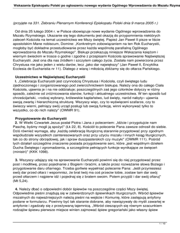 Wskazania Episkopatu Polski po ogłoszeniu nowego wydania Ogólnego Wprowadzenia do Mszału Rzyms (przyjęte na 331. Zebraniu Plenarnym Konferencji Episkopatu Polski dnia 9 marca 2005 r.) Od dnia 25 lutego 2004 r. w Polsce obowiązuje nowe wydanie Ogólnego wprowadzenia do Mszału Rzymskiego. Ukazanie się tego dokumentu jest okazją do przypomnienia niektórych zaleceń Kościoła na temat uczestnictwa we Mszy świętej. Papież Jan Paweł II pisze w liście apostolskim Mane nobiscum, Domine: „Konkretnym zobowiązaniem na ten Rok Eucharystii, mogłoby być dokładne przestudiowanie przez każda wspólnotę parafialną Ogólnego wprowadzenia do Mszału Rzymskiego". Biskupi przekazują niniejsze Wskazania księżom i wiernym świeckim w trosce o godne i zgodne z przepisami Kościoła sprawowanie Najświętszej Eucharystii. Jest ona dla nas źródłem i szczytem całego życia. Została nam powierzona przez Chrystusa nie jako jeden z wielu darów, lecz „jako dar największy" (Jan Paweł II, Encyklika Ecclesia de Eucharistia nr 11). Dlatego z wiarą i miłością zbliżamy się do ołtarza Pańskiego. Uczestnictwo w Najświętszej Eucharystii l. „Celebracja Eucharystii jest czynnością Chrystusa i Kościoła, czyli świętego ludu zjednoczonego i zorganizowanego pod zwierzchnictwem biskupa. Należy ona do całego Ciała Kościoła, ujawnia je i na nie oddziałuje; poszczególnych zaś jego członków dotyczy w różny sposób, zależnie od zróżnicowania stanów, funkcji i aktualnego uczestnictwa. W ten sposób lud chrześcijański, «rodzaj wybrany, królewskie kapłaństwo, lud święty, naród nabyty» ujawnia swoją zwartą i hierarchiczną strukturę. Wszyscy więc, czy to wyświęceni szafarze, czy to świeccy wierni, pełniący swój urząd posługi lub swoją funkcję, winni wykonywać tylko to wszystko, co do nich należy" (OWMR 91). Przygotowanie do Eucharystii 2. W Wielki Czwartek Jezus posłał Piotra i Jana z poleceniem: „Idźcie i przygotujcie nam Paschę, byśmy mogli ją spożyć" (Łk 22, 8). Kościół to polecenie Pana zawsze odnosił do siebie. Dziś również wymaga, aby „każdą celebrację liturgiczną starannie przygotować przy zgodnym współudziale wszystkich zainteresowanych oraz przy użyciu mszału i innych ksiąg liturgicznych, tak co do strony obrzędowej, jak i spraw duszpasterskich czy muzyki" (OWMR 111). Pośród tych działań szczególne znaczenie posiada przygotowanie serc, które „jest wspólnym dziełem Ducha Świętego i zgromadzenia, a szczególnie pełniących funkcje wynikające ze święceń (ministri)" (KKK 1098). 3. Wszyscy udający się na sprawowanie Eucharystii powinni się do niej przygotować przez post i modlitwę, przez pojednanie z Bogiem i braćmi, a także przez rozważanie słowa Bożego i przygotowanie daru ofiarnego. Trzeba gorliwie wypełniać polecenie Pana: .Jeśli przyniesiesz swój dar przed ołtarz i wspomnisz, że brat twój ma coś przeciw tobie, zostaw tam dar swój przed ołtarzem i najpierw idź i pojednaj się z bratem swoim. Potem przyjdź i dar swój ofiaruj" (Mt 5,24). 4. Należy dbać o odpowiedni dobór śpiewów na poszczególne części Mszy świętej. Odpowiednie pieśni znajdują się w zatwierdzonych śpiewnikach liturgicznych. Wśród śpiewów mszalnych do najważniejszych należą pieśni na wejście i Komunię, które zastępują antyfony podane w formularzu. Powinny być tak staranie dobrane, aby nawiązywały do myśli zawartej w antyfonie i zgadzały się z przeżywaną tajemnicą. „Wśród cieszących się równym szacunkiem rodzajów śpiewu pierwsze miejsce winien zajmować śpiew gregoriański jako własny śpiew 1 / 10 Wskazania Episkopatu Polski po ogłoszeniu nowego wydania Ogólnego Wprowadzenia do Mszału Rzymsk liturgii rzymskiej. Nie są bynajmniej wykluczone inne rodzaje muzyki, zwłaszcza wielogłosowa, byleby odpowiadały duchowi czynności liturgicznej i sprzyjały uczestnictwu wszystkich wiernych" (OWMR 41). Warunków tych nie spełniają piosenki religijne, dlatego nie można ich śpiewać w czasie liturgii. 5. Aby celebrowanie Eucharystii było czytelnym znakiem godnie sprawowanym, bardzo ważne jest właściwe urządzenie przestrzeni sakralnej, zwłaszcza prezbiterium. (Jest tak wówczas, gdy podkreślona jest centralna rola ołtarza, przy którym sprawuje się Mszę świętą; stół słowa Bożego, czyli ambona, nie jest pulpitem przenośnym: a miejsce przewodniczenia, uwydatniające funkcję przewodniczącego zgromadzenia, istnieje na stale i jest odpowiednio wyeksponowane). Ołtarz należy umieścić w prezbiterium na stale, w takim miejscu „by rzeczywiście stanowił ośrodek, ku któremu spontanicznie zwracać się będzie uwaga całego zgromadzenia wiernych" (OWMR 299). Na ołtarzu lub obok niego należy umieścić krzyż z wizerunkiem Chrystusa ukrzyżowanego (zob. OWMR 308). Należy zadbać o właściwe miejsce i wygląd ambony - stołu słowa Bożego, która nie może być jedynie zwykłym przenośnym pulpitem (zob. OWMR 309). Podobnie należy dowartościować miejsce przewodniczenia, które powinno być stale i odpowiednio wyeksponowane. W tym względzie należy przestrzegać dokładnie normy podane w V rozdziale OWMR. 6. „Należy również zachować w odpowiednim czasie pełne czci milczenie. Jego natura zależy od czasu, w jakim jest przewidziane w poszczególnych obrzędach. W akcie pokuty i po wezwaniu do modlitwy wierni skupiają się w sobie; po czytaniu lub homilii krótko rozważają to, co usłyszeli; po Komunii świętej zaś wychwalają Boga w sercu i modlą się do Niego. Godne pochwały jest zachowanie milczenia w kościele, w zakrystii i w przylegających do niej pomieszczeniach już przed rozpoczęciem celebracji, aby wszyscy pobożnie i godnie przygotowali się do sprawowania świętych czynności" (OWMR 45). 7. Sprawowanie Eucharystii powinno się odznaczać godnością i pięknem, gdyż jest ona celebracją paschalnego misterium Chrystu