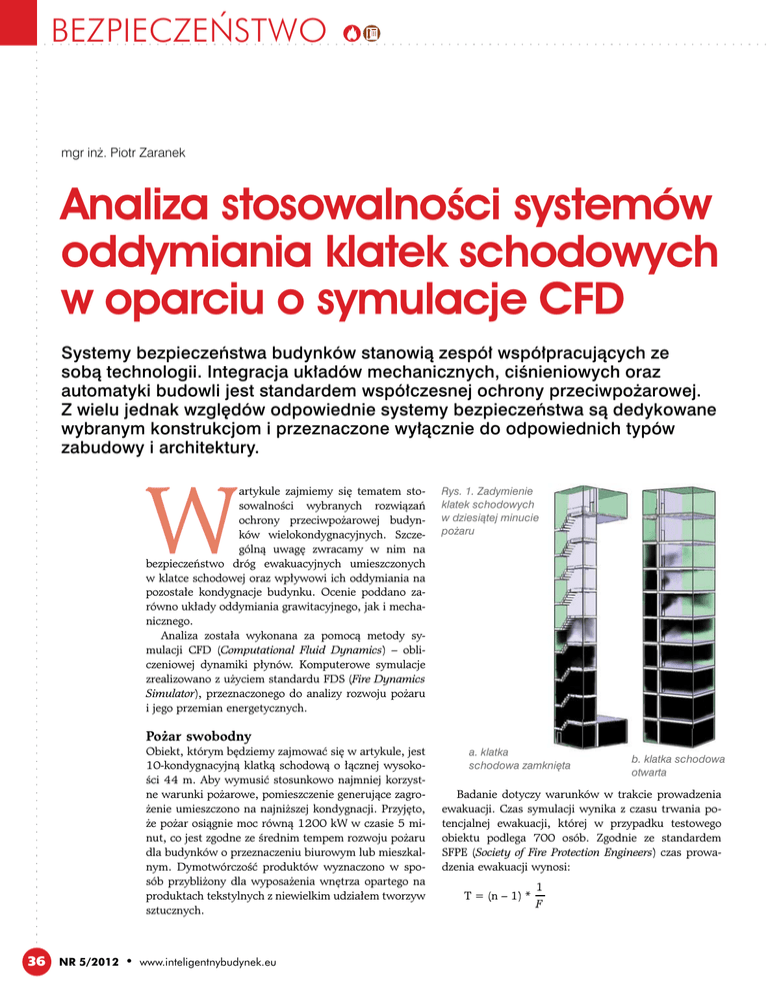 BEZPIECZEŃSTWO mgr inż. Piotr Zaranek Analiza stosowalności systemów oddymiania klatek schodowych w oparciu o symulacje CFD Systemy bezpieczeństwa budynków stanowią zespół współpracujących ze sobą technologii. Integracja układów mechanicznych, ciśnieniowych oraz automatyki budowli jest standardem współczesnej ochrony przeciwpożarowej. Z wielu jednak względów odpowiednie systemy bezpieczeństwa są dedykowane wybranym konstrukcjom i przeznaczone wyłącznie do odpowiednich typów zabudowy i architektury. W artykule zajmiemy się tematem stosowalności wybranych rozwiązań ochrony przeciwpożarowej budynków wielokondygnacyjnych. Szczególną uwagę zwracamy w nim na bezpieczeństwo dróg ewakuacyjnych umieszczonych w klatce schodowej oraz wpływowi ich oddymiania na pozostałe kondygnacje budynku. Ocenie poddano zarówno układy oddymiania grawitacyjnego, jak i mechanicznego. Analiza została wykonana za pomocą metody symulacji CFD (Computational Fluid Dynamics) – obliczeniowej dynamiki płynów. Komputerowe symulacje zrealizowano z użyciem standardu FDS (Fire Dynamics Simulator), przeznaczonego do analizy rozwoju pożaru i jego przemian energetycznych. Rys. 1. Zadymienie klatek schodowych w dziesiątej minucie pożaru Pożar swobodny Obiekt, którym będziemy zajmować się w artykule, jest 10-kondygnacyjną klatką schodową o łącznej wysokości 44 m. Aby wymusić stosunkowo najmniej korzystne warunki pożarowe, pomieszczenie generujące zagrożenie umieszczono na najniższej kondygnacji. Przyjęto, że pożar osiągnie moc równą 1200 kW w czasie 5 minut, co jest zgodne ze średnim tempem rozwoju pożaru dla budynków o przeznaczeniu biurowym lub mieszkalnym. Dymotwórczość produktów wyznaczono w sposób przybliżony dla wyposażenia wnętrza opartego na produktach tekstylnych z niewielkim udziałem tworzyw sztucznych. 36 NR 5/2012 • www.inteligentnybudynek.eu a. klatka schodowa zamknięta b. klatka schodowa otwarta Badanie dotyczy warunków w trakcie prowadzenia ewakuacji. Czas symulacji wynika z czasu trwania potencjalnej ewakuacji, której w przypadku testowego obiektu podlega 700 osób. Zgodnie ze standardem SFPE (Society of Fire Protection Engineers) czas prowadzenia ewakuacji wynosi: T = (n – 1) * 1 F BEZPIECZEŃSTWO gdzie: n - liczba osób (700) F – strumień osób (F=1,32*We) We – średnica efektywna drzwi (1 m) W związku z tymi założeniami czas prowadzenia ewakuacji równy jest 530 s, co oznacza, że wszelkie dalsze badania skupione zostały w przedziale czasu do 10 minut. Aby odpowiednio zestawić działanie badanych systemów przeciwpożarowych, wykonano wcześniej symulację prezentującą nieograniczony rozwój pożaru w obszarze klatki schodowej. Analizę przeprowadzono w dwóch wariantach: w jednym założono zamknięcie poszczególnych kondygnacji drzwiami o odporności ogniowej, w drugim – udostępnienie wszystkich. Klatka schodowa w obu przypadkach jest napowietrzana przez drzwi umieszczone na najniższym poziomie, a klapy oddymiające nie uczestniczą w oddymianiu i pozostają zamknięte. W wyniku przeprowadzonej symulacji odnotowano, że pomimo większej kubatury obiektu o otwartych kondygnacjach dochodzi do jego znacznie wyraźniejszego zadymienia. Paradoksalnie zadymienie klatki schodowej o mniejszej kubaturze okazuje się wyraźnie mniejsze i dotyczy wyłącznie czterech kondygnacji. W przypadku klatki z otwartymi pomieszczeniami dochodzi do pełnego zadymienia aż ośmiu kondygnacji klatki schodowej oraz blisko sześciu poziomów mieszkalnych (rys. 1). Prawdopodobną konsekwencją opisanego stanu rzeczy jest rozkład temperatury zależący od otwarcia i zamknięcia pomieszczeń w bezpośrednim sąsiedztwie klatki schodowej. Rzeczywiście dochodzi do podwyższenia temperatury w obszarze klatki schodowej w przypadku otwarcia drzwi do pomieszczeń. W rezultacie temperatura na drodze ewakuacji budynku o otwar- tych drzwiach jest wyraźnie wyższa niż w budynku o drzwiach zamkniętych (rys. 2). Co zatem jest przyczyną większego zadymienia i wyższego poziomu temperatury? Odpowiedź na zadane pytanie przynosi rozkład prędkości. Okazuje się bowiem, że w przypadku ograniczonej objętości budynku zamkniętego dochodzi do wymuszonego oddymiania przez drzwi napowietrzające znajdujące się na kondygnacji parterowej. W rezultacie prędkość unoszenia dymu w klatce schodowej jest znacznie mniejsza, co powoduje redukcję zadymienia (rys. 3). Dodatkowo pomiar prędkości przepływu w drzwiach potwierdza opisaną tezę – 0,6 m/s przy klatce bez otwartych kondygnacji i aż 1,7 m/s przy kondygnacjach zamkniętych. Rys. 3. Prędkość powietrza w klatce schodowej w dziesiątej minucie pożaru a. klatka schodowa zamknięta b. klatka schodowa otwarta Reasumując, powszechnie stosowana metoda zabezpieczania budynku z użyciem drzwi o odporności ogniowej przynosi dodatkowe korzyści, inne niż docelowo zakładane. Powoduje nie tylko odcięcie poszczególnych kondygnacji od zagrożenia pożarowego, ale także zmniejszenie zadymienia na klatce schodowej stanowiącej drogę ewakuacyjną. Oddymianie grawitacyjne a. klatka schodowa zamknięta b. klatka schodowa otwarta Rys. 2. Temperatura w klatce schodowej w dziesiątej minucie pożaru System oddymiania grawitacyjnego powoduje utworzenie ciągu, który jest wynikiem różnicy ciśnienia na linii klapa dymowa – drzwi napowietrzające. Naturalną konsekwencją tego stanu jest zwiększenie prędkości powietrza i uniesienie chmury gazów pożarowych ku górze klatki schodowej. Oddymianie nie odbywa się jak wcześniej przez drzwi, ale wyłącznie przez klapy dymowe, co jest także przyczyną pełnego zadymienia klatki schodowej (rys. 4). Stan ten nie jest pożądany, ale w przypadku dużych pożarów, a szczególnie tych umieszczonych na wyższych kondygnacjach, stanowi skuteczne rozwiązanie zabezpieczające niższe kondygnacje. www.inteligentnybudynek.eu • NR 5/2012 37 BEZPIECZ