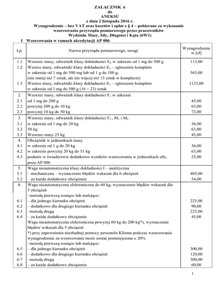 załącznik A (CENNIK) – dla Wydziału Masy, Siły, Długości i Kąta