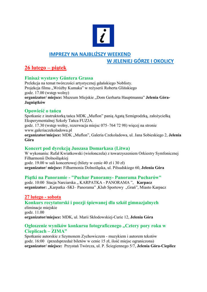 IMPREZY NA NAJBLIŻSZY WEEKEND W JELENIEJ GÓRZE I OKOLICY 26 lutego – piątek Finisaż wystawy Gűntera Grassa Prelekcja na temat twórczości artystycznej gdańskiego Noblisty. Projekcja filmu „Wróżby Kumaka” w reżyserii Roberta Glińskiego godz. 17.00 (wstęp wolny) organizator/ miejsce: Muzeum Miejskie „Dom Gerharta Hauptmanna” Jelenia GóraJagniątków Opowieść o tańcu Spotkanie z instruktorką tańca MDK „Muflon” panią Agatą Szmigrodzką, założycielką Eksperymentalnej Szkoły Tańca FUZJA. godz. 17.30 (wstęp wolny, rezerwacja miejsc 075–764 72 98) więcej na stronie www.galeriaczekoladowa.pl organizator/miejsce: MDK „Muflon”, Galeria Czekoladowa, ul. Jana Sobieskiego 2, Jelenia Góra Koncert pod dyrekcją Juozasa Domarkasa (Litwa) W wykonaniu: Rafał Kwiatkowski (wiolonczela) z towarzyszeniem Orkiestry Symfonicznej Filharmonii Dolnośląskiej godz. 19.00 w sali koncertowej (bilety w cenie 40 zł i 30 zł) organizator/ miejsce: Filharmonia Dolnośląska, ul. Piłsudskiego 60, Jelenia Góra Piątki na Panoramie - "Puchar Panoramy- Panorama Pucharów" godz. 10:00 Stacja Narciarska „ KARPATKA - PANORAMA ”, Karpacz organizator: „Karpatka -SKI– Panorama” ,Klub Sportowy „Grań”, Miasto Karpacz 27 lutego - sobota Konkurs recytatorski i poezji śpiewanej dla szkół gimnazjalnych eliminacje miejskie godz. 11.00 organizator/miejsce: MDK, ul. Marii Skłodowskiej-Curie 12, Jelenia Góra Ogłoszenie wyników konkursu fotograficznego „Cztery pory roku w Cieplicach – ZIMA” Spotkanie autorskie z Szymonem Zychowiczem - muzykiem i autorem tekstów godz. 16:00 (przedsprzedaż biletów w cenie 15 zł, ilość miejsc ograniczona) organizator/ miejsce: Przystań Twórcza, ul. P. Ściegiennego 5/7, Jelenia Góra-Cieplice Koncert Szymona Zychowicza godz. 16.oo miejsce/organizator: Przystań Twórcza, ul P. Ściegiennego 5/7, Jelenia Góra - Cieplice Festiwal Bajek Świata, Katarzyna Morawska i Dorota BąblińskaKorczycka godz. 16:00 Książnica Karkonoska przy ul. Bankowej 27, Jelenia Góra organizator: Zdrojowy Teatr Animacji w Jeleniej Górze Spektakl „Woyzeck” Georg Buchner Teatru Odnalezionego godz. 19:00 Sala widowiskowa JCK, ul. Bankowa 28/30, Jelenia Góra (przed spektaklem do nabycia programy w cenie 5 zł) Organizator: Jeleniogórskie Centrum Kultury, Teatr Odnaleziony Rozgrywki I Ligi Piłki Koszykowej Mężczyzn Mecz pomiędzy KS Sudety Jelenia Góra – ŻUBRY godz. 18:00 Hala sportowa Sudecka 42, Jelenia Góra Organizator: Klub Sportowy „Sudety” Jelenia Góra Rozgrywki IV Ligi piłki siatkowej mężczyzn. Mecz pomiędzy KS Kolegium Karkonoskie Jelenia Góra – MKS Pogoń Góra godz. 13:00 Szkoła Podstawowa Nr 11, ul. Moniuszki 9 , Jelenia Góra Organizator : Klub Siatkarski Kolegium Karkonoskie Jelenia Góra Rodeo Show Jazdy konne w stylu nna RODEO SHOW z bizonami i cielakami ognisko z kiełbaskami, nauka tańca kowbojskiego, muzyka country w Salonie. godz. 19:00 , organizator /miejsce: Western City Ściegny k/Karpacza Puchar Kontynentalny COC Impreza ma charakter międzynarodowy, w którym wezmą udział zawodnicy z całego świata. godz.: 10:00 skocznia narciarska Orlinek, trasa biegowa, Karpacz Górny organizator: Miasto Karpacz „Świnka Halinka” w Klubie Jazgot godz. 21.oo (wstęp 10,- zł) miejsce/ organizator: klub „Jazgot” - Szklarska Poręba Ściągnij Narty Chodź na Party!!! Restauracja Muzyczna nad Zaporą zaprasza na cykl imprez tanecznych dla amatorów białego szaleństwa i nie tylko. Imprezujemy przez cały sezon - codziennie - serdecznie zapraszamy. start godz. 20:00 organizator/miejsce: Rest. Muzyczna nad Zaporą, ul. Rybacka 8, Karpacz Muzyka w kościółku „Wang” Zespół "JAK Amadeusz" godz. 20:00 kościółek Wang, Karpacz organizator: Parafia Wang w Karpaczu, Fundacja Karkonosze - Muzyka Serc Gwiazdy na Śniegu Szklarska Poręba w świetle reporterskich fleszy! godz.11:30 stok SKIERENY SZRENICA! Szklarska Poręba organizator: Miasto Szklarska Poręba Liga Sań Rogatych Zjazdy saniami do marca w każdą śnieżna sobotę. Więcej www.sanierogate.kowary.pl Start godz. 12:00 przełęcz Okraj organizator: Urząd Miejski Kowary oraz Towarzystwo Miłośników Sań Rogatych 28 lutego - niedziela W niedzielę na wycieczkę – Rajd na raty Trasa: przystanek MZK „Ludowa” Cieplice - „Pałac na Wodzie” Staniszów – osiedle Czarne – Jelenia Góra. O godz. 13.30 spotkanie w Klubie Nauczyciela inaugurujące sezon . godz. 9.25 wyjazd spod dworca PKP w Jeleniej Górze autobusem MZK nr 9 w kierunku Cieplic organizator: ZO PTTK Jelenia Góra XVII Ogólnopolski Turniej Tańca Towarzyskiego o Puchar Prezydenta Miasta Jeleniej Góry od godz. 10:00 Sala przy ul. Obrońców Pokoju 26a, Jelenia Góra organizator: Szkoła Tańca „Beaty i Tomasza Tabor”, Mecenat Miasta Jelenia Góra Logopedia na wesoło Zapraszamy dzieci w wieku przedszkolnym na bajkę logopedyczną, którą przedstawi Monika Mikulska godz. 12:00 (konieczna rezerwacja miejsc 075 – 764 72 98) www.galeriaczekoladowa.pl miejsce/organizator: Galeria Czekoladowa, ul. Jana Sobieskiego 2, Jelenia Góra Spektakl „Tomcio Paluszek” godz. 16:00 sala widowiskowa JCK przy ul. Bankowej 27, Jelenia Góra organizator: Zdrojowy Teatr Animacji w Jeleniej Górze Rozgrywki Ligi Młodzików Piłki Koszykowej Mecz pomiędzy KS Sudety Jelenia Góra – ZASTAL II godz. 11:00, hala sportowa przy ul. Sudeckiej 42, Jelenia Góra organizator: Klub Sportowy „Sudety” Jelenia Góra Przedwiośnie muzyczne w klimatach jazzujących - koncert Koncertowi towarzyszyć będzie wystawa prac ze szkła absolwentów Liceum Plastycznego w Jeleniej Górze- Cieplicach. godz. 18:00 miejsce/organizator : Hotel *** Restauracja Caspar, Pac Piastowski 28, Jelenia GóraCieplice XV Amatorskie Mistrzostwa Polski w Narciarstwie Alpejskim, Biegowym i Snowboardzie "Tauron Family Cup" 2010 Mistrzostwa Województwa Dolnośląskiego w Narciarstwie Alpejskim i Snowboardzie Zawody z cyklu Am