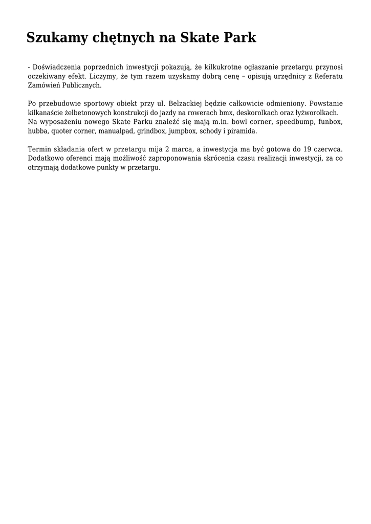Szukamy chętnych na Skate Park - Doświadczenia poprzednich inwestycji pokazują, że kilkukrotne ogłaszanie przetargu przynosi oczekiwany efekt. Liczymy, że tym razem uzyskamy dobrą cenę – opisują urzędnicy z Referatu Zamówień Publicznych. Po przebudowie sportowy obiekt przy ul. Belzackiej będzie całkowicie odmieniony. Powstanie kilkanaście żelbetonowych konstrukcji do jazdy na rowerach bmx, deskorolkach oraz łyżworolkach. Na wyposażeniu nowego Skate Parku znaleźć się mają m.in. bowl corner, speedbump, funbox, hubba, quoter corner, manualpad, grindbox, jumpbox, schody i piramida. Termin składania ofert w przetargu mija 2 marca, a inwestycja ma być gotowa do 19 czerwca. Dodatkowo oferenci mają możliwość zaproponowania skrócenia czasu realizacji inwestycji, za co otrzymają dodatkowe punkty w przetargu.