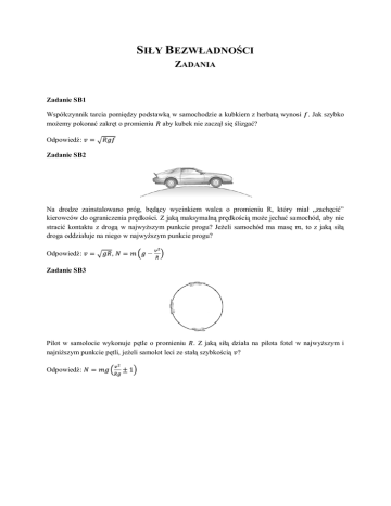 SIŁY BEZWŁADNOŚCI ZADANIA Zadanie SB1 Współczynnik tarcia pomiędzy podstawką w samochodzie a kubkiem z herbatą wynosi . Jak szybko możemy pokonać zakręt o promieniu aby kubek nie zaczął się ślizgać? Odpowiedź: Zadanie SB2 Na drodze zainstalowano próg, będący wycinkiem walca o promieniu R, który miał „zachęcić” kierowców do ograniczenia prędkości. Z jaką maksymalną prędkością może jechać samochód, aby nie stracić kontaktu z drogą w najwyższym punkcie progu? Jeżeli samochód ma masę , to z jaką siłą droga oddziałuje na niego w najwyższym punkcie progu? Odpowiedź: , Zadanie SB3 Pilot w samolocie wykonuje pętle o promieniu . Z jaką siłą działa na pilota fotel w najwyższym i najniższym punkcie pętli, jeżeli samolot leci ze stałą szybkością ? Odpowiedź: Zadanie SB4 Do piłki przyczepiono sznurek o długości i zaczęto zataczać nią w powietrzu kółka. Jaka musi być minimalna prędkość piłki w najwyższym punkcie toru, aby piłka zatoczyła pełne koło? Odpowiedź: Zadanie SB5 W koraliku o masie wywiercono otwór w ten sposób, że może on się swobodnie poruszać po śliskiej obręczy o promieniu . Jakie będą wychylenia punktów równowagi, jeżeli obręcz wiruje z częstością ? Pytanie bonusowe: Jeżeli odchylimy koralik o jakiś niewielki kąt od pionu, to jaka będzie częstość jego drgań? Odpowiedź: , , ; Zadanie SB6 Do ciała o masie przyczepiono nieważką linkę. Następnie położono je na gładkim stole i wprawiono w ruch po okręgu o promieniu . Drugi koniec linki przechodzi przez dziurę w stole (znajdującą się dokładnie w środku okręgu po którym porusza cię ciało ) i przyczepiony jest do ciała o masie . Jaka musi być prędkość ciała , aby układ znalazł się w równowadze. Odpowiedź: Zadanie SB7 W wesołym miasteczku znajduje się specjalne pomieszczenie w kształcie walca o promieniu , które obraca się z częstością . Jaka musi być minimalna częstość obrotu, żeby po otwarciu zapadki w podłodze pomieszczenia ludzie w nim się znajdujący pozostawali przyparci do ścian i tym samym nie spadali? Współczynnik tarcia statycznego ścian pomieszczenia wynosi . Odpowiedź: Zadanie SB8 O jaki kąt odchyli się poziom cieczy przewożonej w cysternie, gdy cysterna hamuje z opóźnieniem ? Odpowiedź: Zadanie SB9 Na poziomej desce o masie leży ciało o masie . Jaką maksymalną siłę możemy przyłożyć do deski (w kierunku poziomym), aby ciało się nie ślizgało? Współczynnik tarcia pomiędzy deską a podłożem oraz między ciałem a deską (zakładamy, że współczynniki tarcia statycznego i dynamicznego są równe) wynosi . Odpowiedź: Zadanie SB10 Z jakim maksymalnym przyspieszeniem w lewo może poruszać się równia , aby ciało względem niej pozostawało w spoczynku. Współczynnik tarcia wynosi (wszystko odbywa się przy cichym założeniu, że ). Odpowiedź: Zadanie SB11 Z jakim przyspieszeniem powinien poruszać się klocek , aby masy spoczynku względem niego? Współczynnik tarcia między wynosi . i pozostawały w klockiem a masami Odpowiedź: Zadanie SB12 Na równi pochyłej o masie i kącie nachylenia położono ciało o masie ciało mogą się poruszać swobodnie bez tarcia. Znajdź przyspieszenie równi. Odpowiedź: . Zarówno równia jak i Zadanie SB13 Jakie będzie przyspieszenie równi, jeżeli masy ciała nachylenia równi wynosi ? Odpowiedź: i równi są znane, nie ma tarcia, a kąt