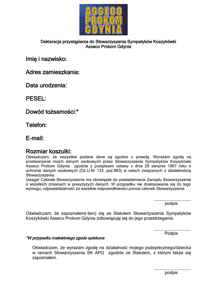 Deklaracja przystąpienia do Stowarzyszenia Sympatyków Koszykówki Asseco Prokom Gdynia Imię i nazwisko: Adres zamieszkania: Data urodzenia: PESEL: Dowód tożsamości:* Telefon: E-mail: Rozmiar koszulki: Oświadczam, że wszystkie podane dane są zgodne z prawdą. Wyrażam zgodę na przetwarzanie moich danych osobowych przez Stowarzyszenia Sympatyków Koszykówki Asseco Prokom Gdynia zgodnie z przepisami ustawy z dnia 29 sierpnia 1997 roku o ochronie danych osobowych (Dz.U.Nr 133, poz.883) w celach związanych z działalnością Stowarzyszenia. Uwaga! Członek Stowarzyszenia ma obowiązek do powiadamiania Zarządu Stowarzyszenia o wszelkich zmianach w powyższych danych. W przypadku nie dostosowania się do tego wymogu, odpowiedzialność za wszelkie nieprawidłowości ponosi członek Stowarzyszenia. _________________ podpis Oświadczam, że zapoznałem(-łam) się ze Statutem Stowarzyszenia Sympatyków Koszykówki Asseco Prokom Gdynia zobowiązuję się do jego przestrzegania. *W przypadku małoletniego zgoda opiekuna: _________________ Podpis Oświadczam, że wyrażam zgodę na działalność mojego podopiecznego/dziecka w ramach Stowarzyszenia SK APG zgodnie ze Statutem, z którym także się zapoznałem. _________________ podpis